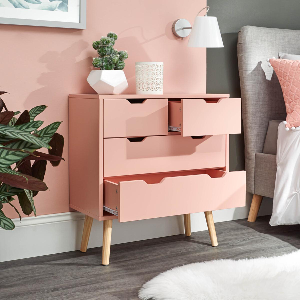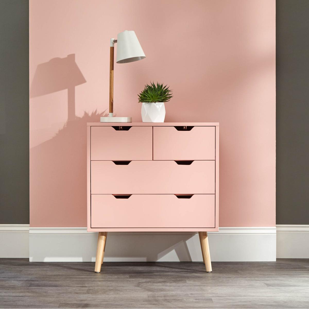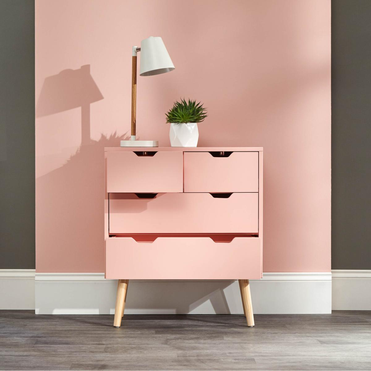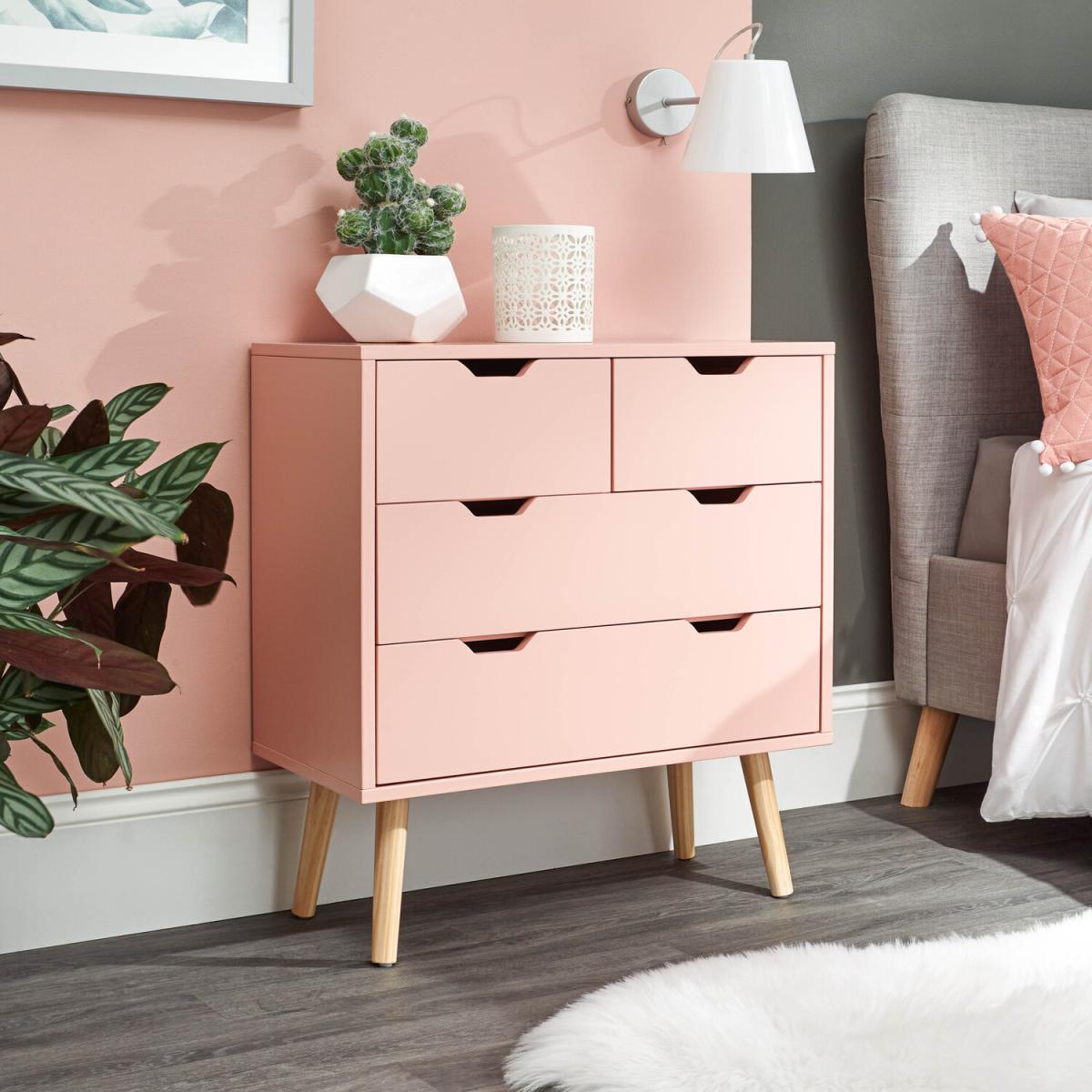Transform your bedroom with a classic 4-drawer chest in a modern Scandi design that's ideal for a style-conscious contemporary space. The simple construction offers two full-width and two half-width drawers, each with neat cut-out handles. The smooth painted finish is available in a selection of on-trend colours - including the new season's warm pink, soft green and ink blue shades - and mounted on slender mid-century-inspired pale-wood legs. A timeless choice.