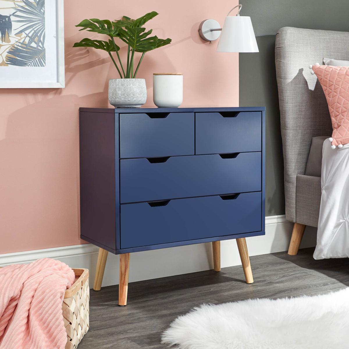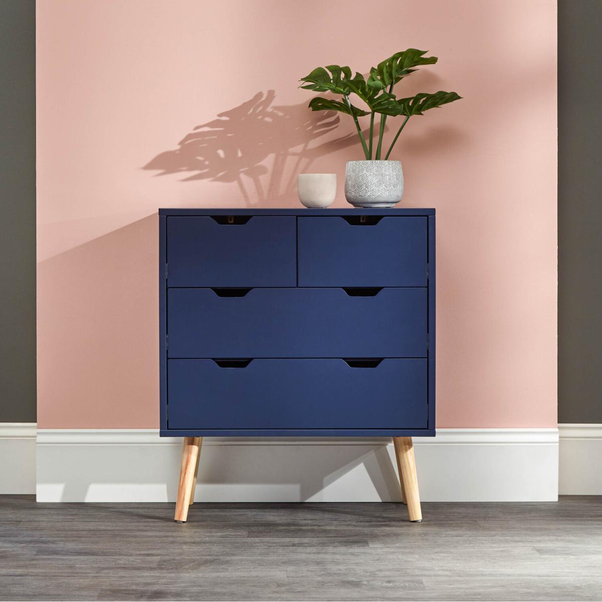 Transform your bedroom with a classic 4-drawer chest in a modern Scandi design that's ideal for a style-conscious contemporary space. The simple construction offers two full-width and two half-width drawers, each with neat cut-out handles. The smooth painted finish is available in a selection of on-trend colours - including the new season's warm pink, soft green and ink blue shades - and mounted on slender mid-century-inspired pale-wood legs. A timeless choice.
