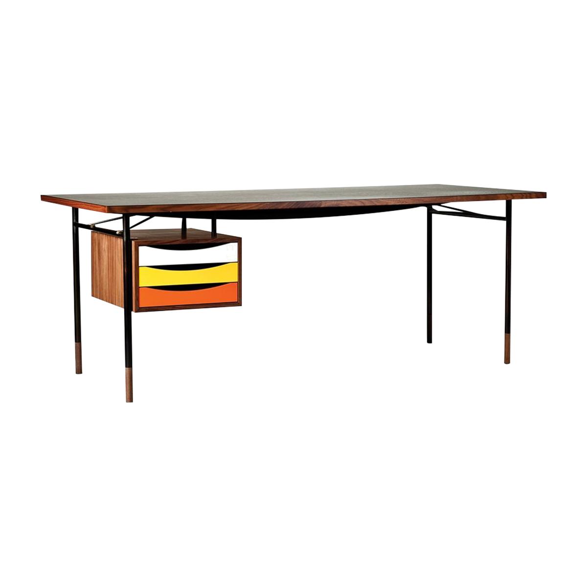 Finn Juhl, the master of Danish Modern, originally designed the iconic walnut Nyhavn Desk in 1945.Originally designed for his Copenhagen studio at the exclusive address of 33 Nyhavn, this elegant desk went on to shape the style of Finn Juhl's designs during the 1950s. With a sleek veneer walnut table top resting on black steel legs with feet finished in coordinating walnut, the Nyhavn Desk would lend a design edge to any workspace. Finished with three practical drawers in a warm spectrum of colours, the unit is mounted with brackets to further highlight the floating lightness of the desk. The first Danish furniture designer to achieve international recognition, Finn Juhl is seen by many as the master of Danish Modern. A self-taught designer, he originally studied to become an architect but worked with the mindset of a sculptor when creating his designs. Rather than thinking in terms of practicality, Finn Juhl broke free from the constraints of conventional working methods to create truly innovative designs.