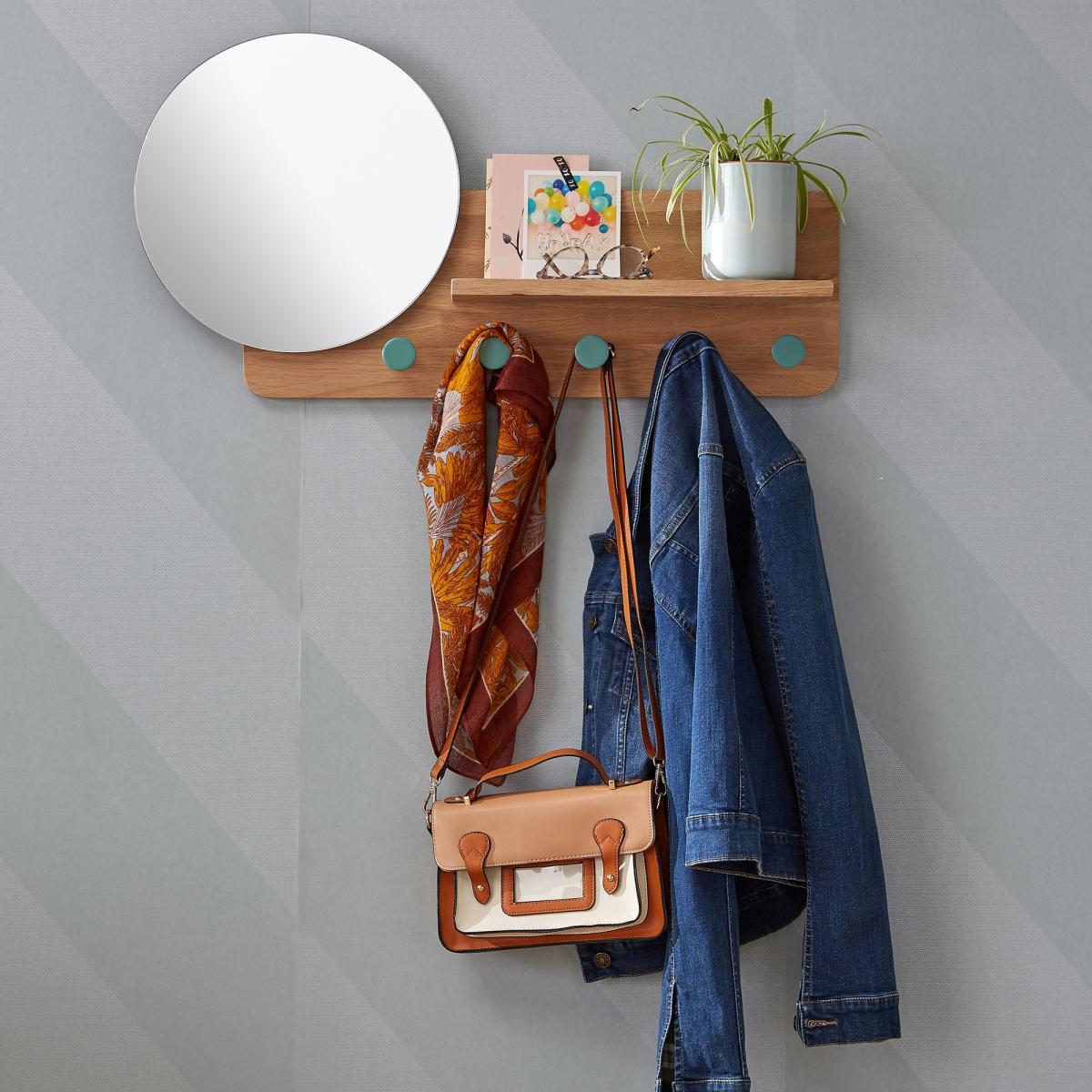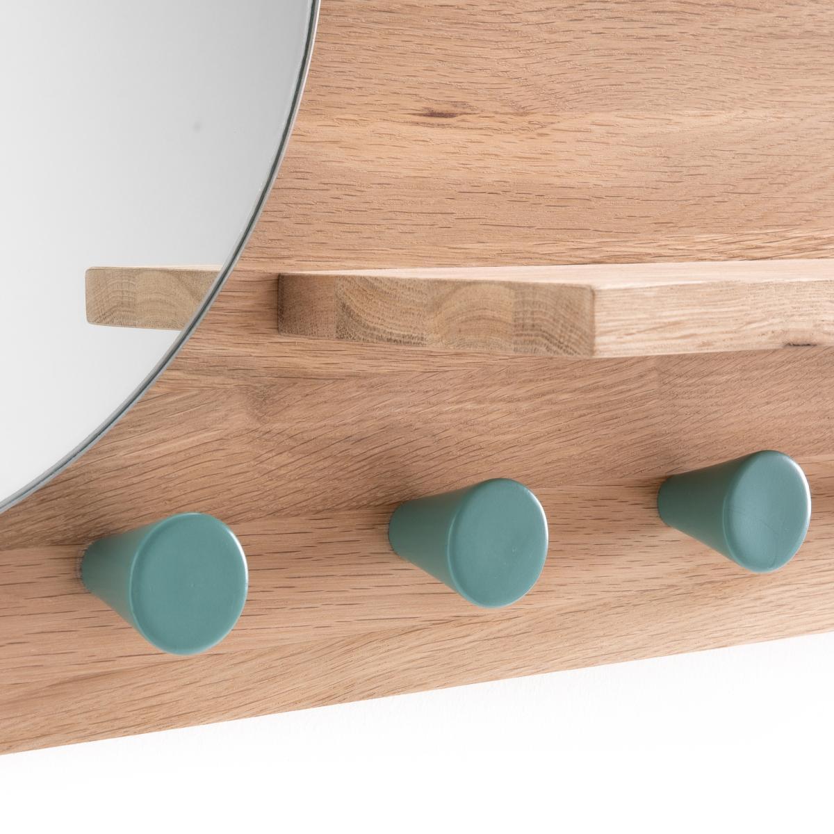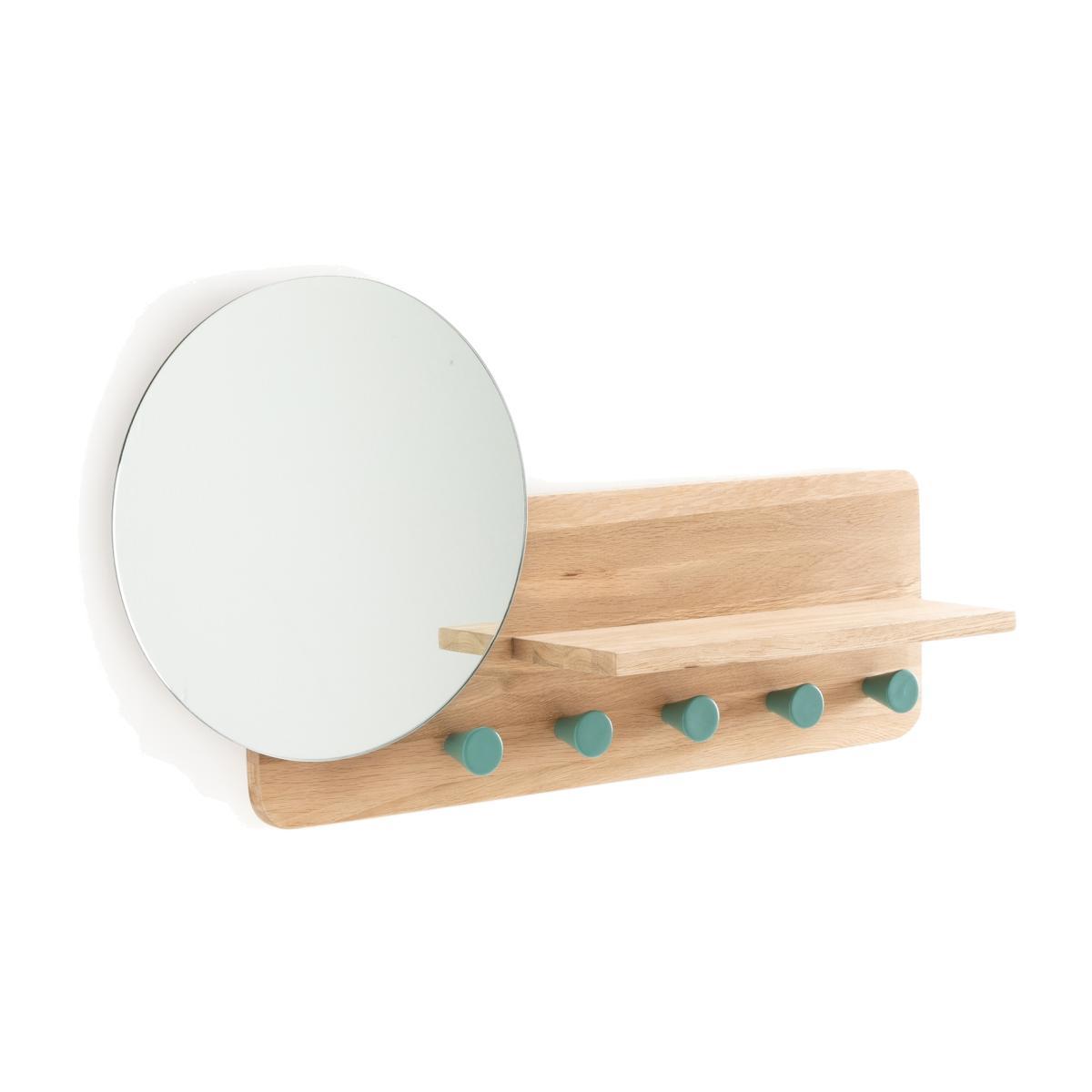 Inspired by Scandinavian design, this playful and practical coat rack will help you get everything ready as you leave the house or return home. Equipped with 5 pine-green tinted hooks, an integrated shelf and rounded mirror, it's ideal for hallways or bedrooms. Product details. 1 shelf. Main structure and integrated shelf in solid oak natural stained finish. 5 cone shaped pegs in green-tinted pine. 1 round mirror with integrated MDF support. Dimensions. Overall length: 76.5cm. Overall length: 40cm. Height without mirror: 46 cm. Depth: 14.8 cm Dimensions and weight of package. L73 x H7 x D42 cm, 5.2 kg Shop the full Nyjo collection online.
