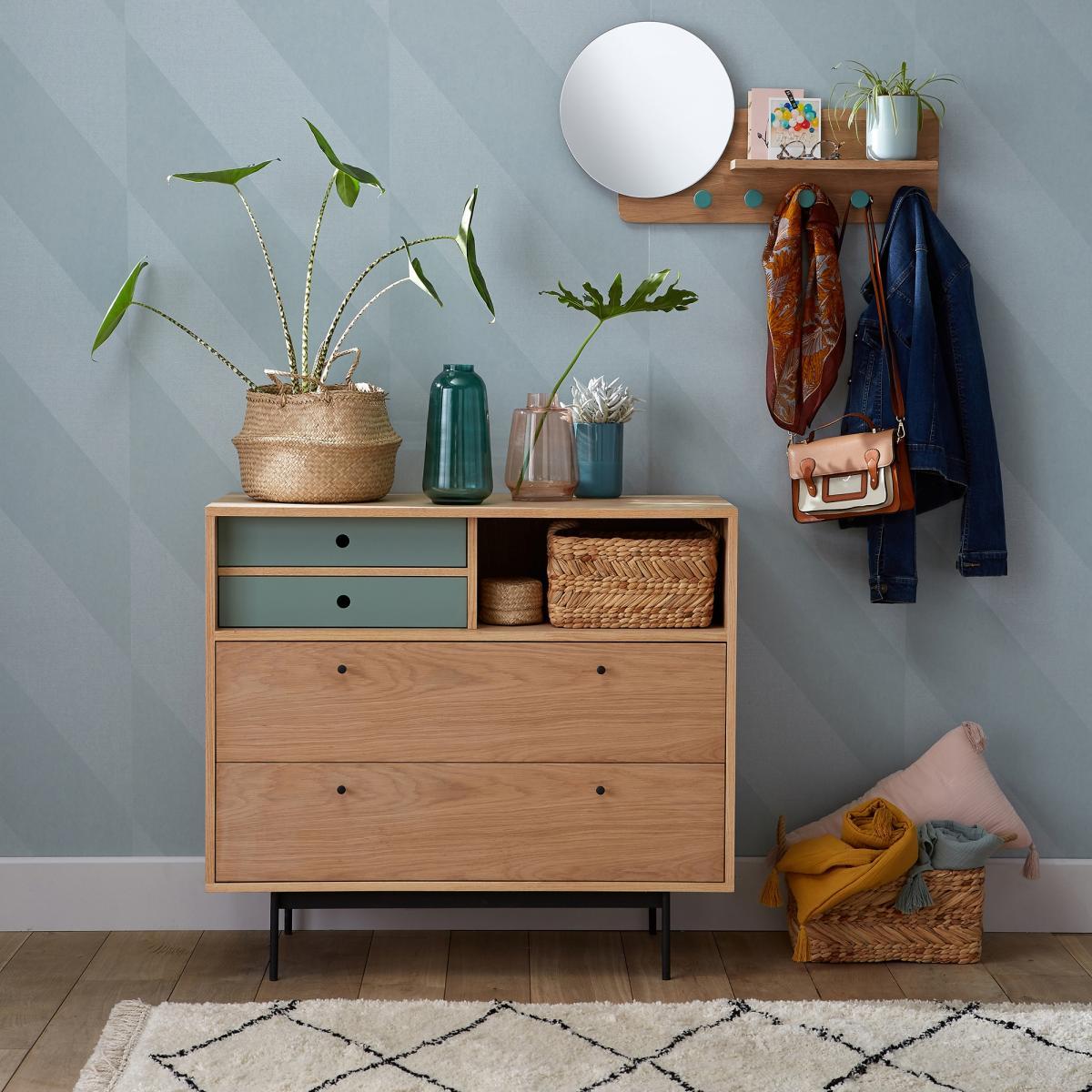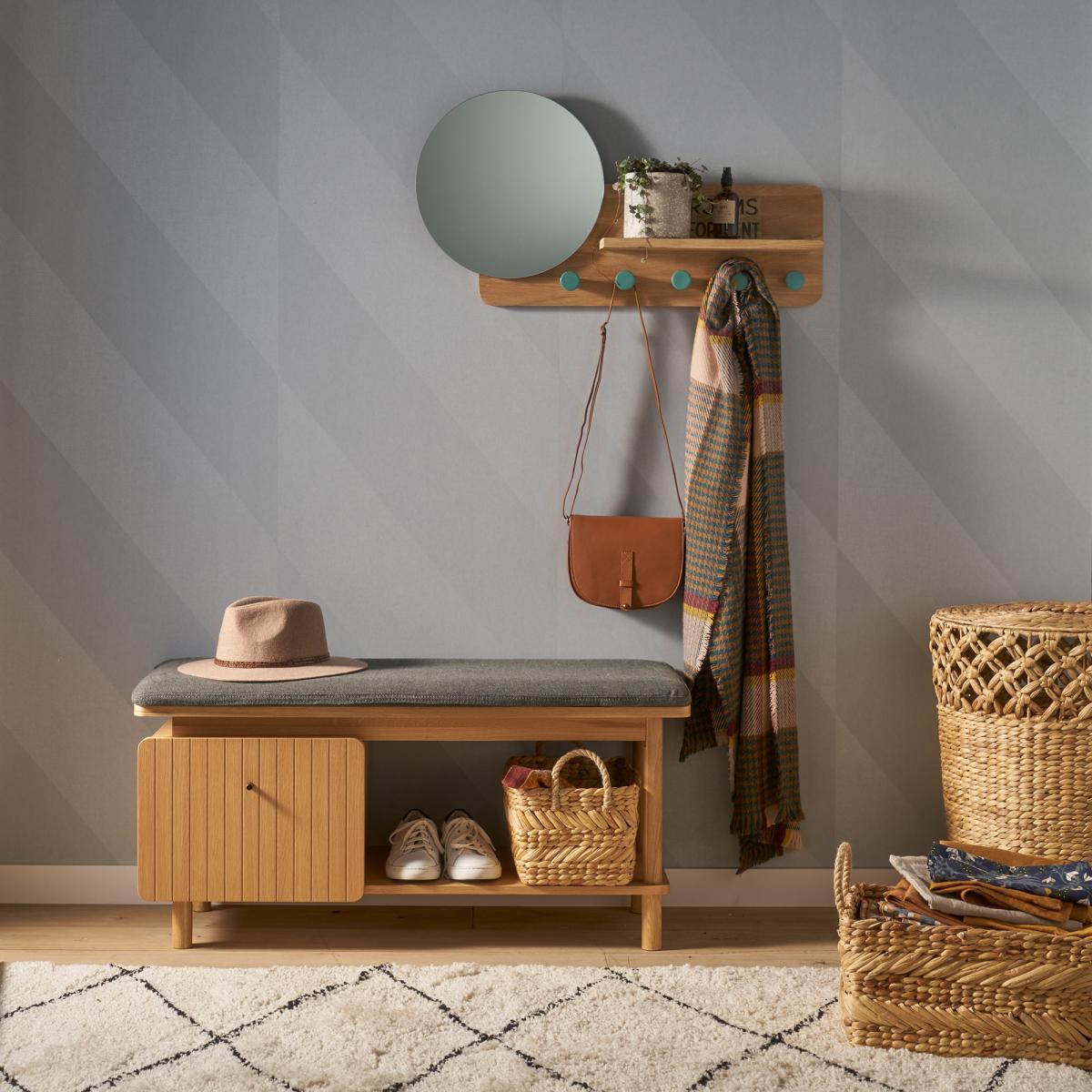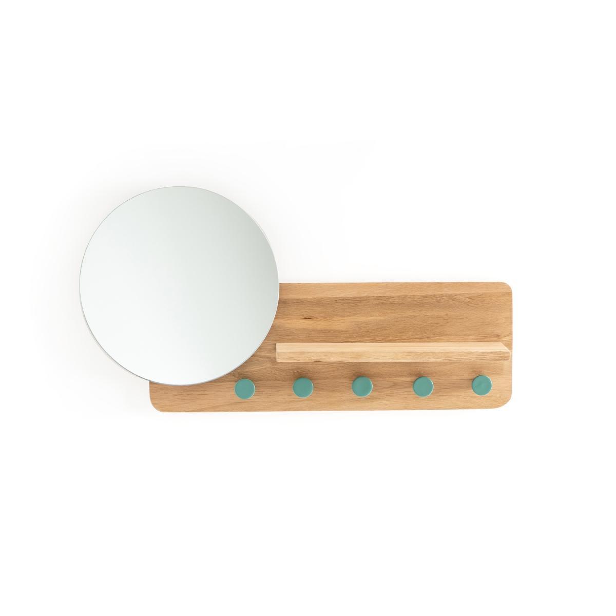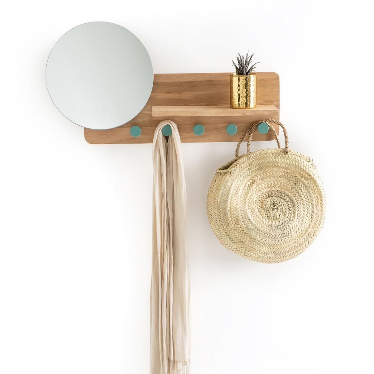 Inspired by Scandinavian design, this playful and practical coat rack will help you get everything ready as you leave the house or return home. Equipped with 5 pine-green tinted hooks, an integrated shelf and rounded mirror, it's ideal for hallways or bedrooms. Product details. 1 shelf. Main structure and integrated shelf in solid oak natural stained finish. 5 cone shaped pegs in green-tinted pine. 1 round mirror with integrated MDF support. Dimensions. Overall length: 76.5cm. Overall length: 40cm. Height without mirror: 46 cm. Depth: 14.8 cm Dimensions and weight of package. L73 x H7 x D42 cm, 5.2 kg Shop the full Nyjo collection online.