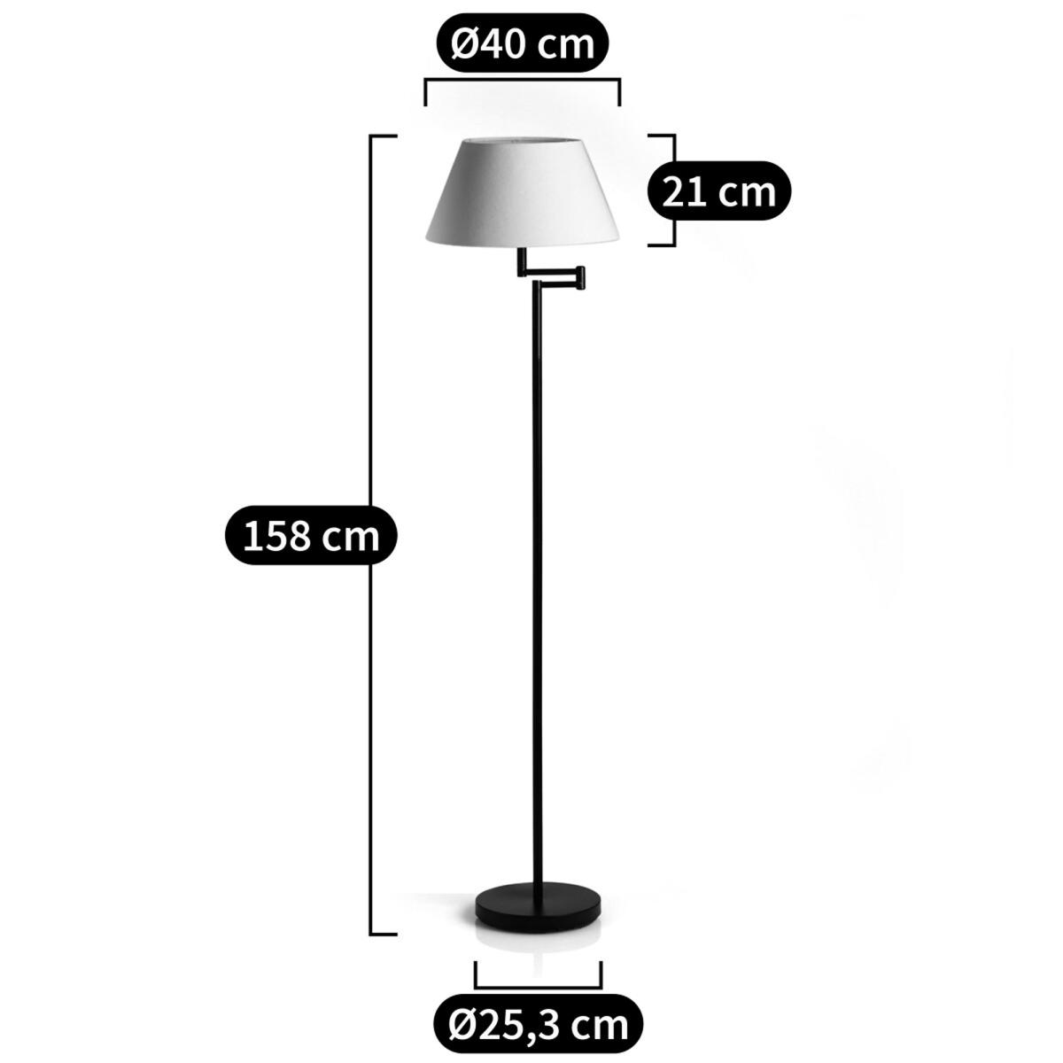 The Nyna Floor Lamp with Articulated Arm. With it's chic, modern and structured look, the Nyna floor lamp and its articulated arm bring character to your interior. Product Details •  Iron structure covered with epoxy paint •  Ecru cotton shade •  Round base •  Articulated arm •  E27 socket for 60W max bulb •  Compatible with energy saving bulbs classes: A-EDimensions •  Base : Diameter 25.3cm. Height 2.6cm •  Lampshade: Lower edge diameter 40cm, upper edge diameter 24.5cm. Height 21cm •  Total Height: 158cm Parcel dimensions and weight:  •  L43 x H38 x D43cm •  5kg