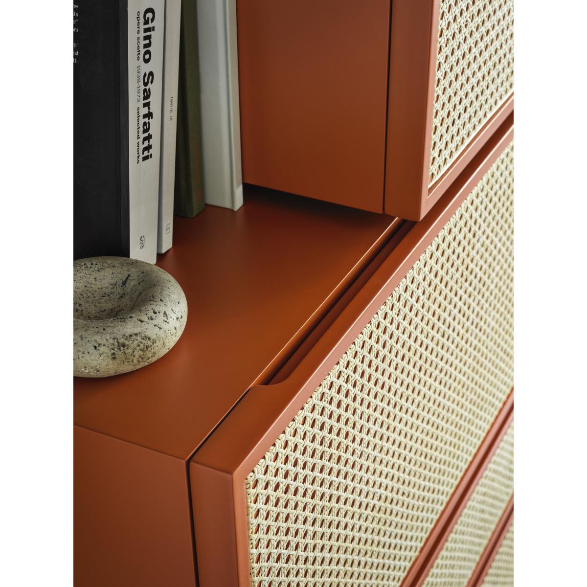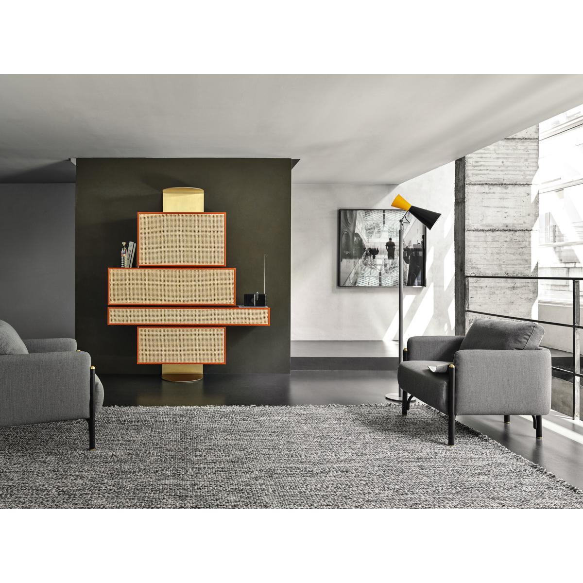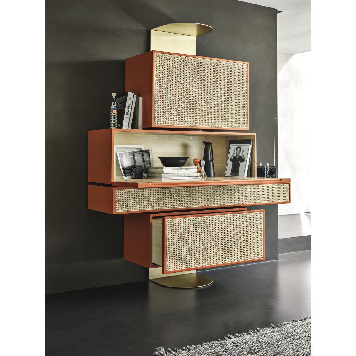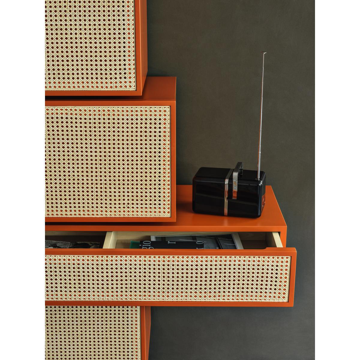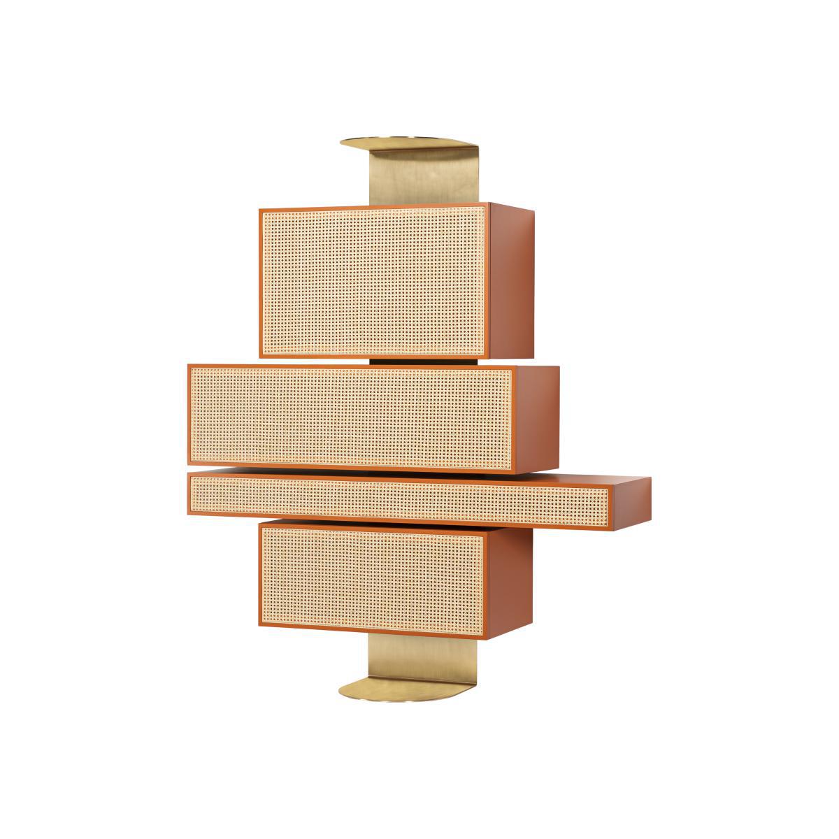 With its totemic core, the NYY UNIT piece finds its definition in the asymmetrical overlaying of geometric volumes suspended on a metal structure in brass with a satin finish. This incredible architectural installation of destructured volumes is a project with a shape-shifting character designed by the Storage Milano architecture and design studio. Within an interdependance of design, architecture and art, NYNY UNIT draws inspiration from both the stylistic features typical of postmodernism and the joyful graphics of the 1980s, accentuated by an intense chromatic selection. The architectural reference is also referred to in the name, NYNY, standing for New York, New York. The play on volumes in the NYNY UNIT are a tribute to the new museum of contemporary art, whose building develops the archetypal forms of the Babylonian ziggurats. The four modules combine wood lacquered with a bold orange and exceptional Vienna straw caning. Each module corresponds to a specific function: below, two drawers, one higher and one lower divided into 3 compartments. The drawers have a PUSH to open system. Above, two compartments with doors: one is a writing desk with a lifting door that can be used as a shelf or as a working surface. The other has a top-down opening door. By frankly asserting their modernity, the typical materials used by Gebrüder Thonet Vienna, namely steam-bent wood and Vienna straw, work together to use NYNY UNIT to create a piece of furniture with an intense emotional power, capable of making a statement with its presence in a space, like a main character. Rich materials, high standards of quality, exceptional finishes and an original form, all wonderfully characteristic of the Wiener GTV Design spirit. Drawing on the tradition and way of thinking of Michael Thonet, Wiener GTV Design develops products rooted in an innovative, meticulous design process. A team of designers, creators and artisans produces unique products of exceptional craftsmanship. Product sustainability is at the centre of the development process. Module dimensions detail (from top to bottom): - Module A: L 90 x H 55 cm x Depth 43 cm (door with top opening) - Module B: L 130 x H 38 cm x Depth 43 cm (lifting door) - Module C: L 165 x H 18 cm x Depth 43 cm (PUSH drawer 3 compartments) - Module D: L 90 x H 38 cm x Depth 43 cm (PUSH drawer).