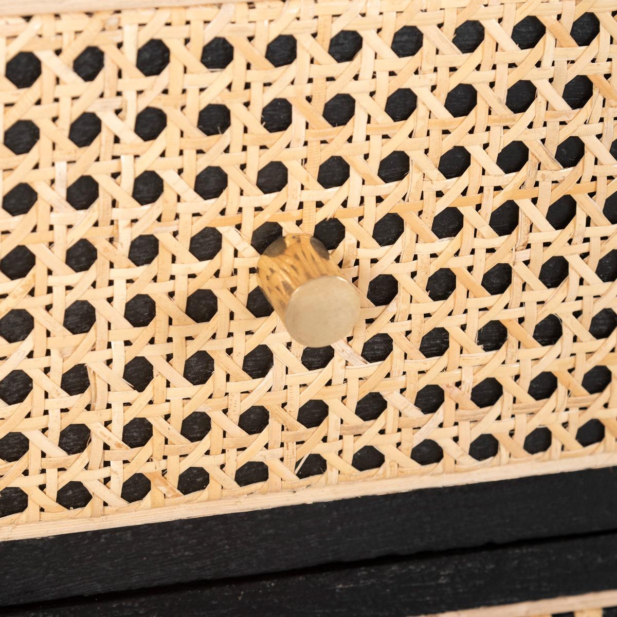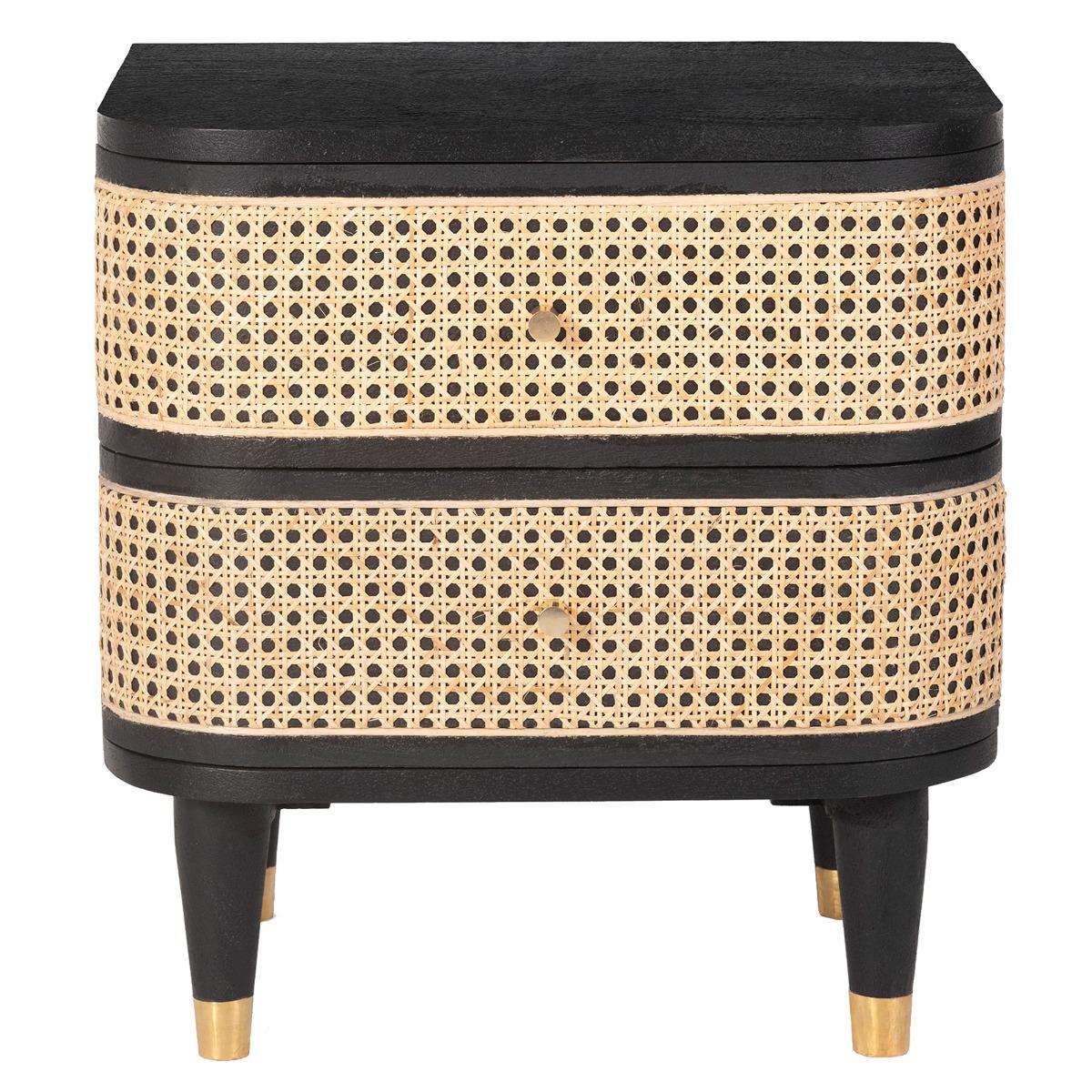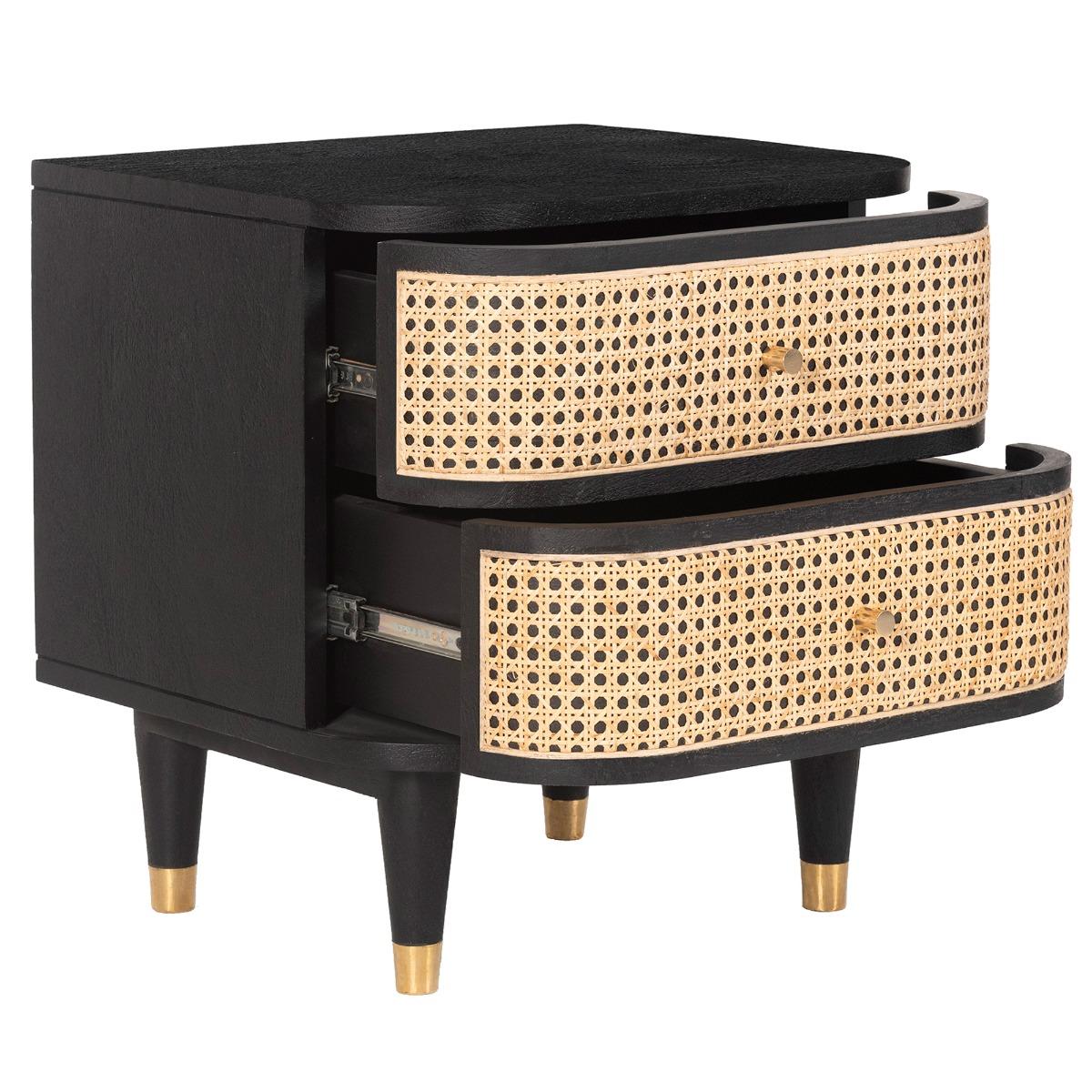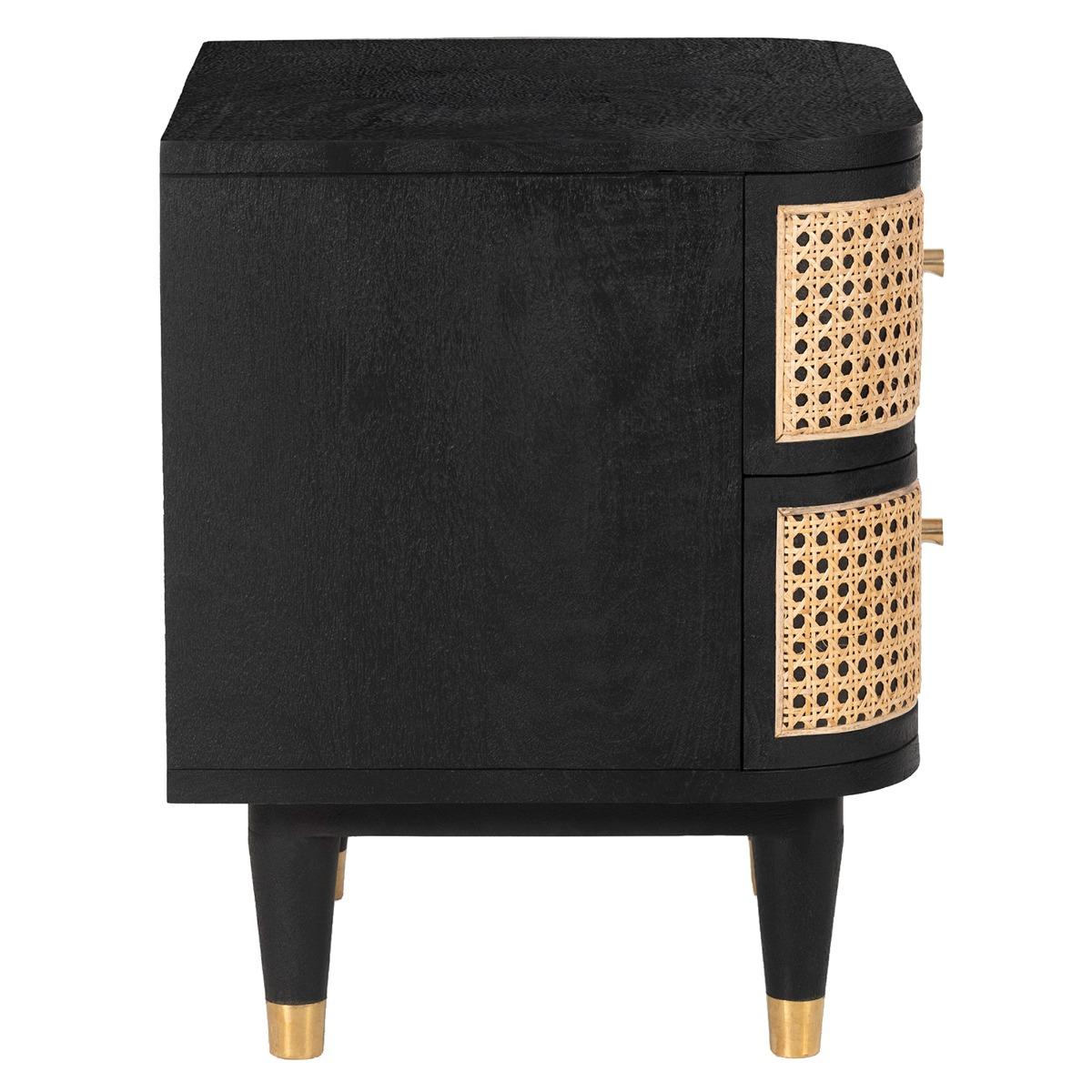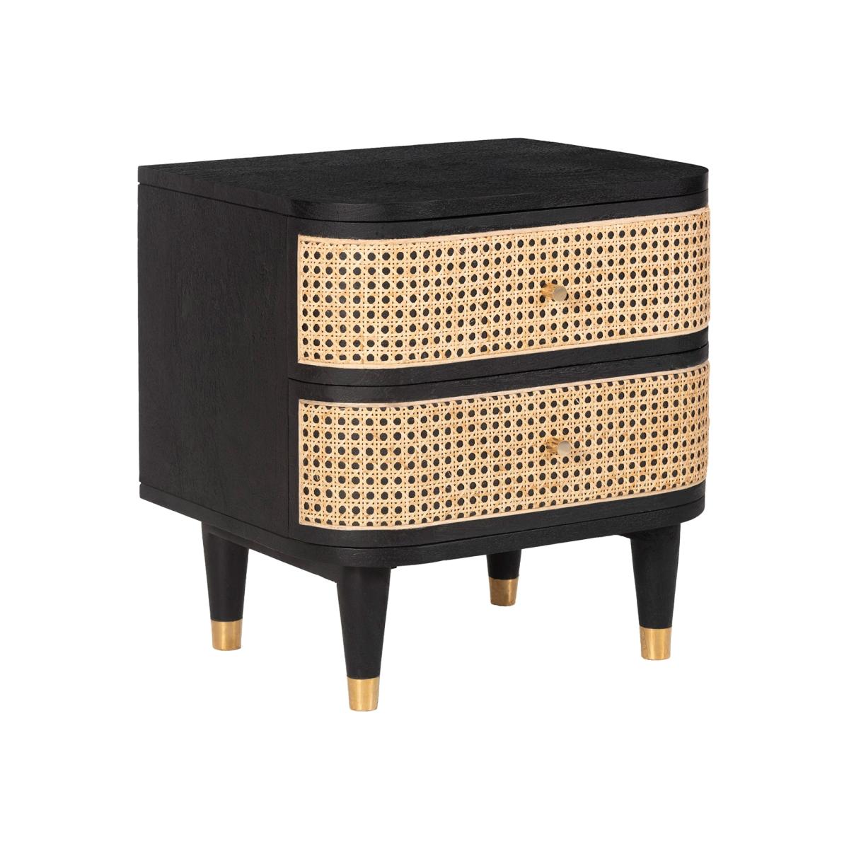 Boasting gracious curves and bang on trend, the Nyx 2 Drawer Rattan Bedside Table is everything you need in your bedroom to spruce things up. The sandblasted modern black mango wood contrasts beautifully with the traditional detailing of the rattan, and then completewith brass handles and feet caps for a contemporary finish. Featuring two spacious drawers, it also provides you with all your storage needs.