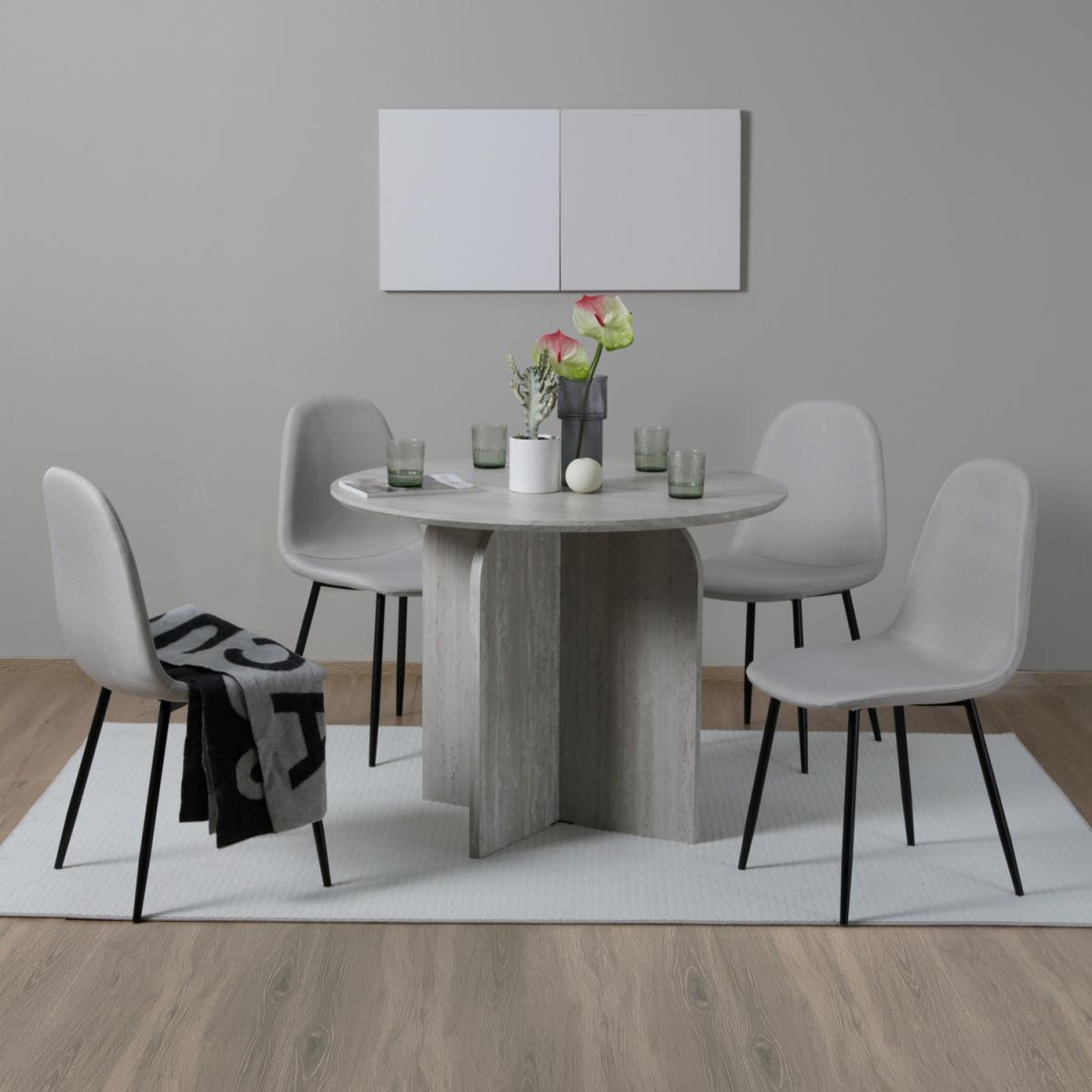 The Asteria & NYX Dining Set is a stylish and practical choice for everyday dining. Featuring a compact round table and four upholstered linen chairs, it's designed to fit seamlessly into kitchens, apartments, or cosy dining spaces. The NYX table has a durable melamine-laminated surface and comfortably seats up to four people, making it perfect for daily meals and small gatherings. Paired with the Asteria linen dining chairs, this set balances comfort with versatility. Each chair is crafted with a curved backrest, padded foam seat, and sturdy metal legs, providing both support and durability. Together, the table and chairs create a complete dining solution that is practical, long-lasting, and easy to style in a variety of interiors.