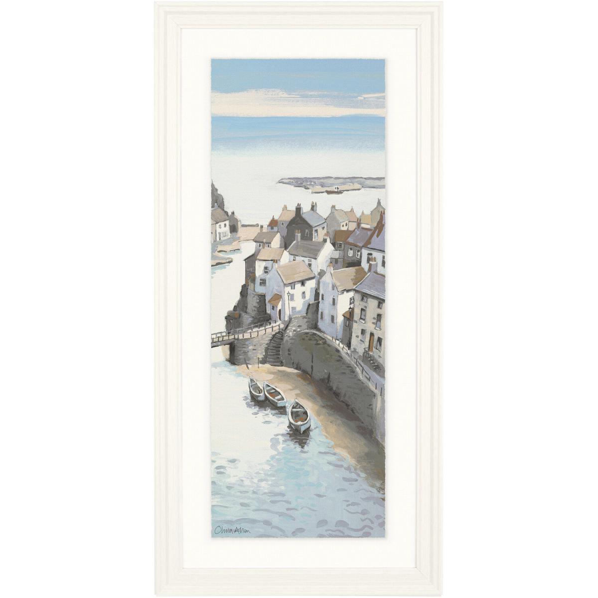 I love this coastal view print for its calming colour palette and timeless appeal. It works particularly well in relaxed, beach-inspired interiors or as a refreshing addition to more neutral schemes. This piece is versatile enough for living rooms, hallways, or even bedrooms, adding a sense of tranquility and light. Practical styling tips include pairing it with light wood frames or rustic accessories to enhance its seaside charm. It also looks great grouped with other marine-themed artwork or placed above a neutral sofa or console table to serve as a calming focal point.