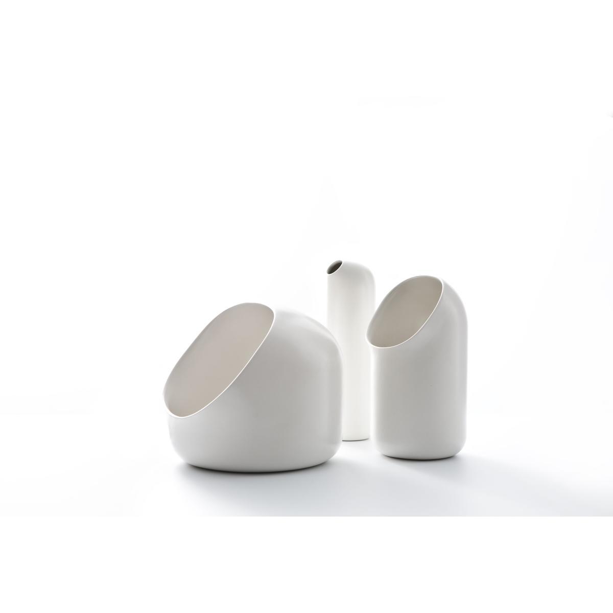 Ô is a family of accessories laade out of clay composed by a vase, a jug and a basket. As a trio of very expressive characters, together they seem to sing, scream their lungs out, chat. Stocky, slim or plump. Their morphology is very different but they are linked by a generous and strong look.