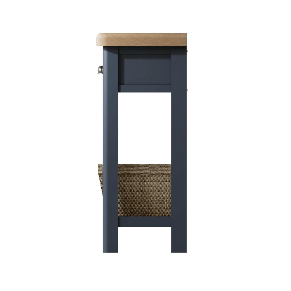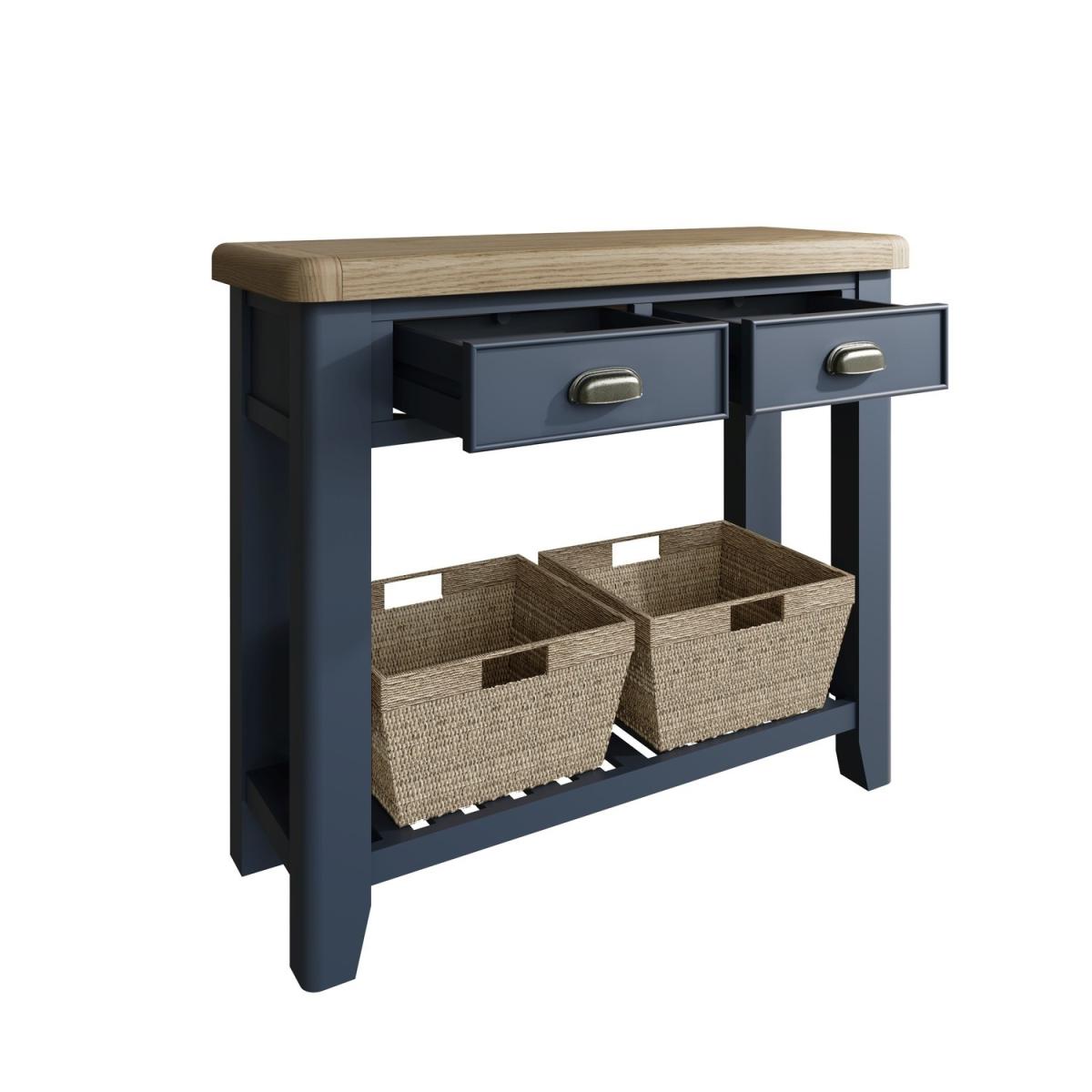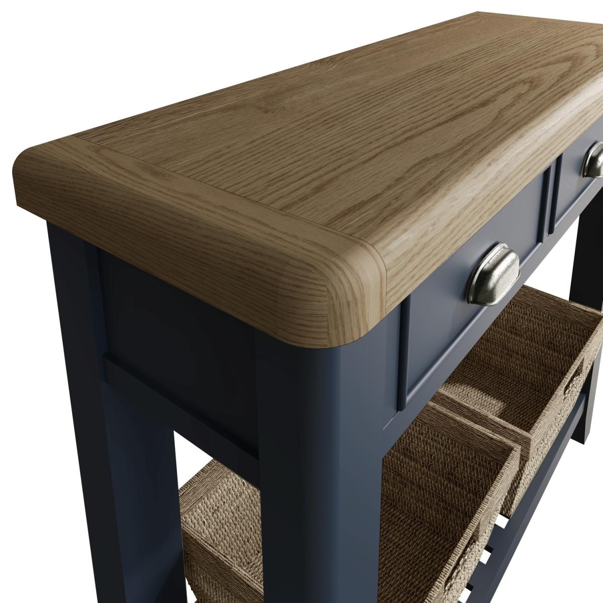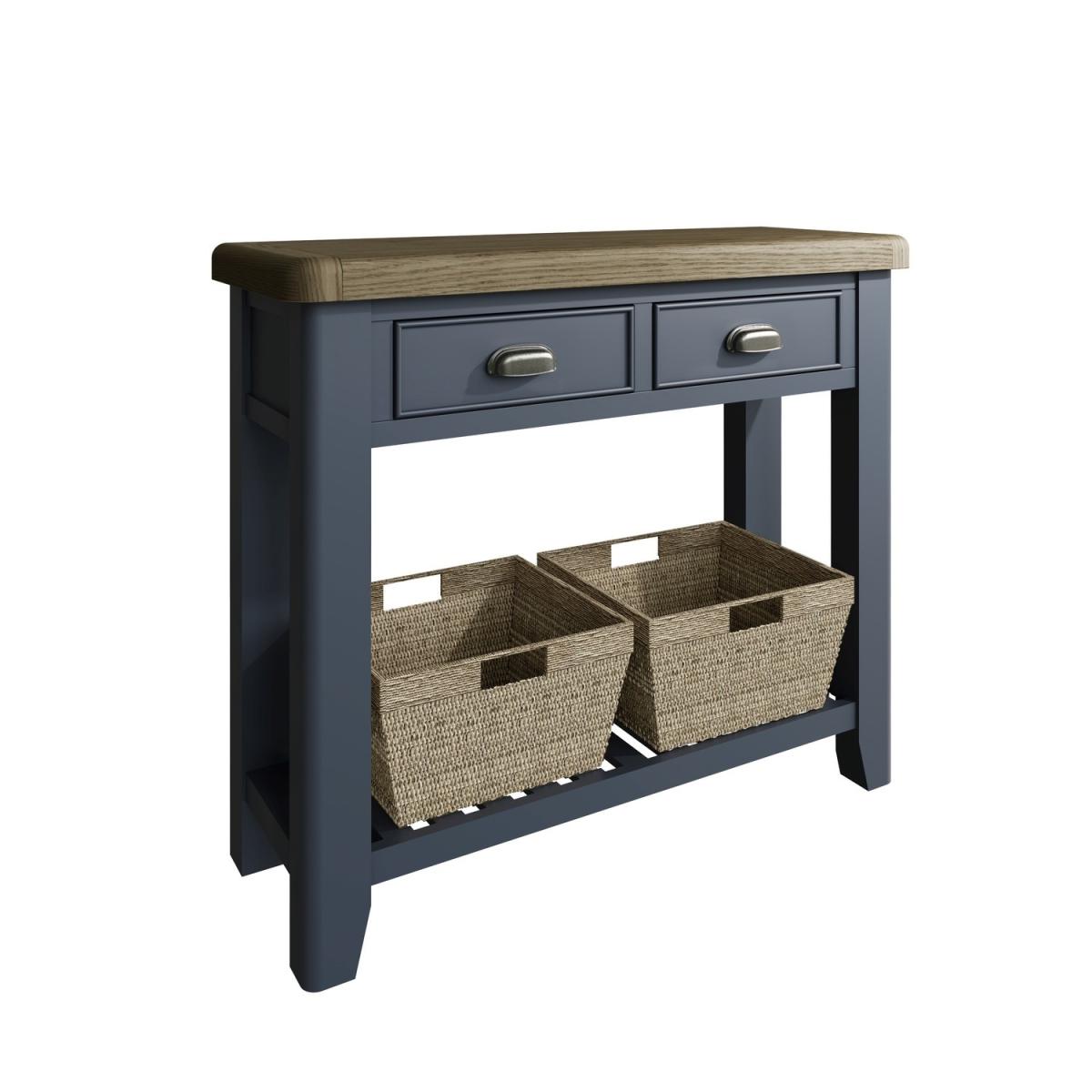 Oak & Blue Console Table with Wicker Baskets