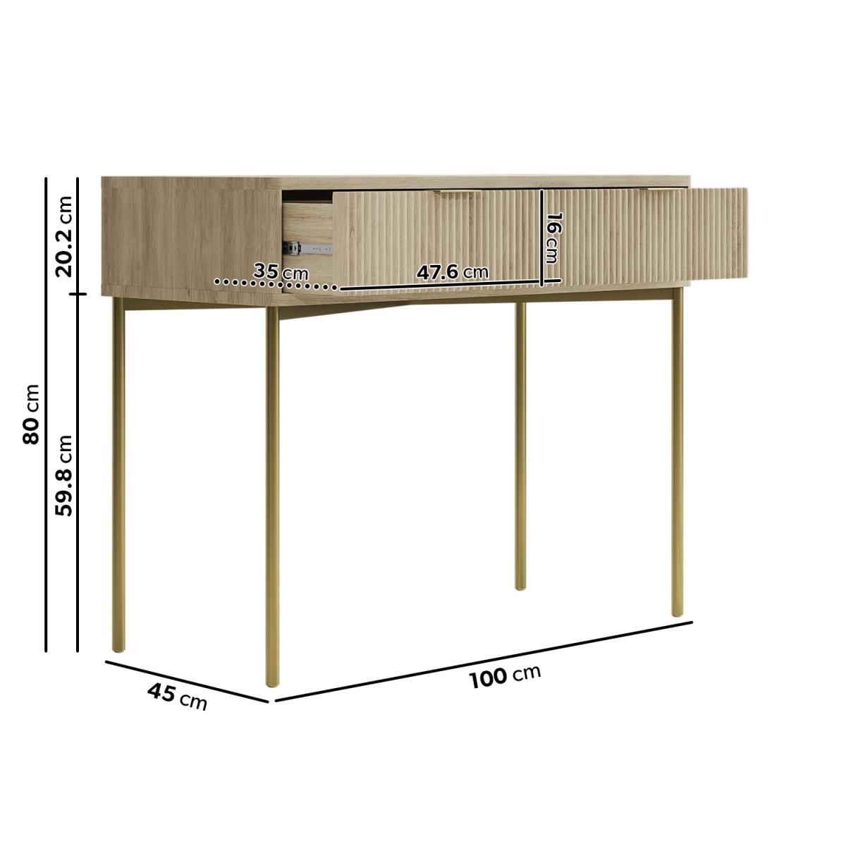 All about me Create your dream makeup station with the Valencia dressing table, featuring two drawers for storing cosmetics. The textured oak effect drawer fronts create a stunning modern finish in any bedroom or dressing room. Perfect the look with the matching pieces in the Valencia bedroom furniture collection. Need to know Dimensions:W100 x D45 x H80 cm Weight: 25 kg Drawer dimensions:W47.6 x D35 x H16 cm Number of drawers: 2 Colour: Natural wood Finish: Oak effect Material: MDF with foil finish Assembly required: Yes