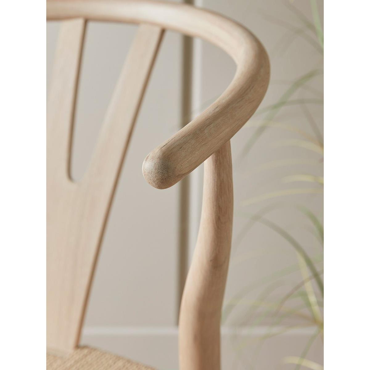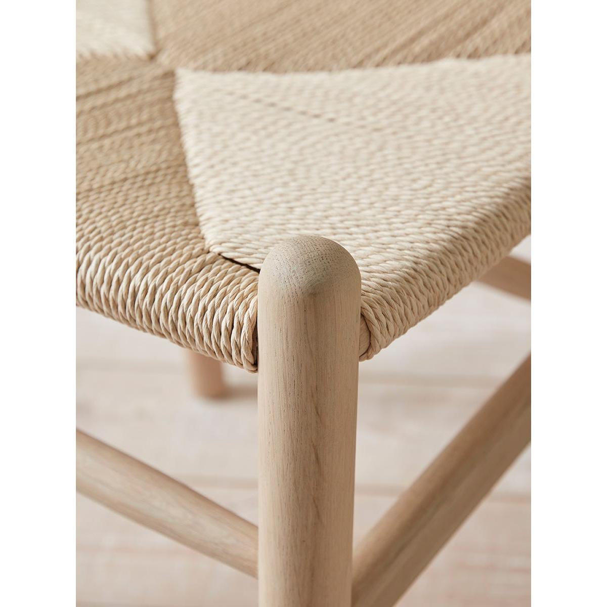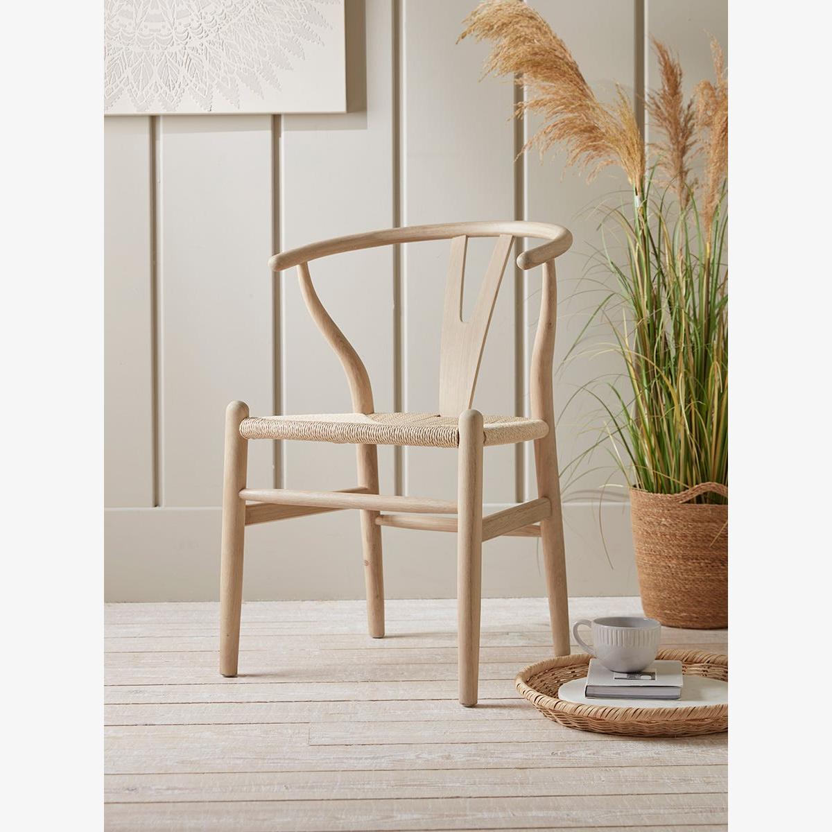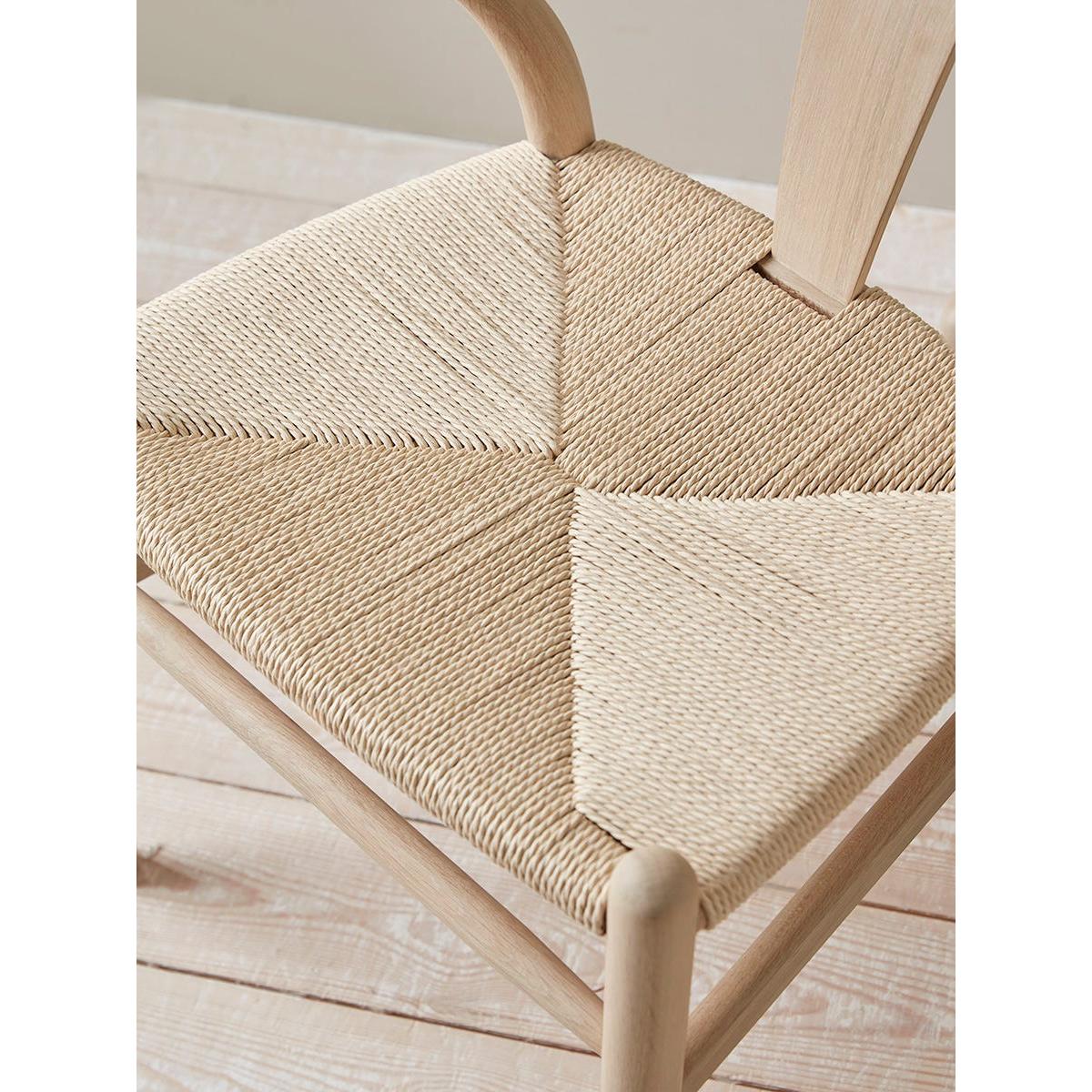 With a gentle blonde oak frame, this dining chair has a curved back for a stylish and comfortable design. In a similar tone, the rope seat sits in four triangular sections, creating further texture and interest in this bright and light chair.