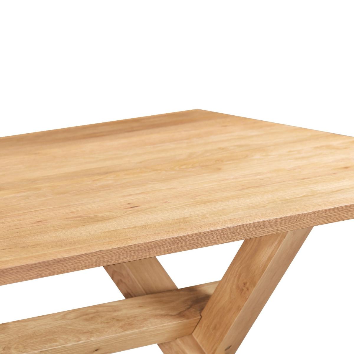 Extra large oak dining table with cross leg design Natural oak finish matches any interior Built to last with durable solid oak wood Modern solid oak carver dining chair Comfortable curved backrest and armrests for support Need to know Dining Table Information Finish:NC lacquered Material:Oak wood Assembly required: Yes Dining Chair Information Number of chairs: 8 Material: Oak wood and plywood veneer oak Finish: NC lacquered Assembly required: No Range: Anders