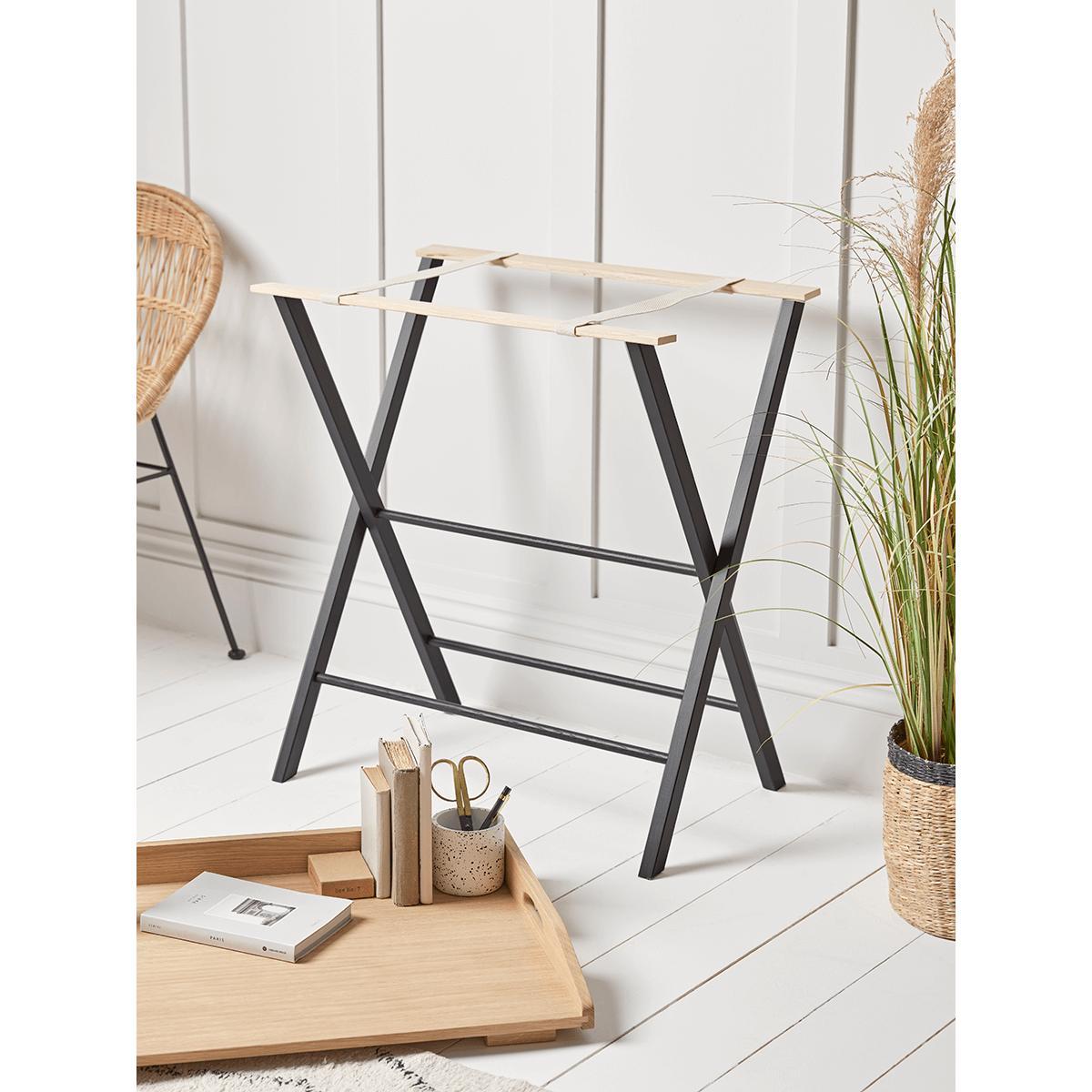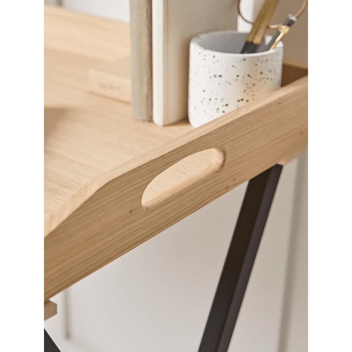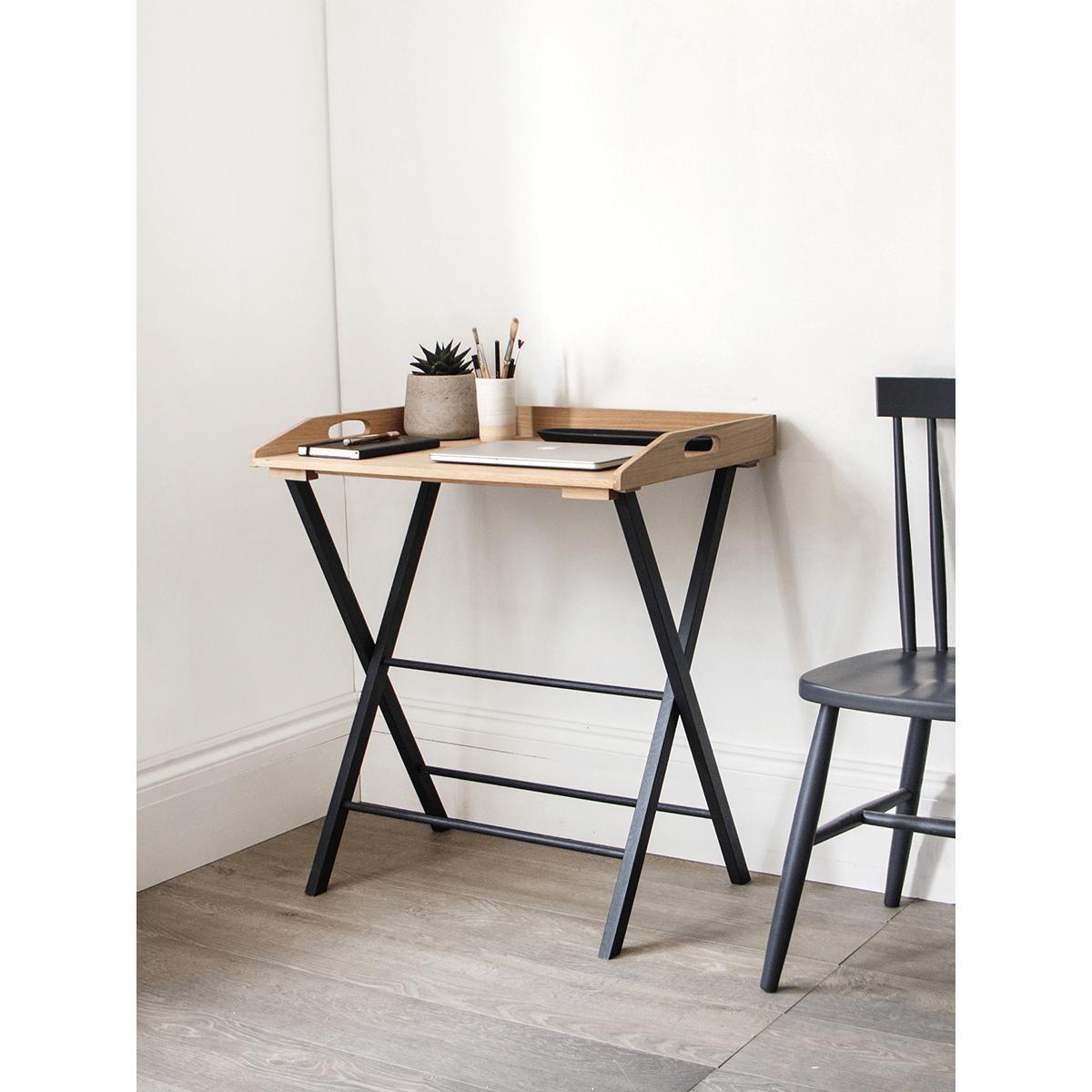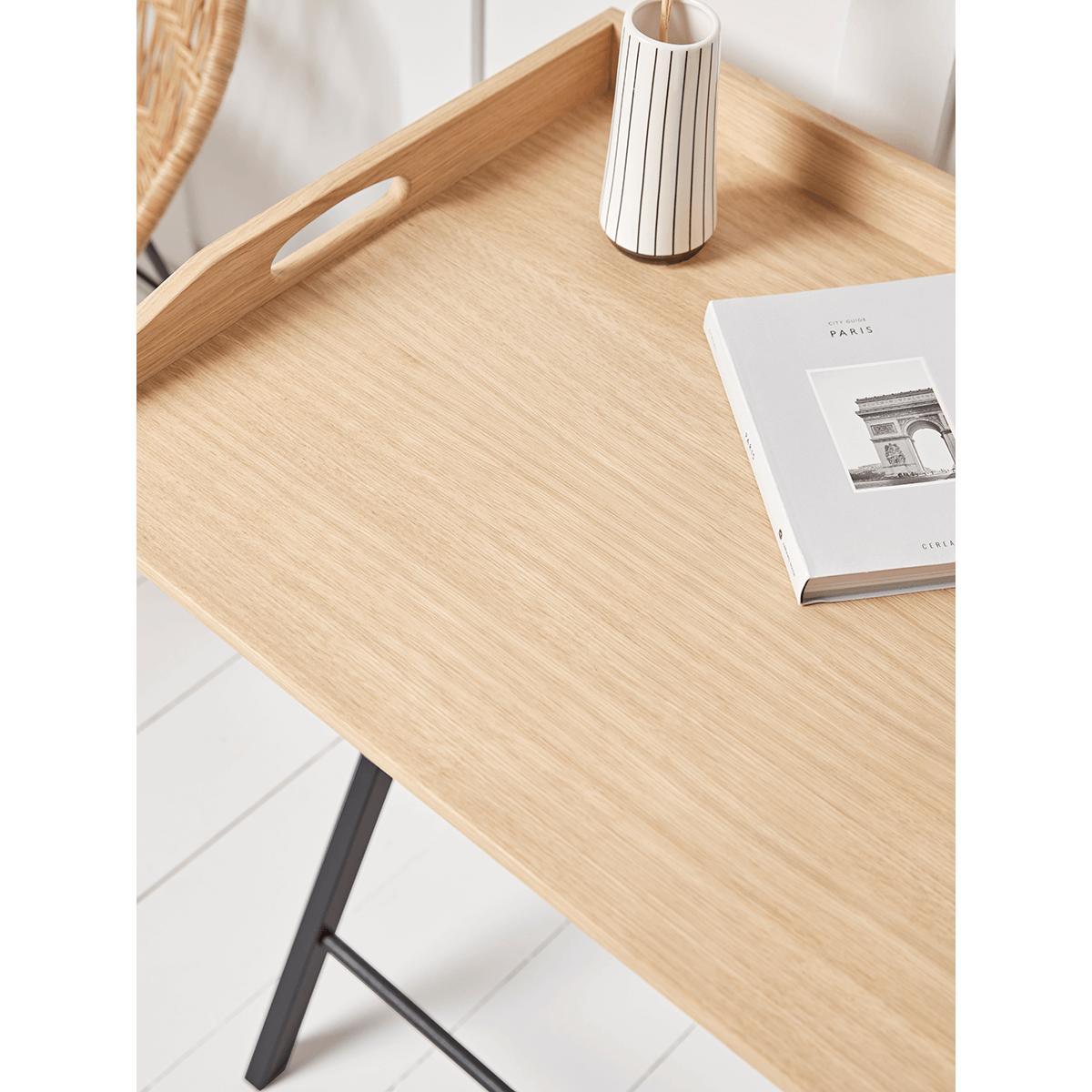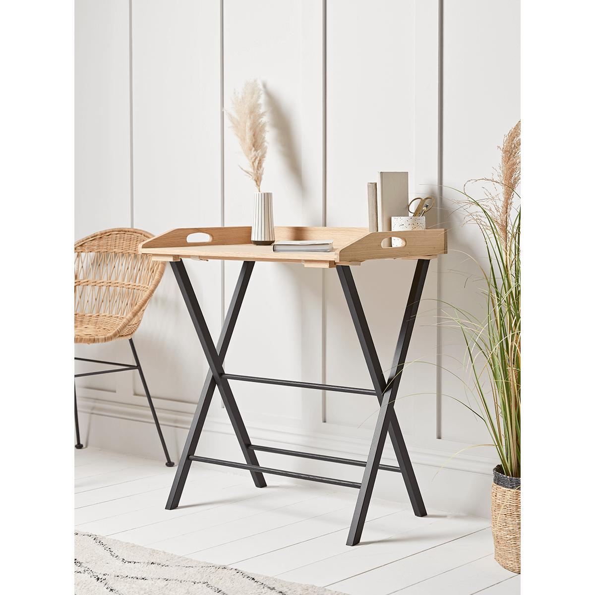 Crafted from solid oak and beech, this stylish and practical piece can be used as an attractive side table, or as a functional work station. The desk features a tray top with two handles, and anthracite grey folding legs legs.