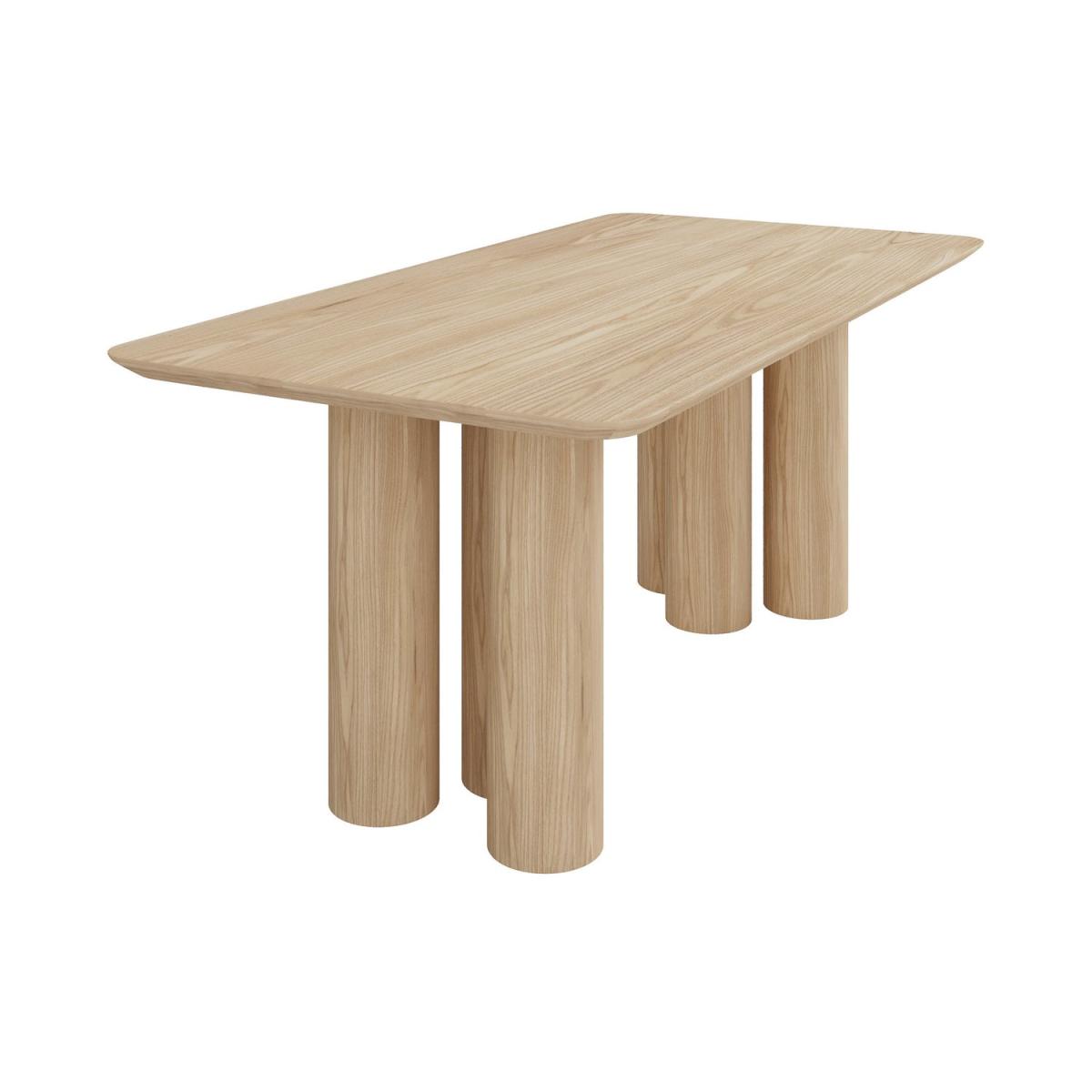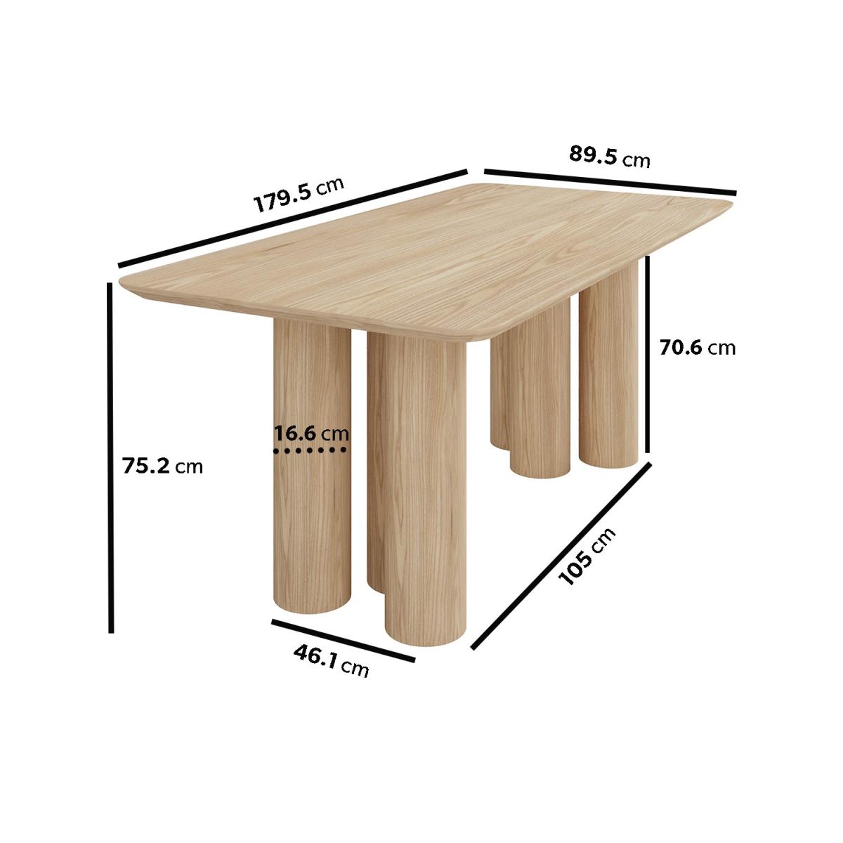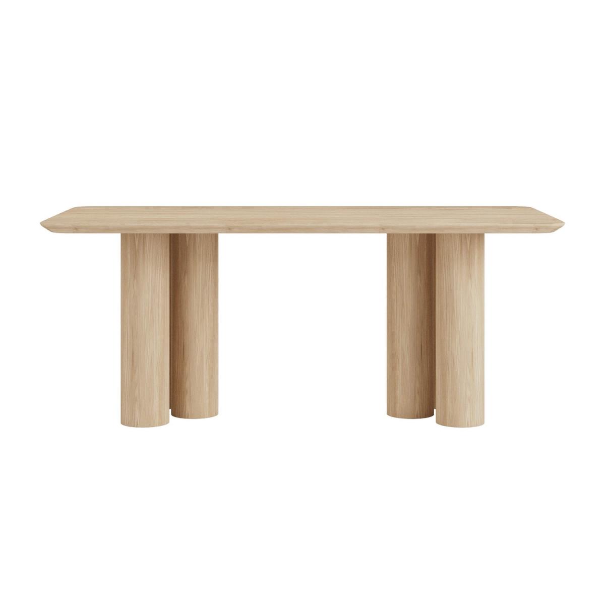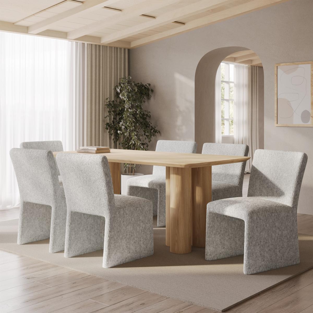 The Gianna dining table brings a refined sense of calm to your space with its pale light oak veneer and smooth, curved edges. It’s a modern look that still feels warm and welcoming. Thick, cylindrical legs wrapped in matching oak veneer give the table a grounded presence, turning a simple silhouette into a striking focal point in your dining area. The Lucie chairs are fully upholstered in a soft cream and grey chenille fabric, offering a plush, cosy seat and a subtle two-tone texture that adds visual depth while remaining versatile. With gentle curves and supportive padding, Lucie combines comfort and simplicity, perfect for everyday dining and long, relaxed meals. Designed to comfortably seat 6 people, the table provides room for meals, gatherings, and entertaining. The Gianna Dining Set is designed to bring style and practicality together, making it an ideal choice for modern homes. With its light oak veneer finish and bold, pillar-style legs, the Gianna table serves as a noticeable yet understated centrepiece, designed to complement a wide range of interiors. Whether you're hosting a party or enjoying a quiet morning coffee, its sturdy build and elegant form offer lasting style and everyday comfort. Paired with the Lucie chairs, the set balances structure with softness. Fully upholstered in a cream and grey chenille fabric, Lucie offers a cosy seat and a touch of refined texture. The neutral palette and streamlined silhouette make it effortlessly versatile, enhancing the table’s light wood tones while maintaining a clean, modern aesthetic. Together, Gianna and Lucie create a dining experience that feels thoughtfully curated, one that’s as suited to special occasions as it is to daily life.