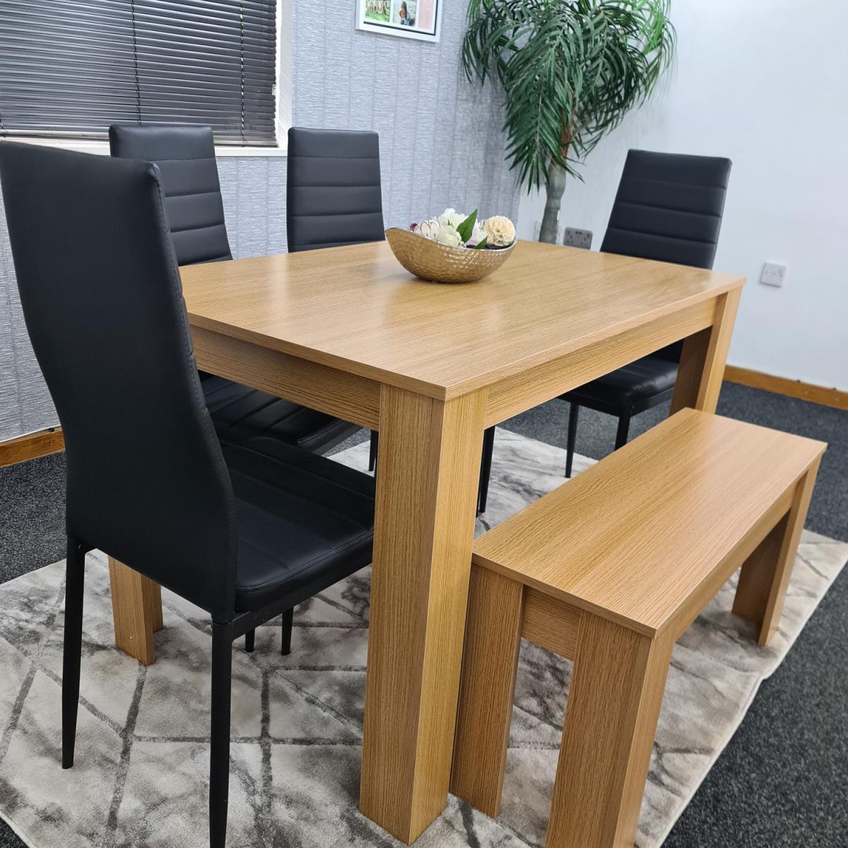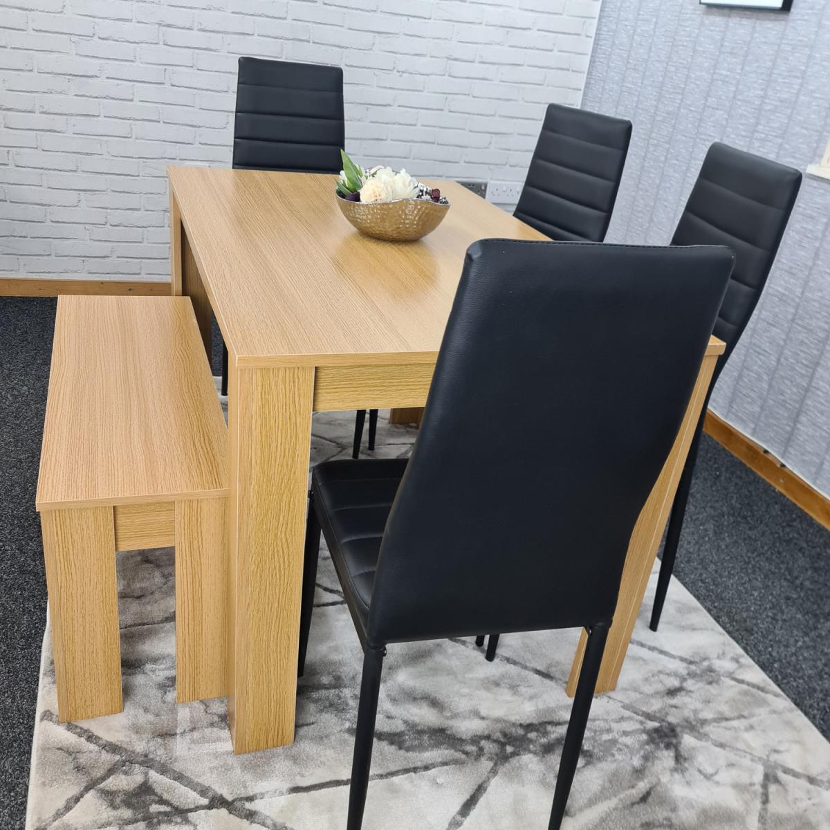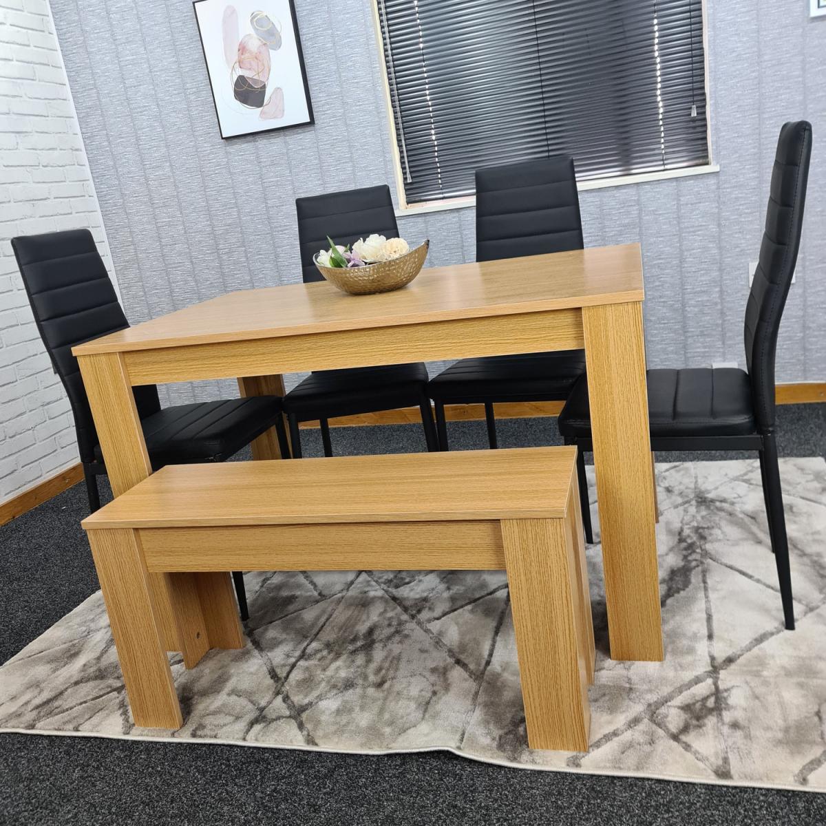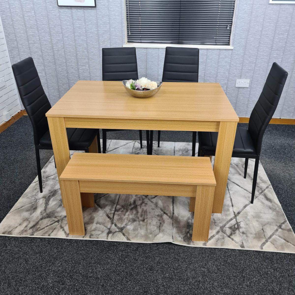 The dining table set comprises 1 dining table with 4 Black PU faux leather metal dining chairs and 1 bench. Transform brighten your dining area with this stunning, contemporary dining table with 4 stylish, black comfy faux leather metal chairs and a bench. All our chairs meet fire resistance standards. The table is made from wood (oak effect) and has a melamine laminated light oak natural wood grain finish which looks great and is easy to wipe clean. The item comes flat packed and requires some home assembly.
