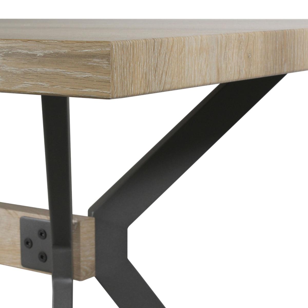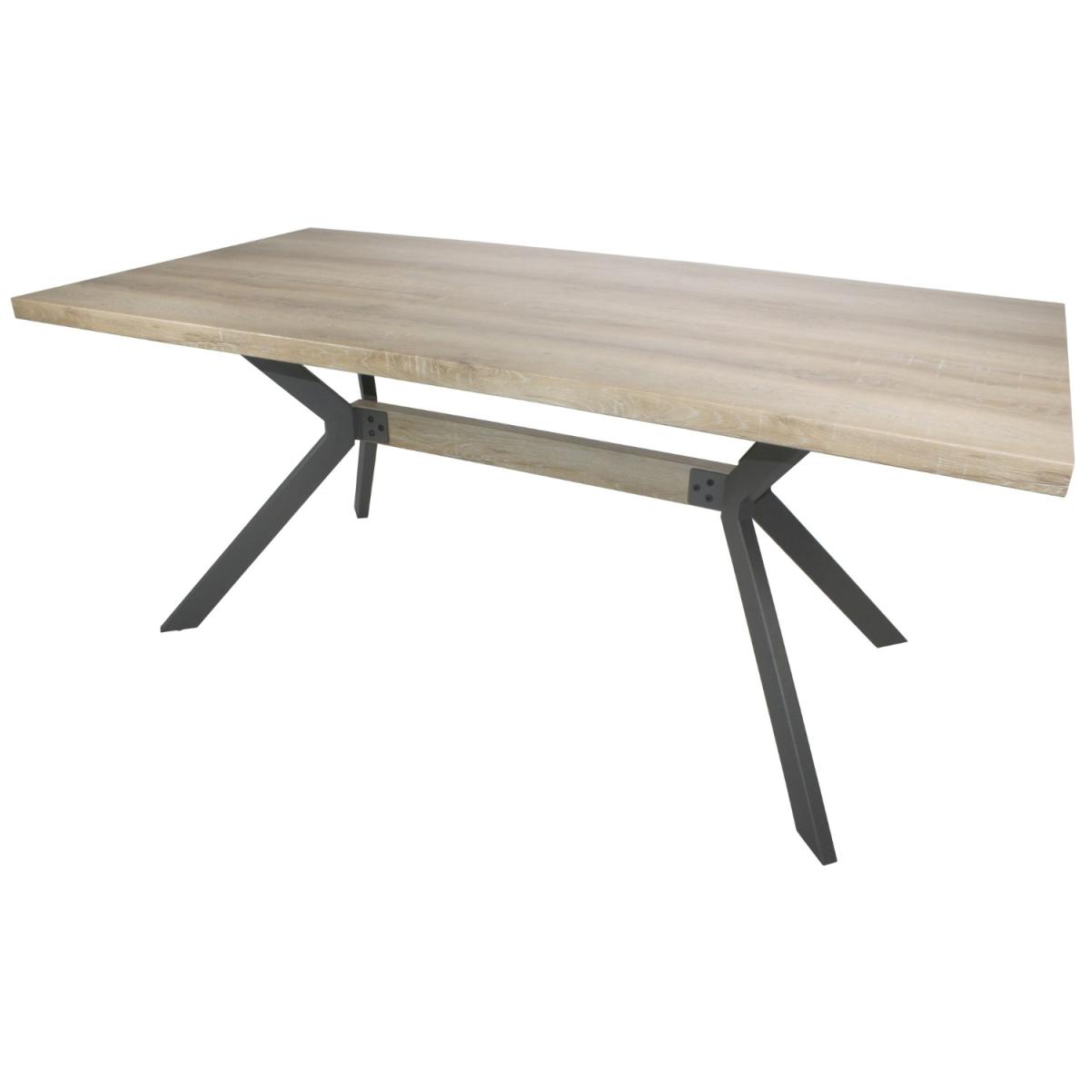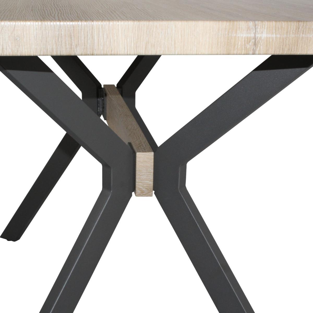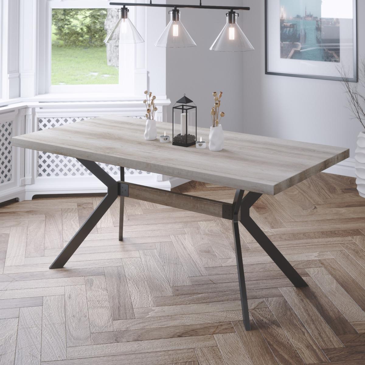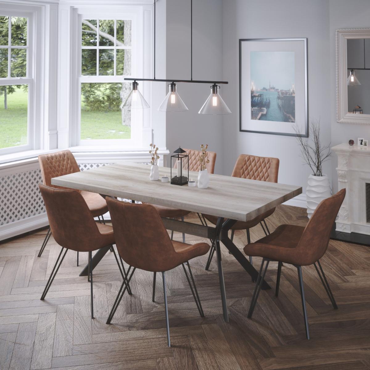 Dimensions:Table:H76 x W180 x D90 cm Chair:H87 x W58 x D63 cm A mixture of wood effect and steel creates an industrial look with this modern dining set. Features: Modern industrial design Powder coated legs on the table and chairs for durability Cross hatch stitching detail on chairs Sturdy double-angled legs Easy assembly