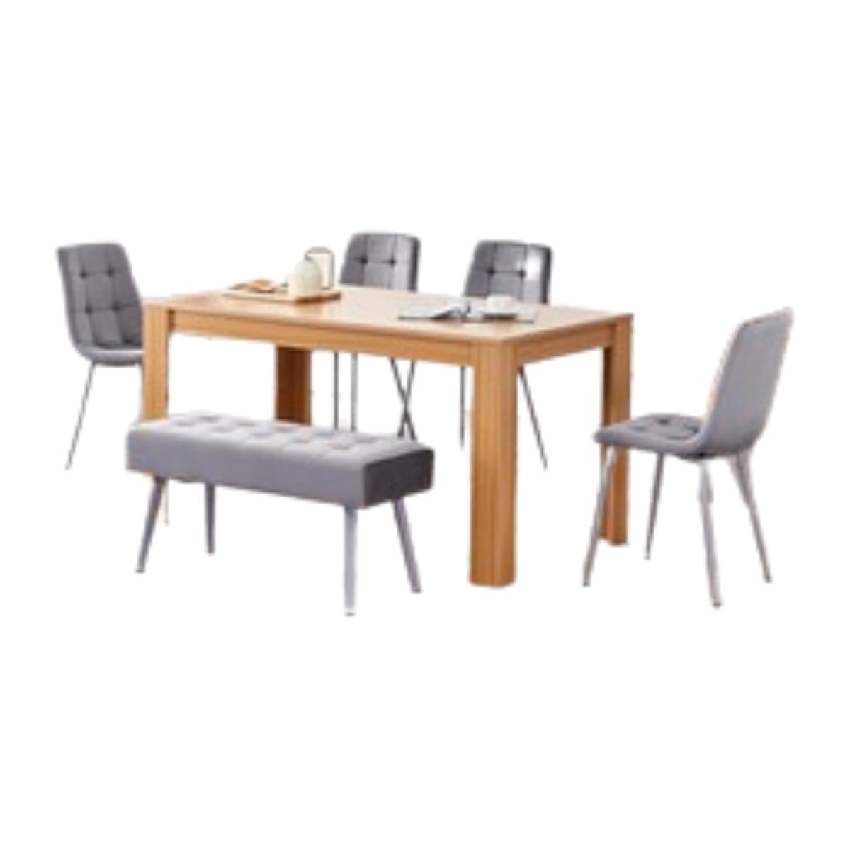 Dining Set features a stylish beige MDF table with a light oak natural wood grain finish, paired with four elegant grey velvet chairs and a matching bench. The chairs and bench boast soft velvet upholstery, stylish stitching, and sturdy metal legs with adjustable foot protection. Easy assembly with clear instructions included.