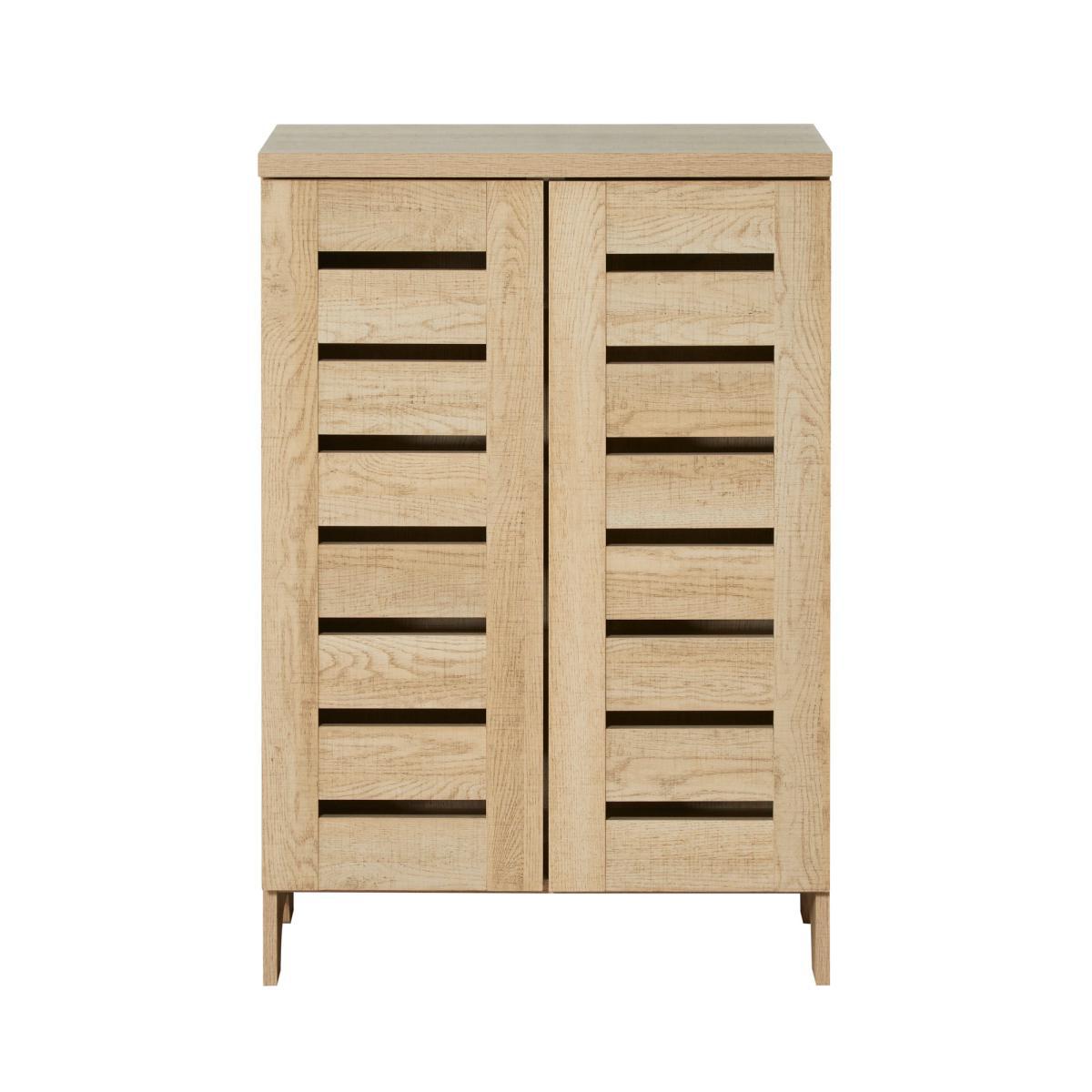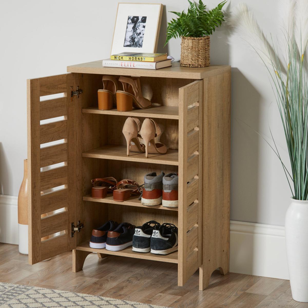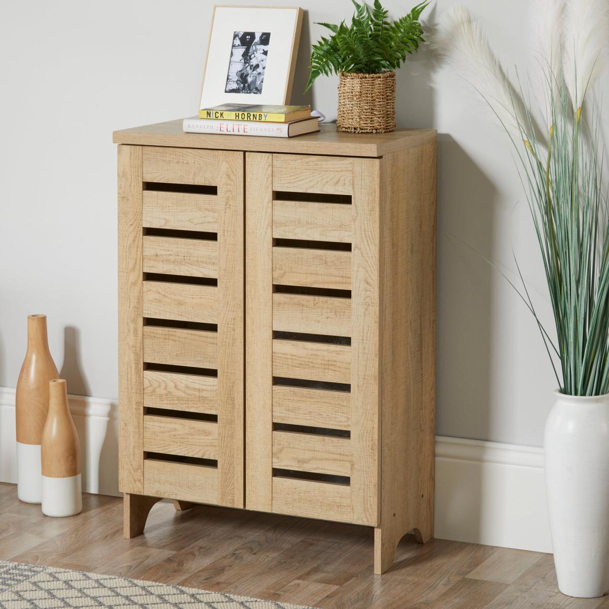 I love this oak effect shoe cabinet because of its clean, natural look that enhances a variety of interiors, from modern minimalist to rustic or coastal styles. Its compact design makes it ideal for creating storage without cluttering the space, and the slatted doors add subtle visual interest while allowing any excess moisture to escape, helping to keep shoes in better condition. Practical styling tips include placing it near the entrance for easy access or pairing it with woven baskets and neutral-toned décor to maintain a calm, cohesive look. It works particularly well in neutral or light-filled hallways looking for functional storage that doesn’t compromise style.