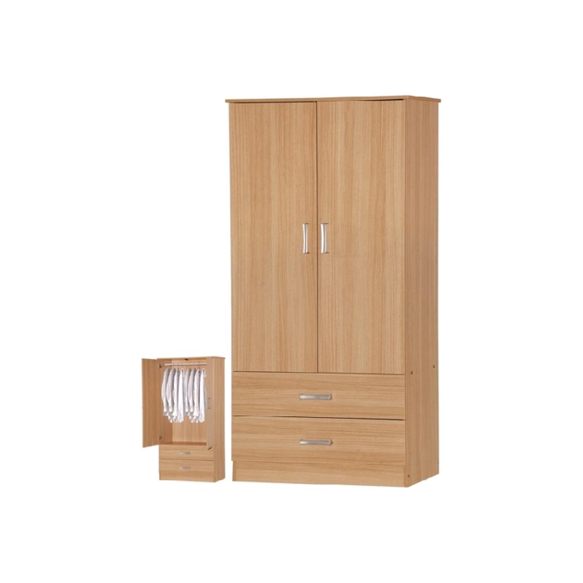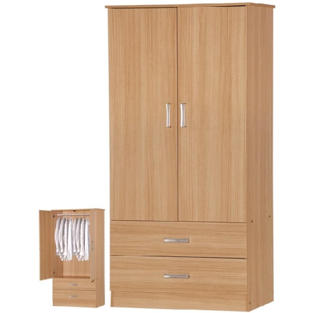 This 2 doors wardrobe/tallboy with 2 drawer storage at the bottom has a stylish oak effect finish. The wardrobe has a hanging rail inside with 2 drawers at the bottom finished off with silver effect handles.