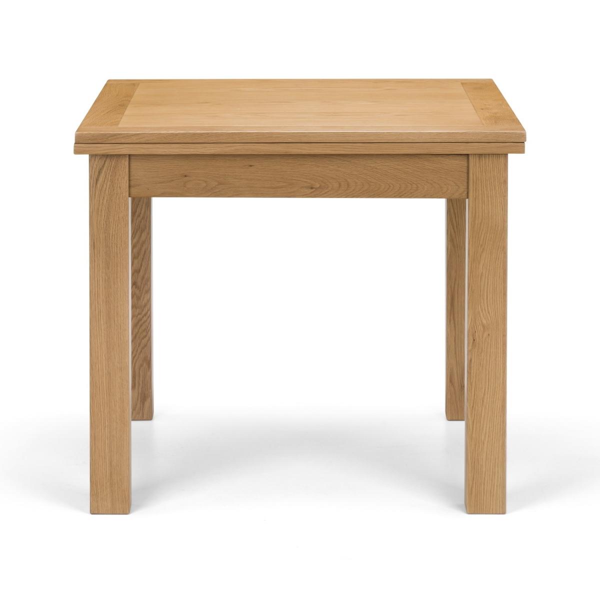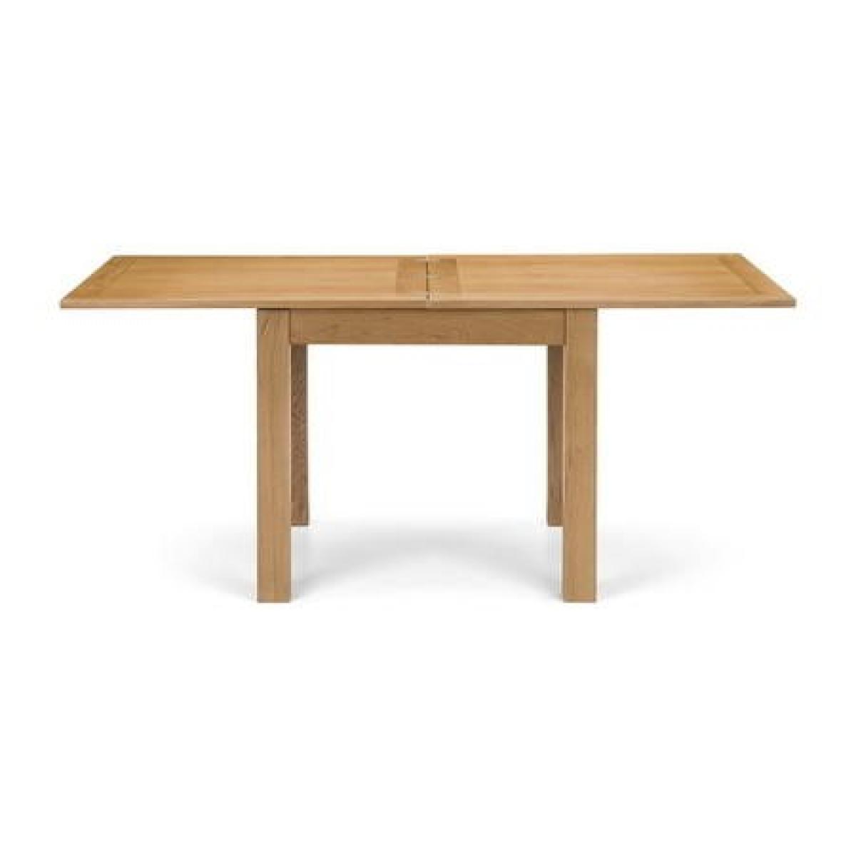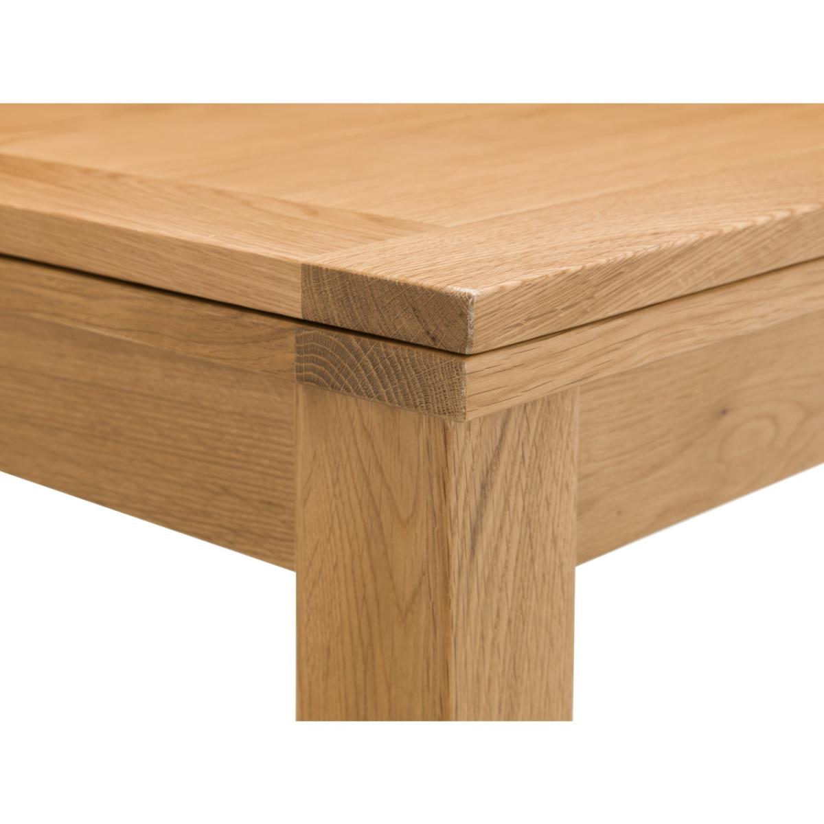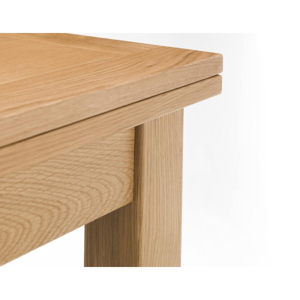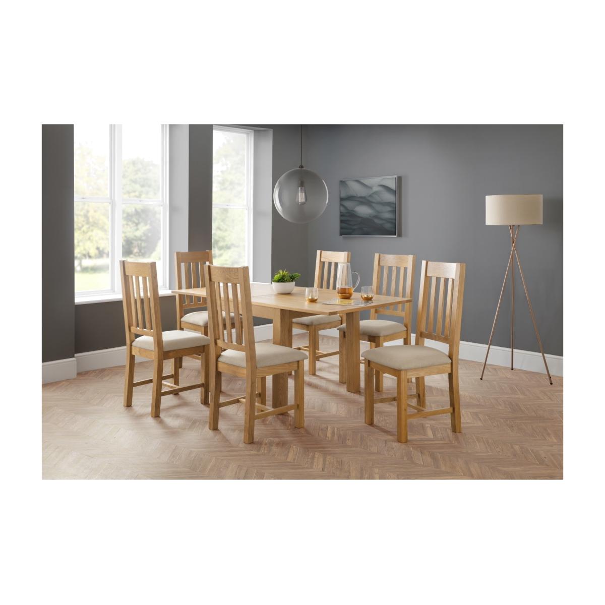 Dimensions W180x H75x D90 cm. Create a classic yet contemporary feel in your dining room with this dining set. Featuring a sturdy table design with a simple flip top extending design to double your dining space and chairs crafted from solid oak with a comfortable padded taupe linen seat. Creating a functional and comfortable dining experience perfect for your home. Features. A classic table design with a chunky 40mm thick top in a waxed oak finish. A simple flip top extending design to double your dining space Chairs crafted from solid oak with a comfortable padded taupe linen seat. Table 78. H x 90/180W x 90. D cm Chair 105. H x 45W x 53. D cm Assembly required..