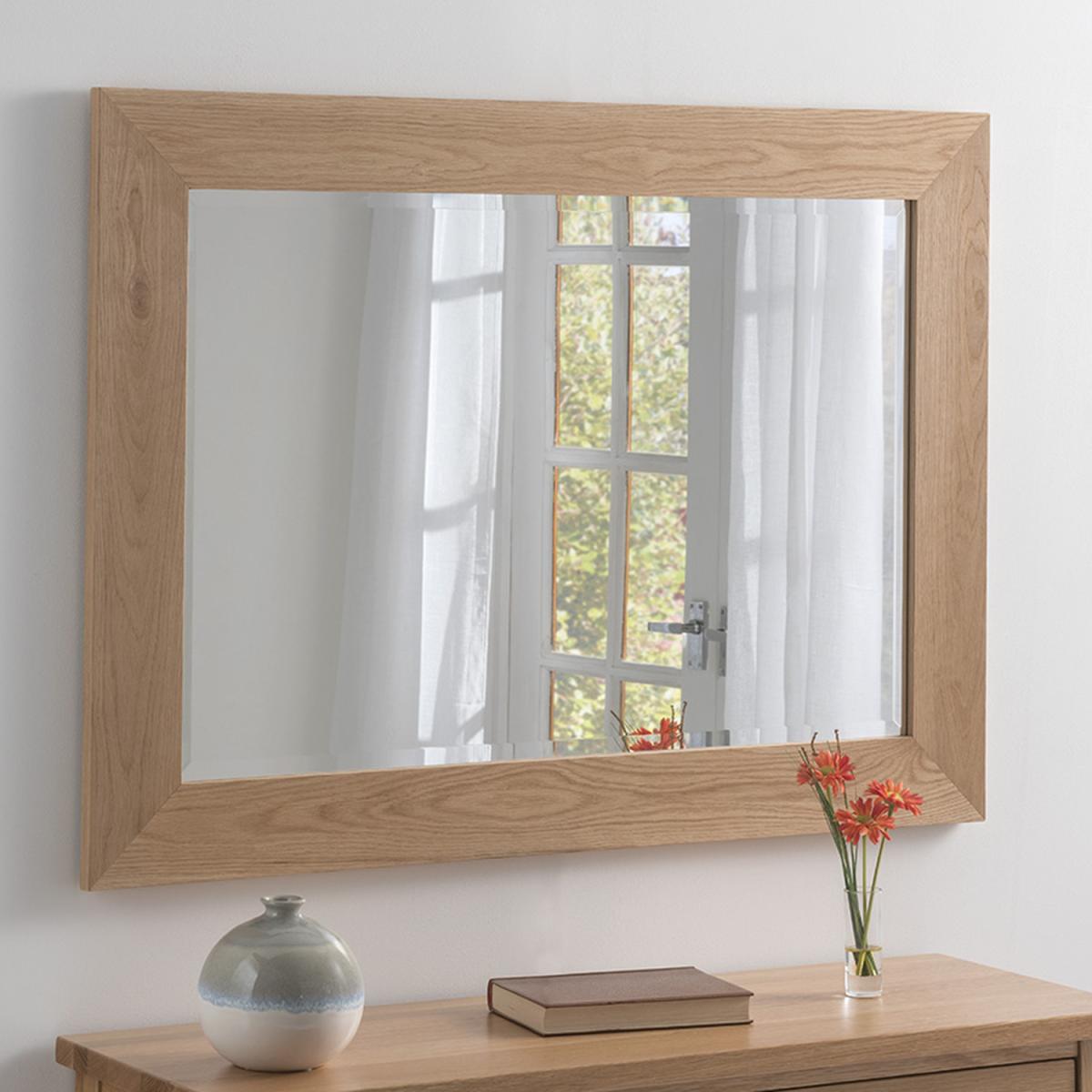 This modern accent mirror is a functional piece of home decor that can also help to reflect light and create the illusion of space. Suitable for any room of the home, this mirror can be hung in a landscape or portrait orientation. It features a wide, wooden frame made from solid American oak with a natural wood grain.