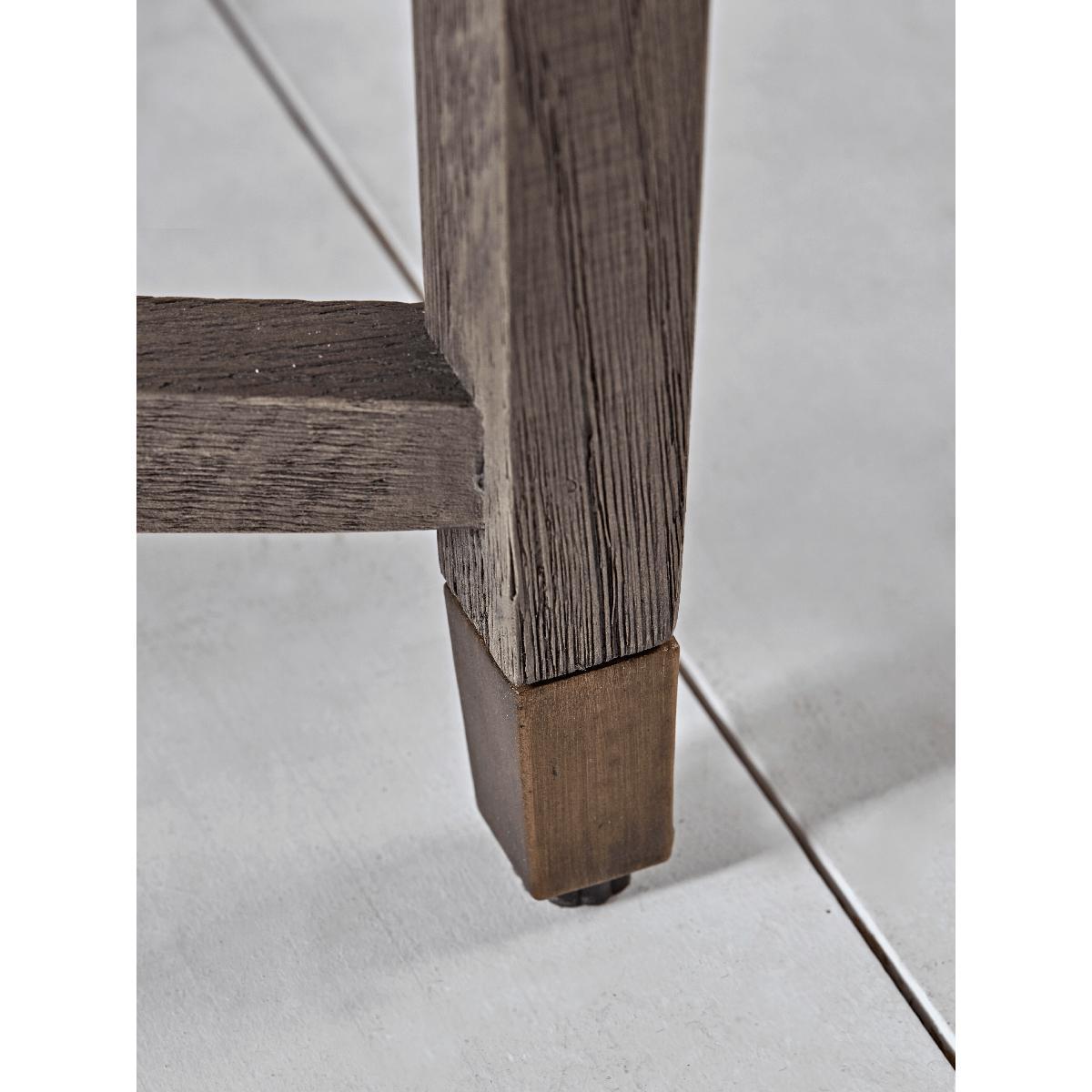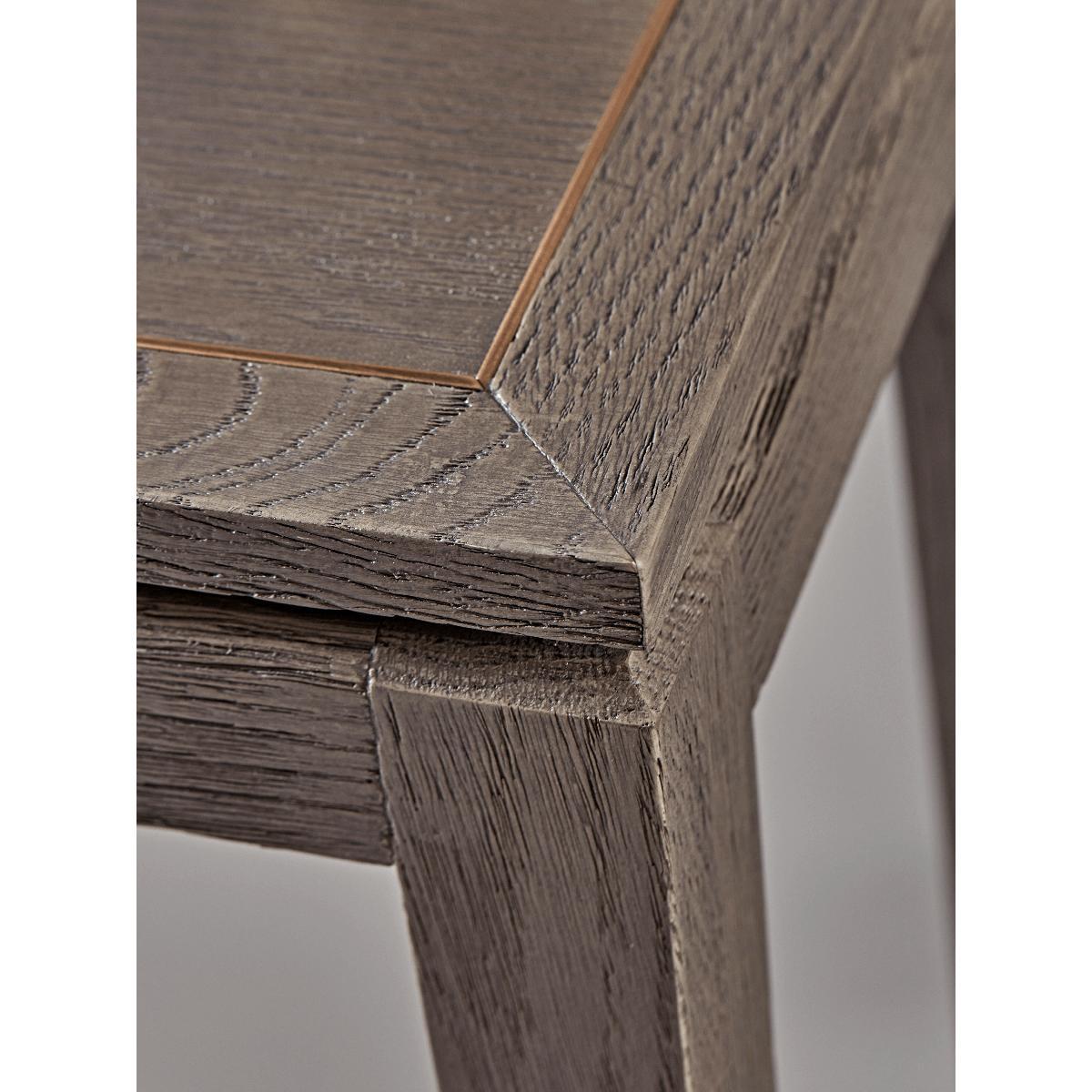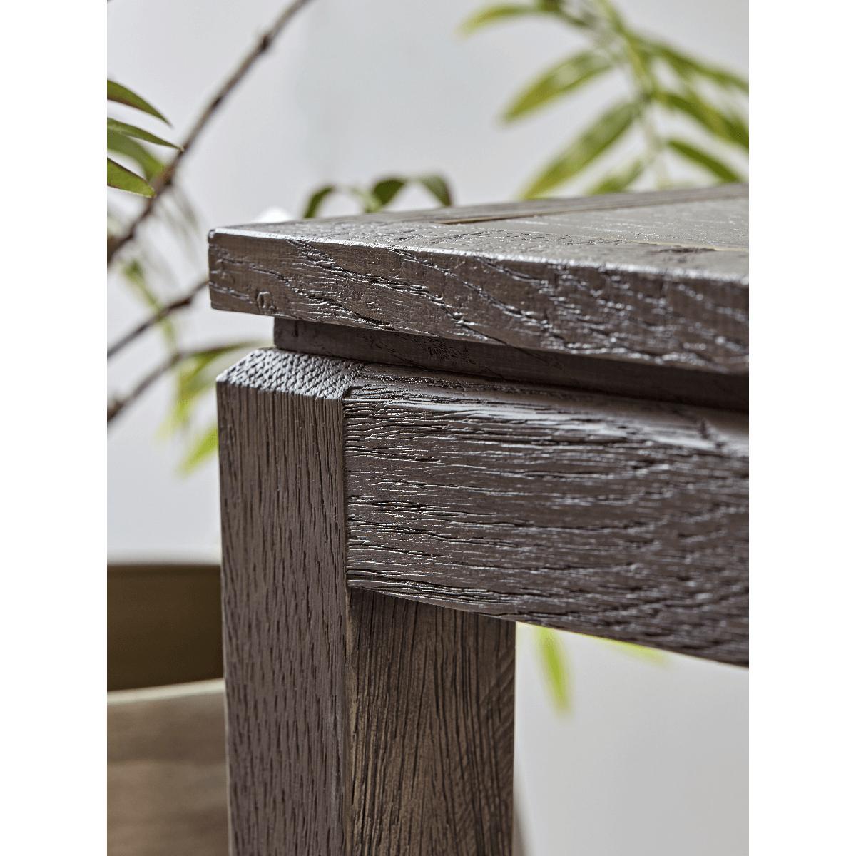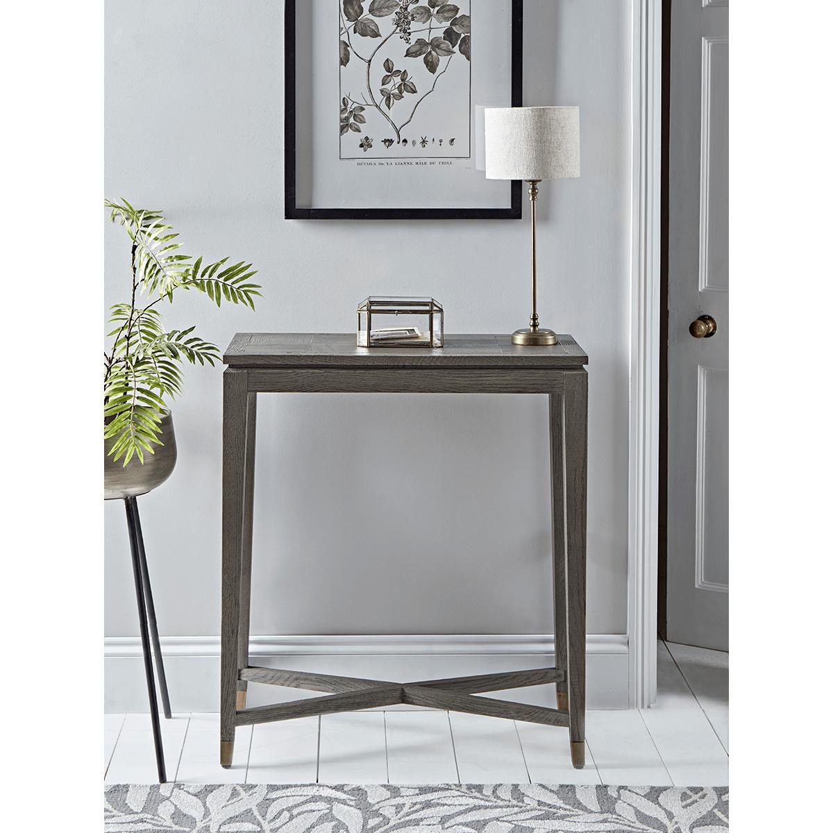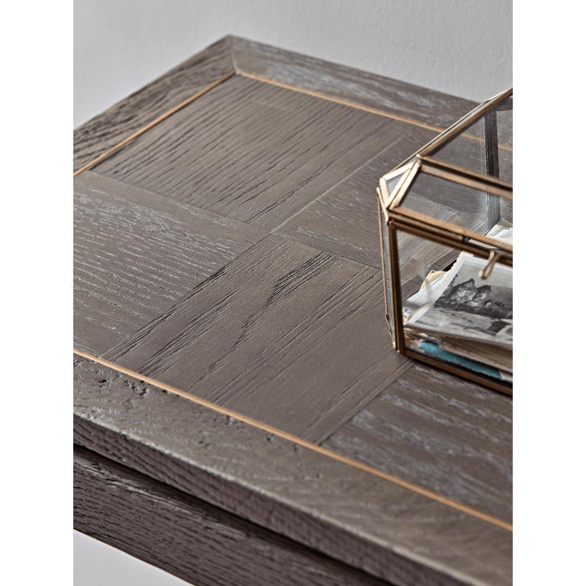 Crafted from oak with a beautiful smokey dark wood stain, our console table has four angular legs that connect through a cross for a contemporary touch. The table top features ten panels of oak in different finishes for a unique look.
