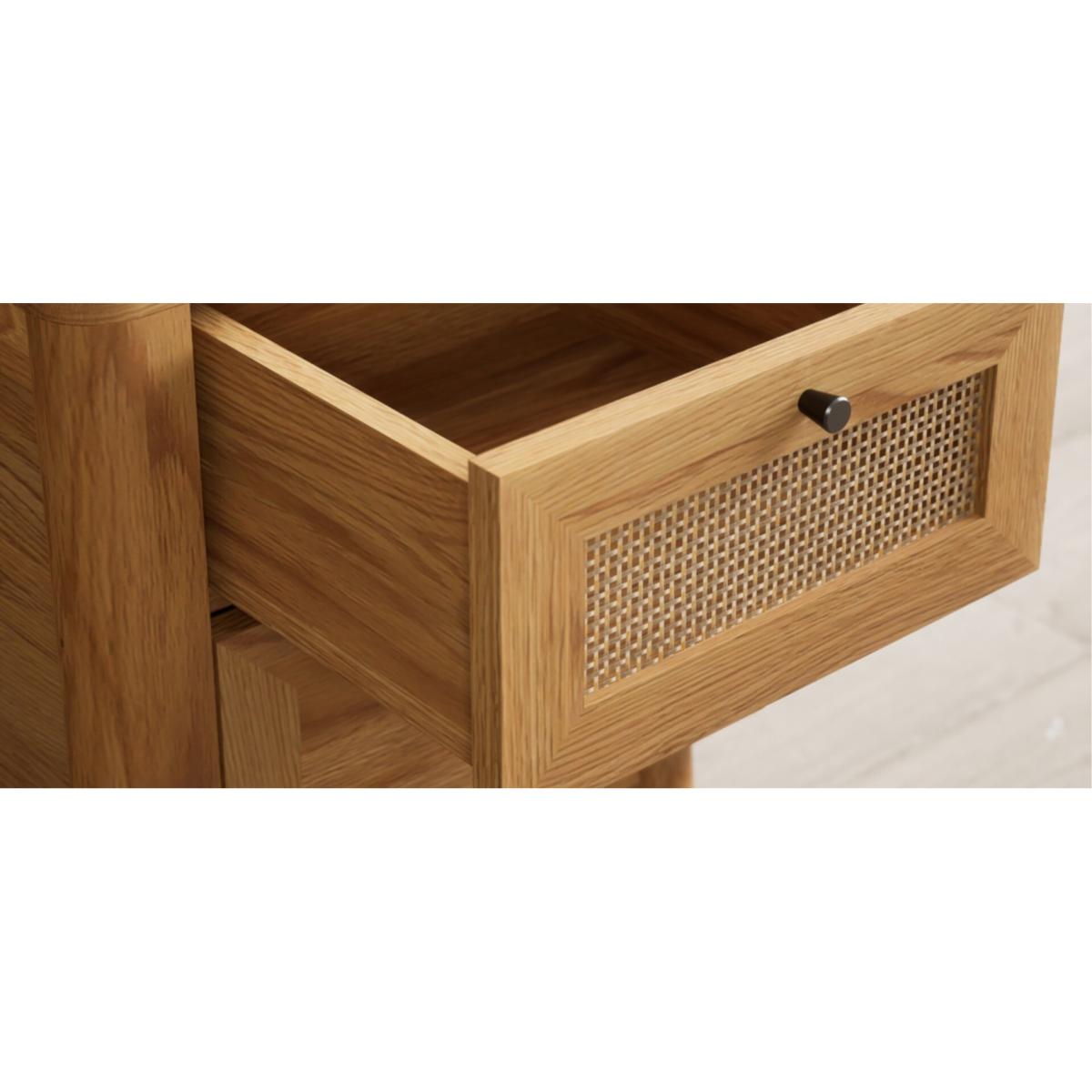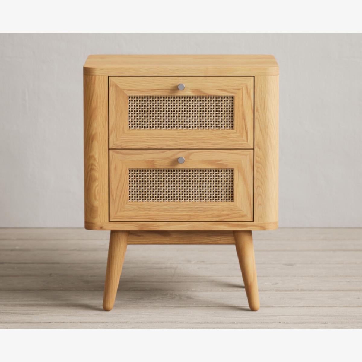 The Oak Rattan 2 Drawer Bedside Chest is crafted from 100% solid oak with a rustic finish and features two dovetail drawers complete with metal handles and rattan detail.