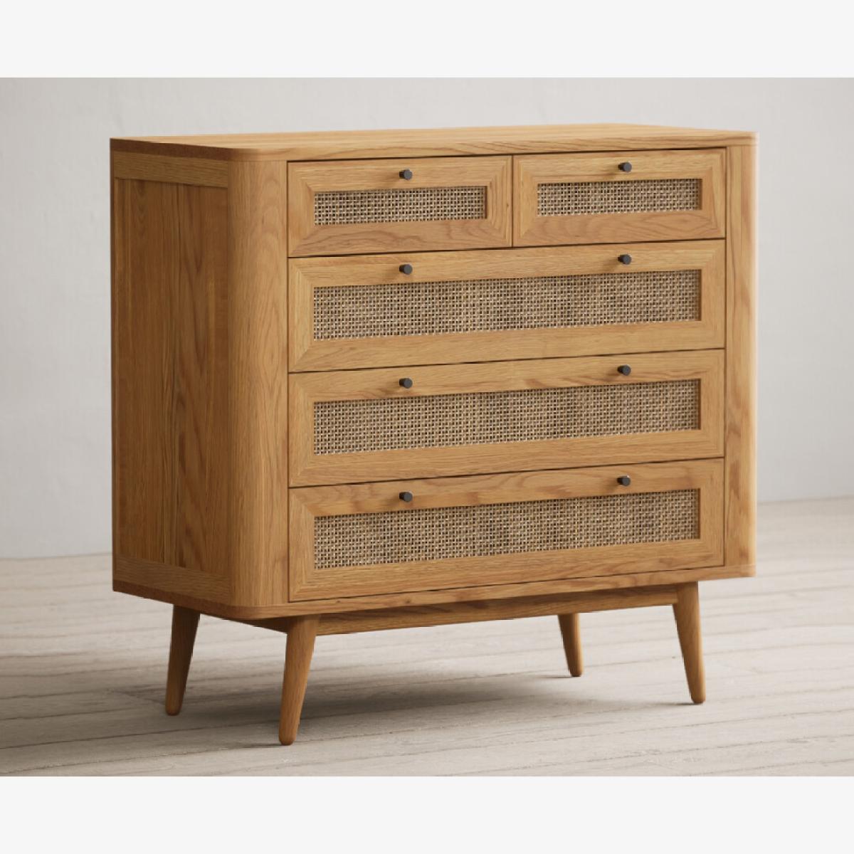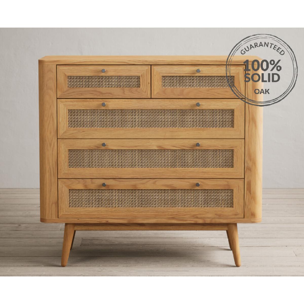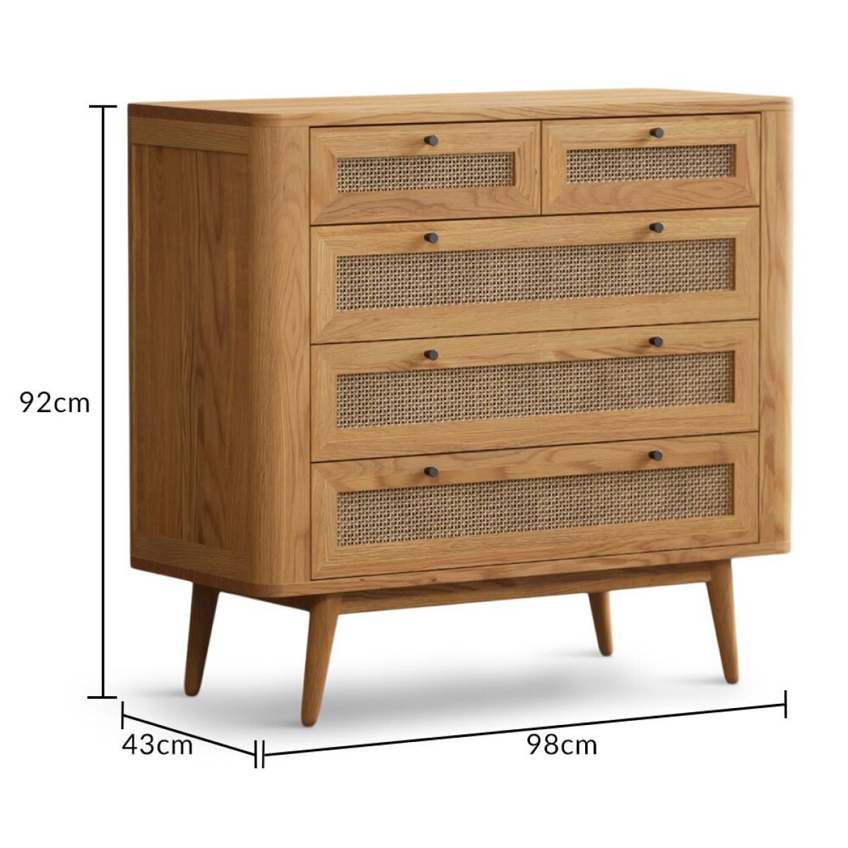 The Oak Rattan 2 Over 3 Chest of Drawers has been crafted from 100% solid oak with a rustic finish and features dovetail drawers with rattan fronts.