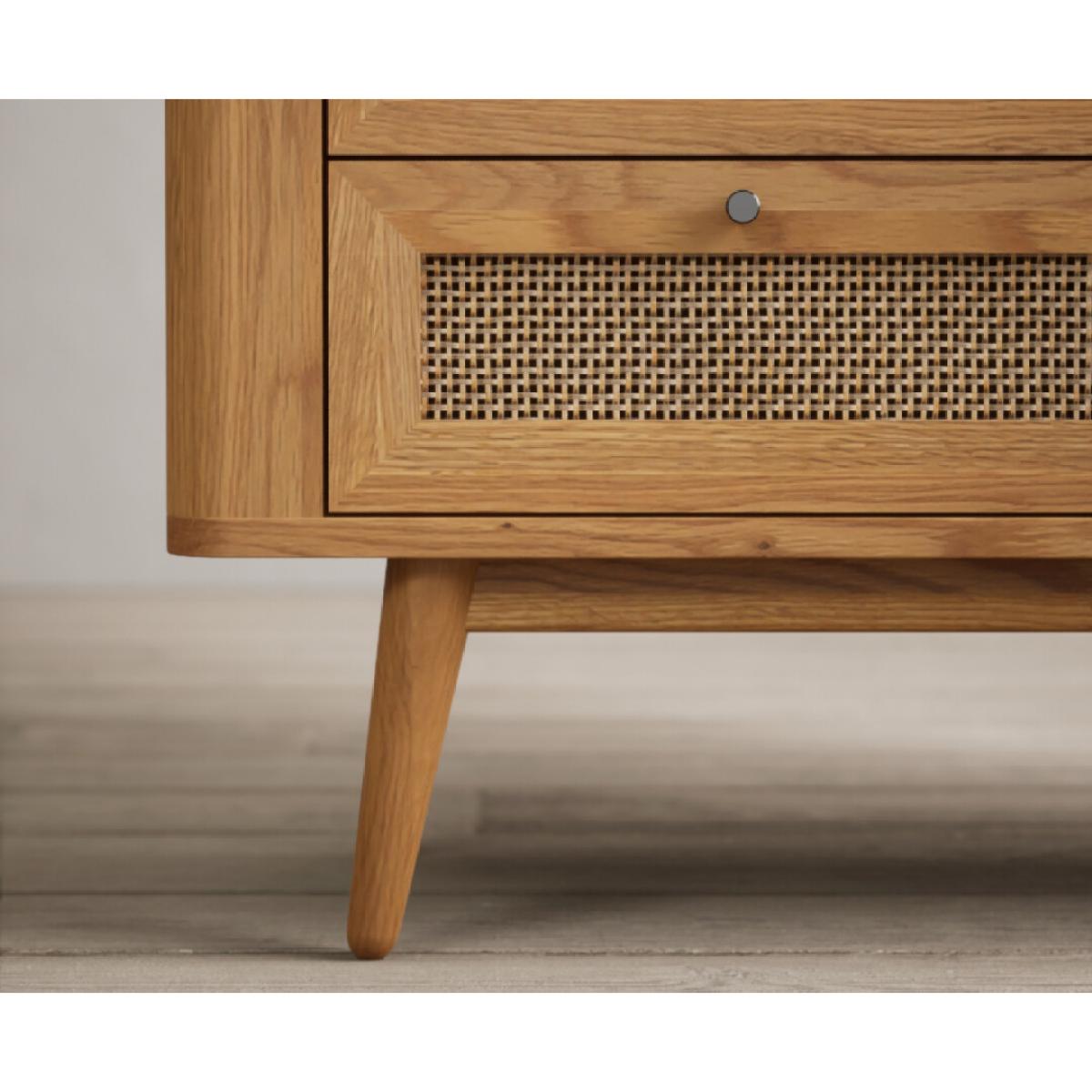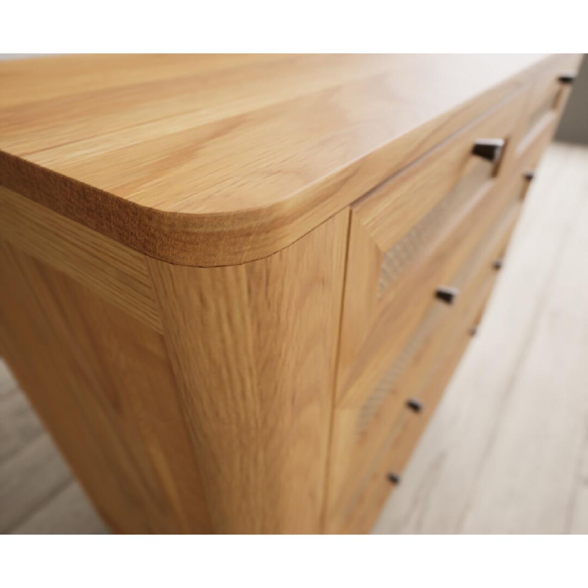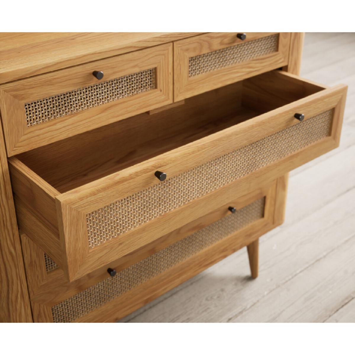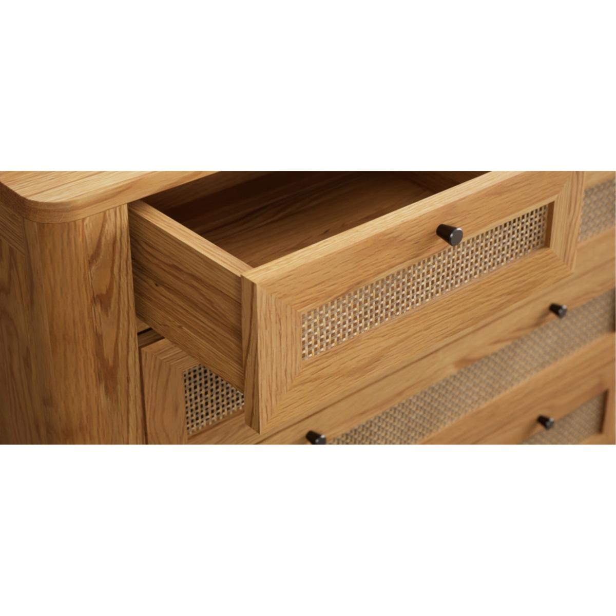 The Oak Rattan 2 Over 3 Chest of Drawers has been crafted from 100% solid oak with a rustic finish and features dovetail drawers with rattan fronts.