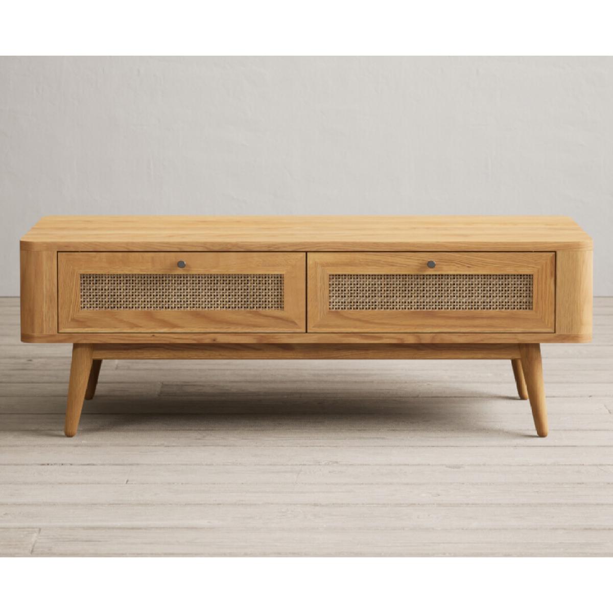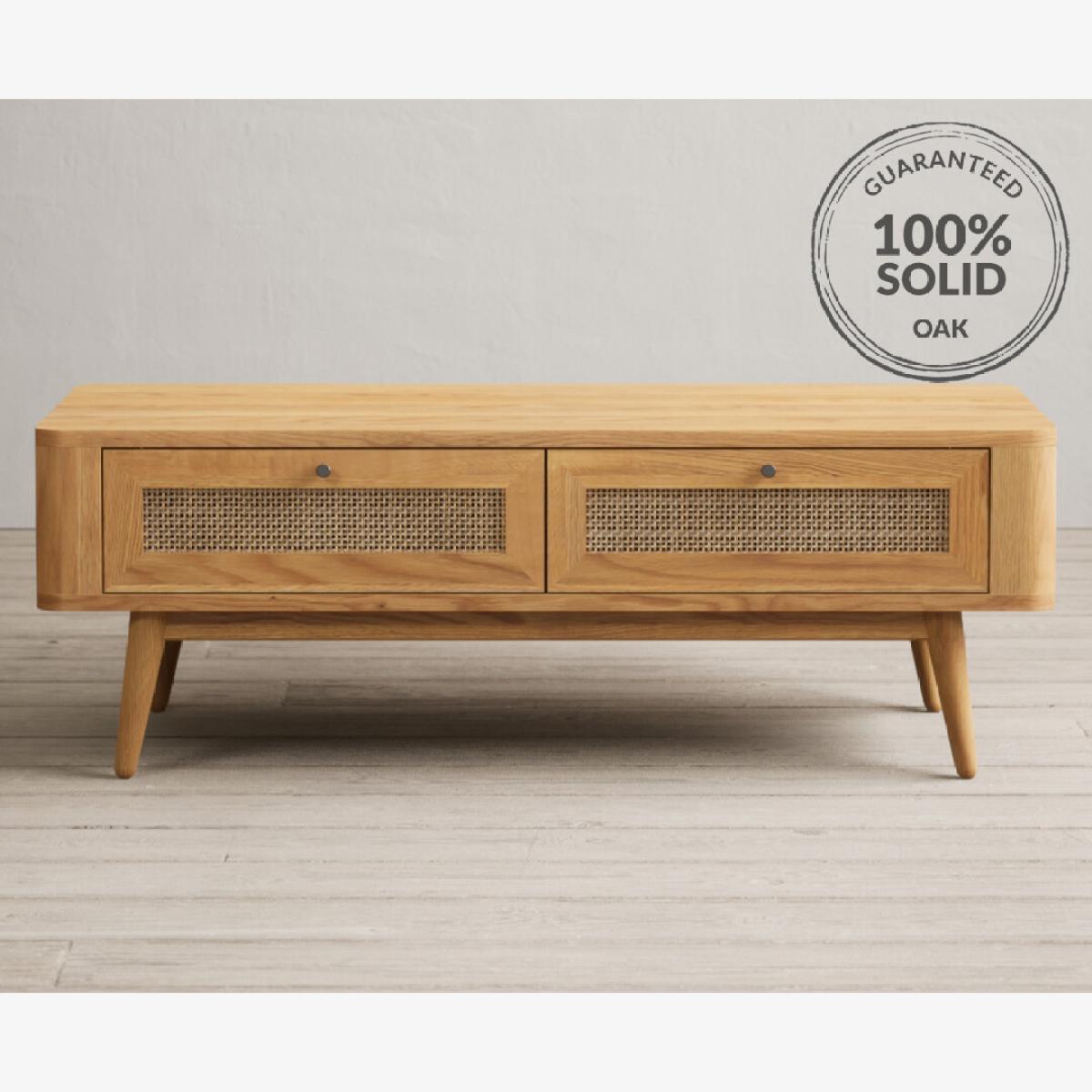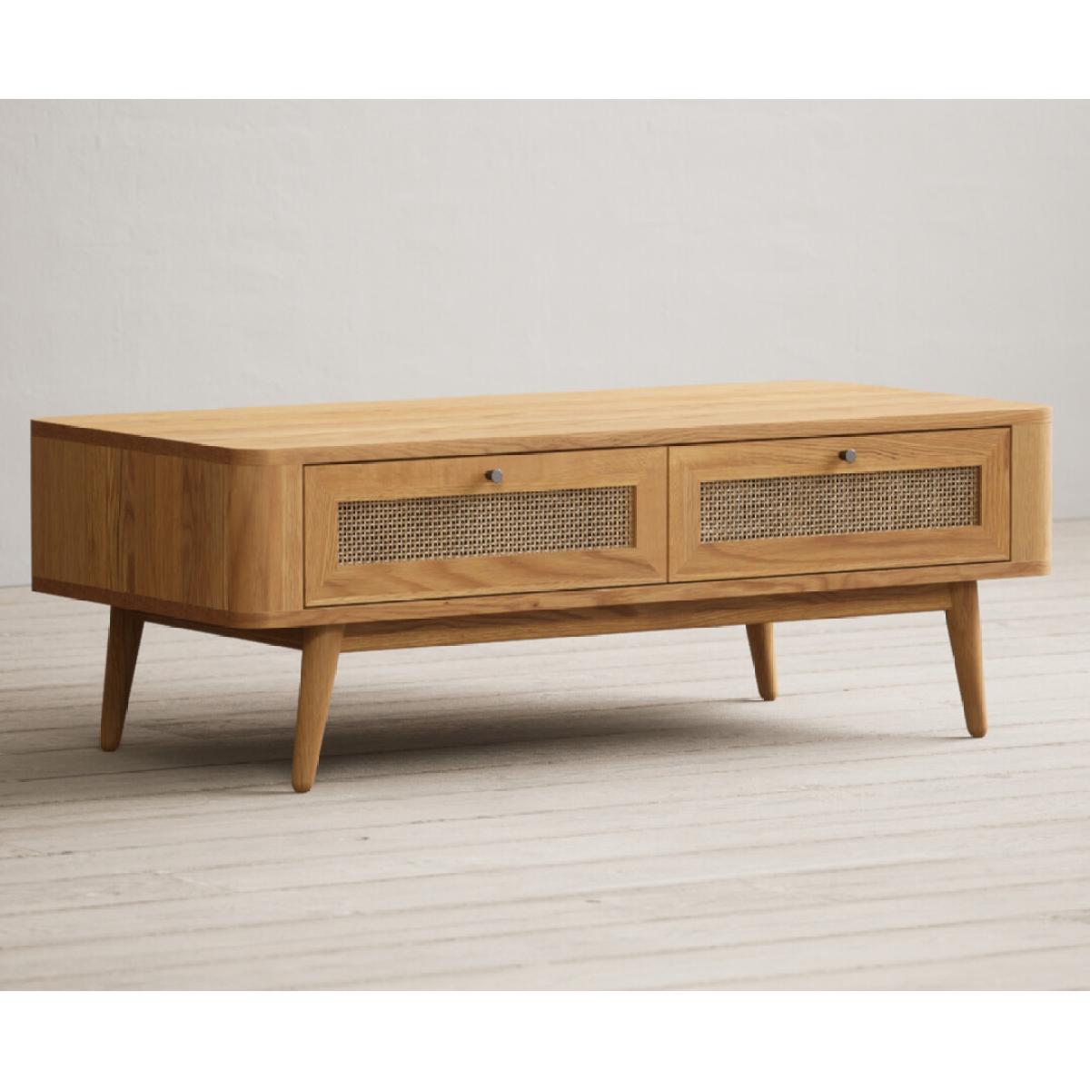 The Oak Rattan 4 Drawer Coffee Table has been crafted from 100% solid oak with a rustic finish and features tapered legs and dovetail drawers with rattan fronts.