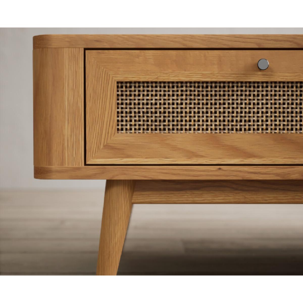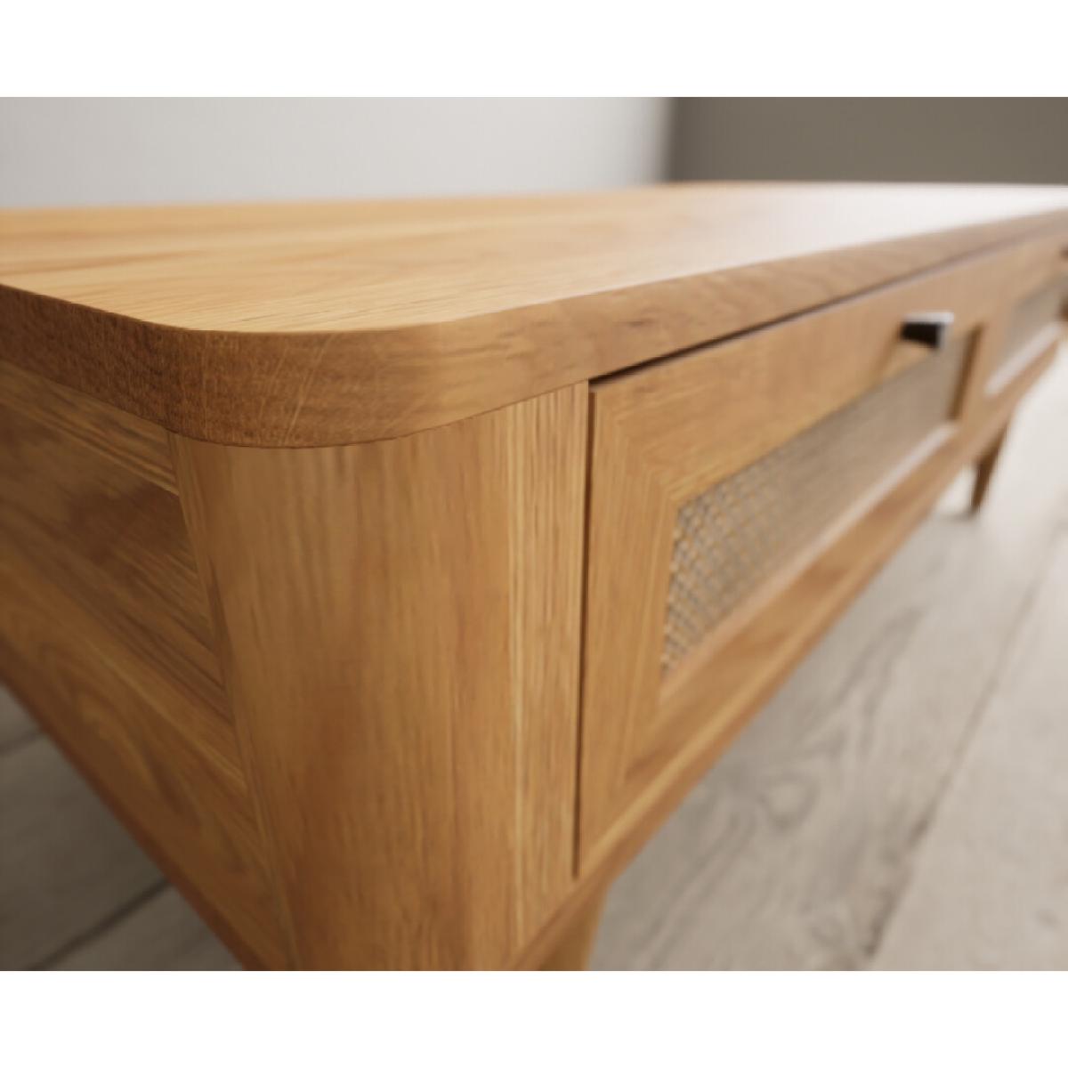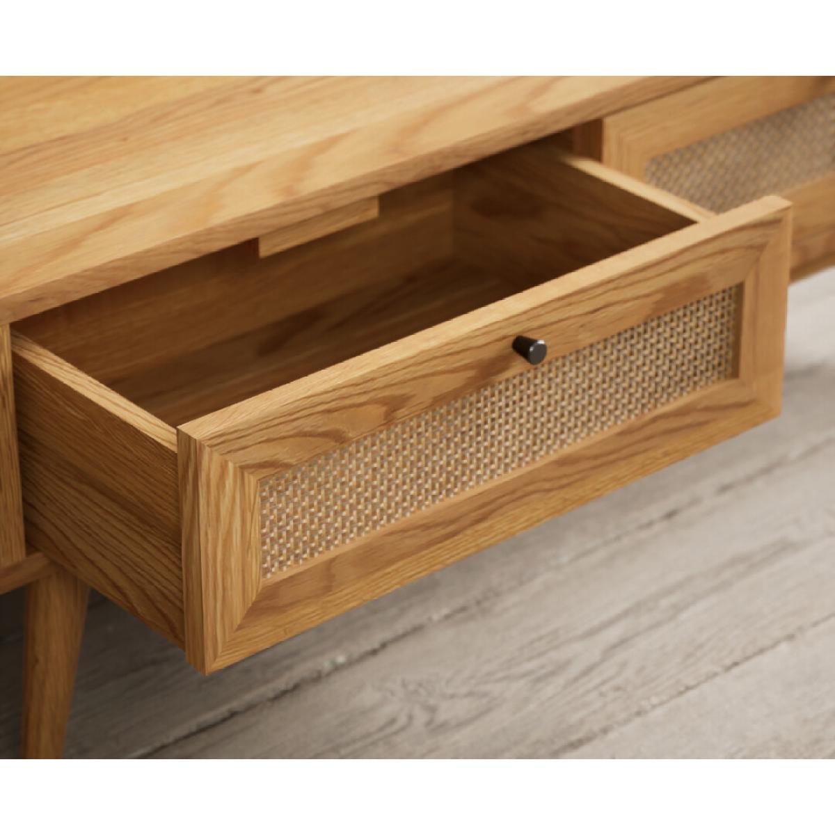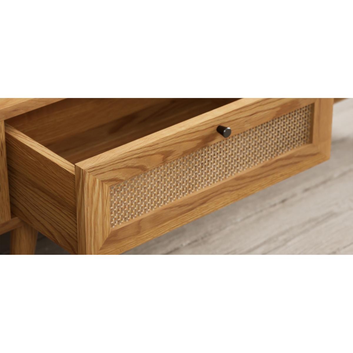 The Oak Rattan 4 Drawer Coffee Table has been crafted from 100% solid oak with a rustic finish and features tapered legs and dovetail drawers with rattan fronts.