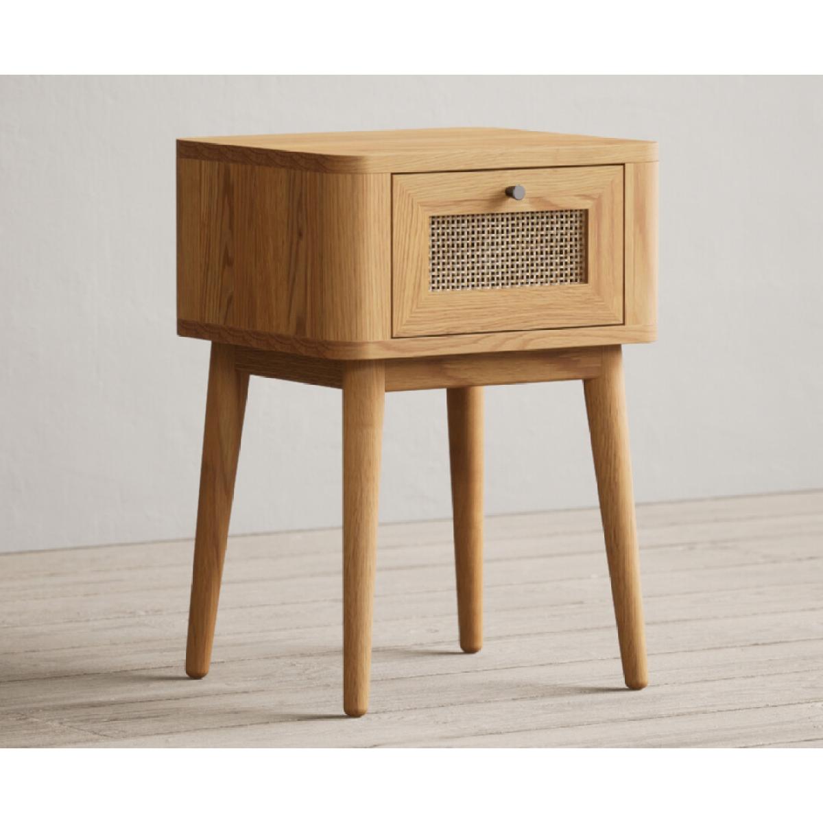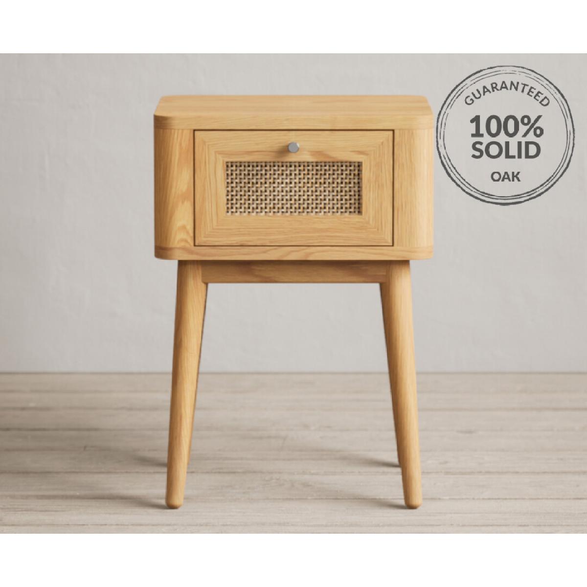 The Oak Rattan Bedside Table has been crafted using 100% solid oak and features a rustic finish and dovetail drawer with rattan detail.