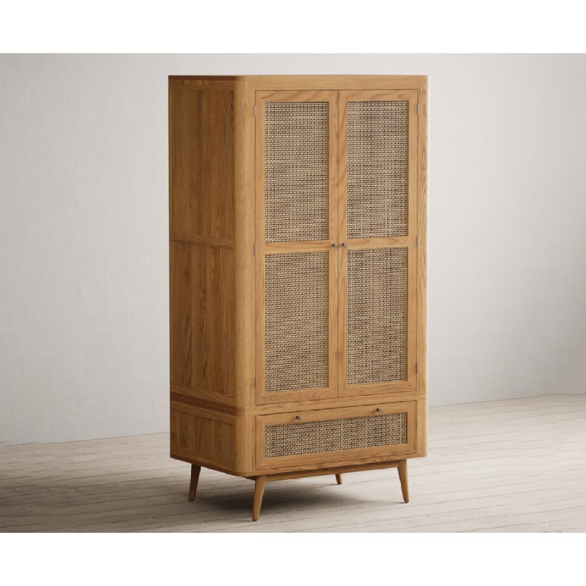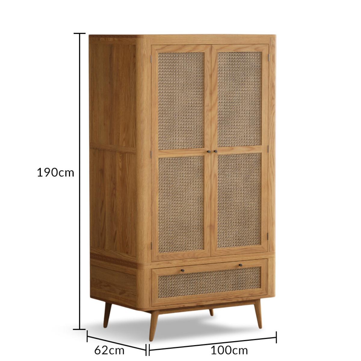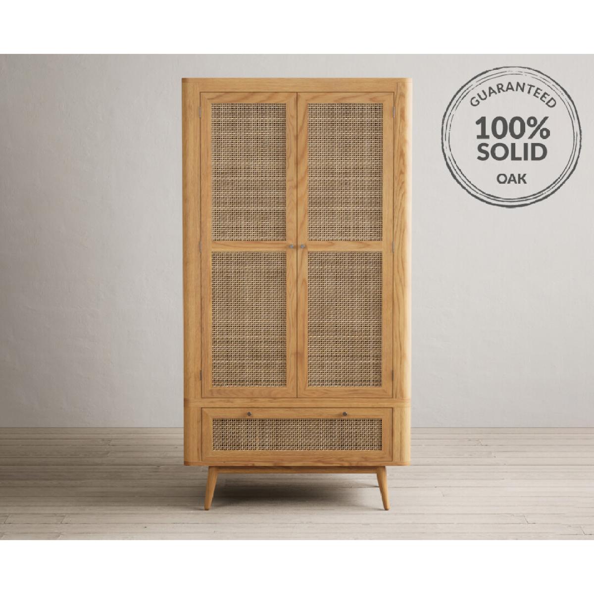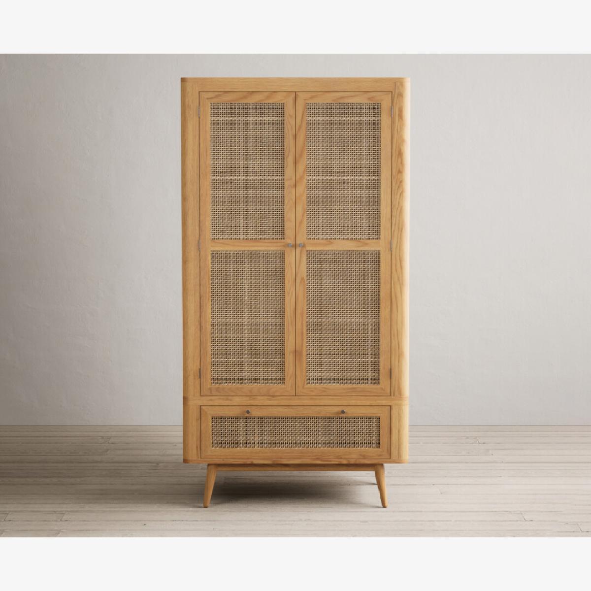The Oak Rattan Double Wardrobe has been crafted from 100% solid oak and features a rustic finish, complete with a lower dovetail drawer and stunning rattan detail.