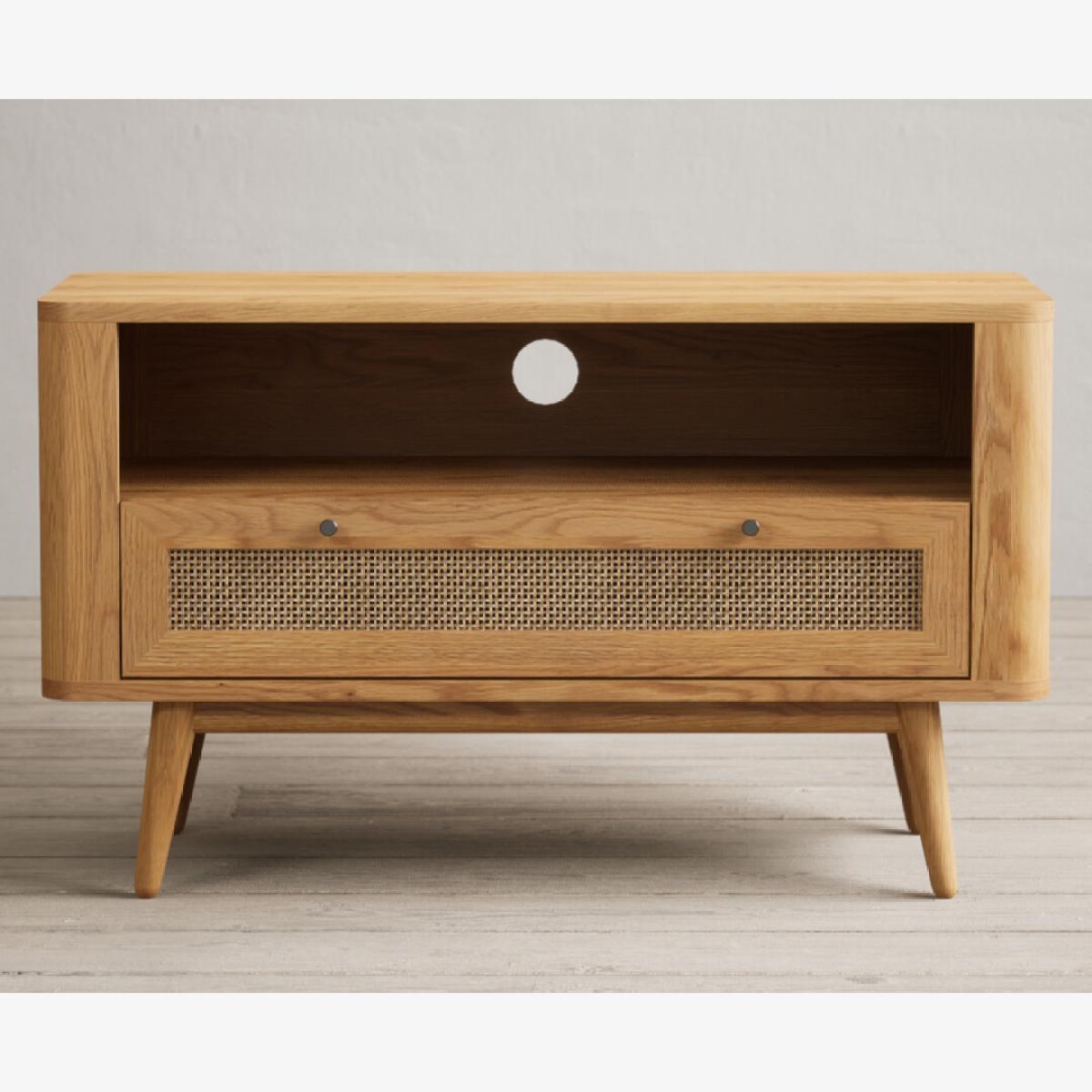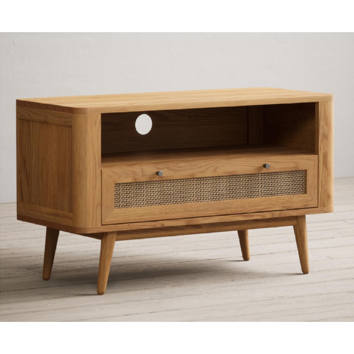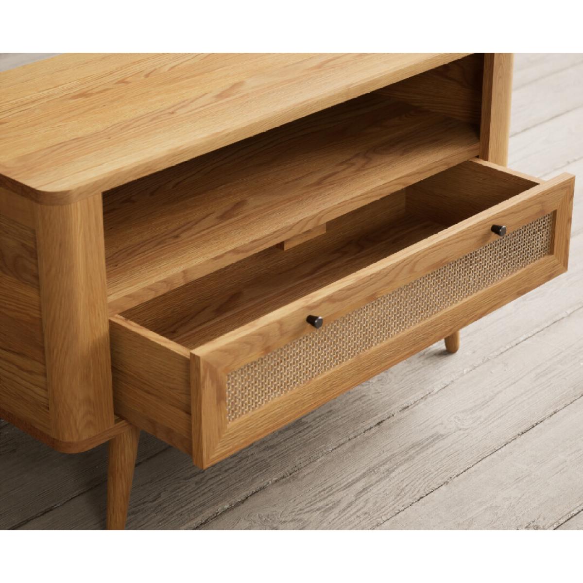 The Oak Rattan Small TV Cabinet has been crafted from 100% solid oak with a rustic finish and features a generous open shelf with a cable hole at the back and dovetail drawer with rattan detail.