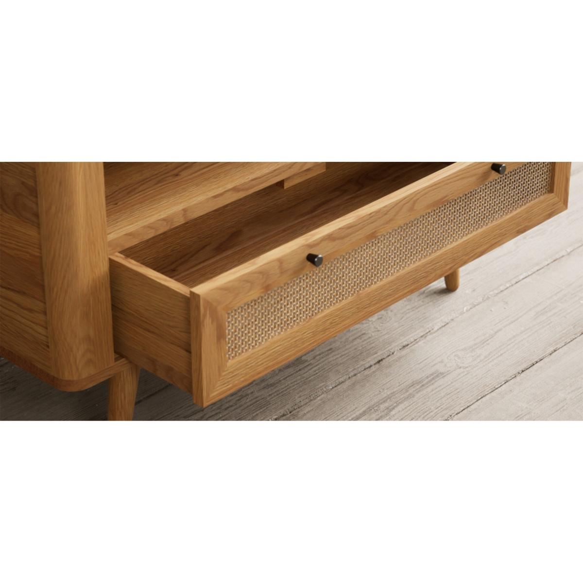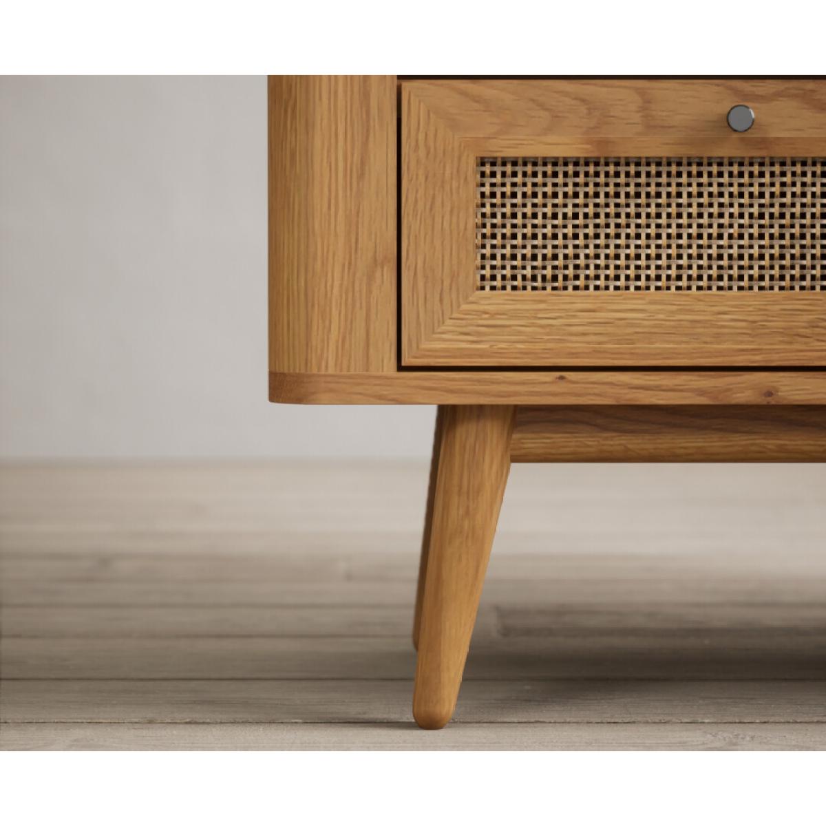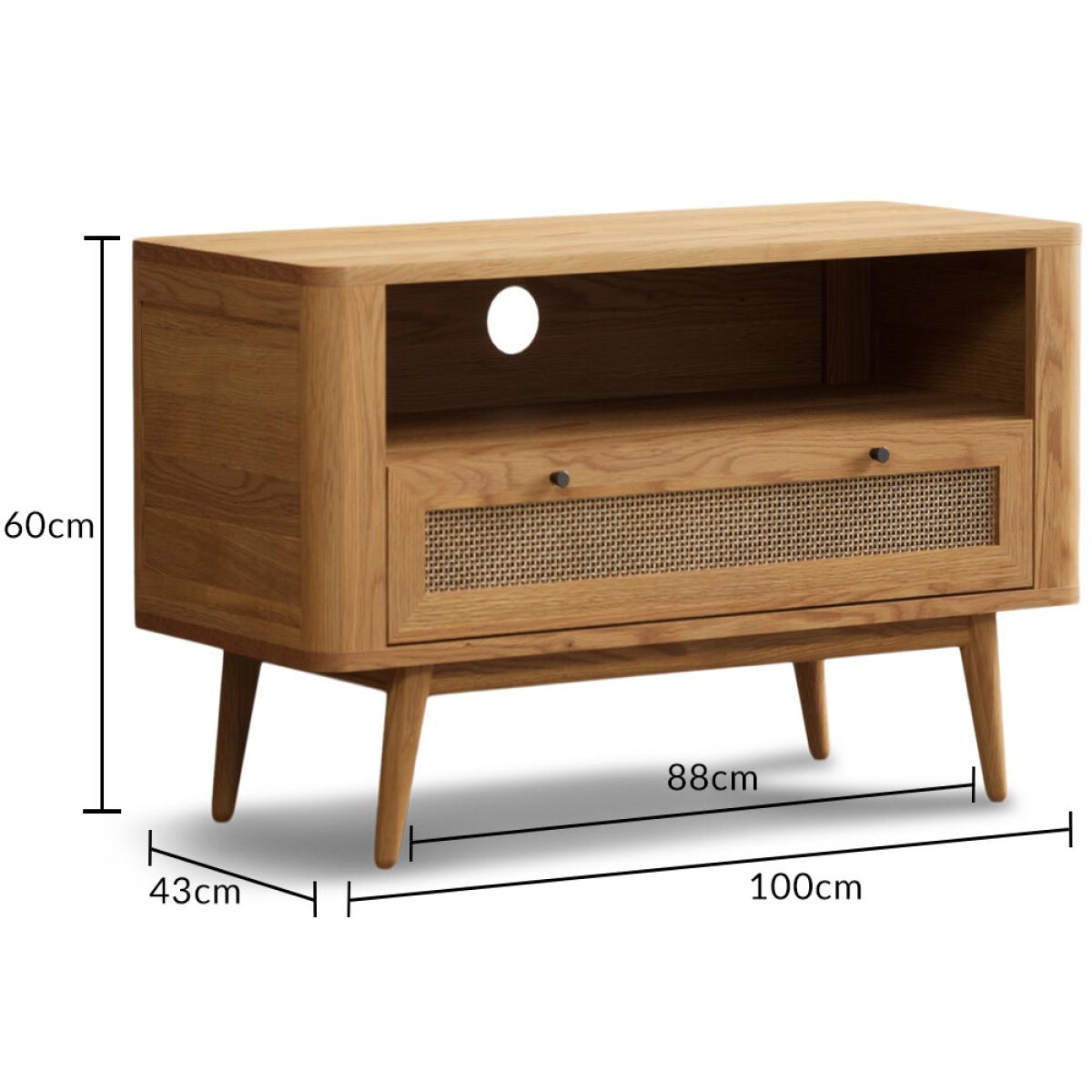 The Oak Rattan Small TV Cabinet has been crafted from 100% solid oak with a rustic finish and features a generous open shelf with a cable hole at the back and dovetail drawer with rattan detail.
