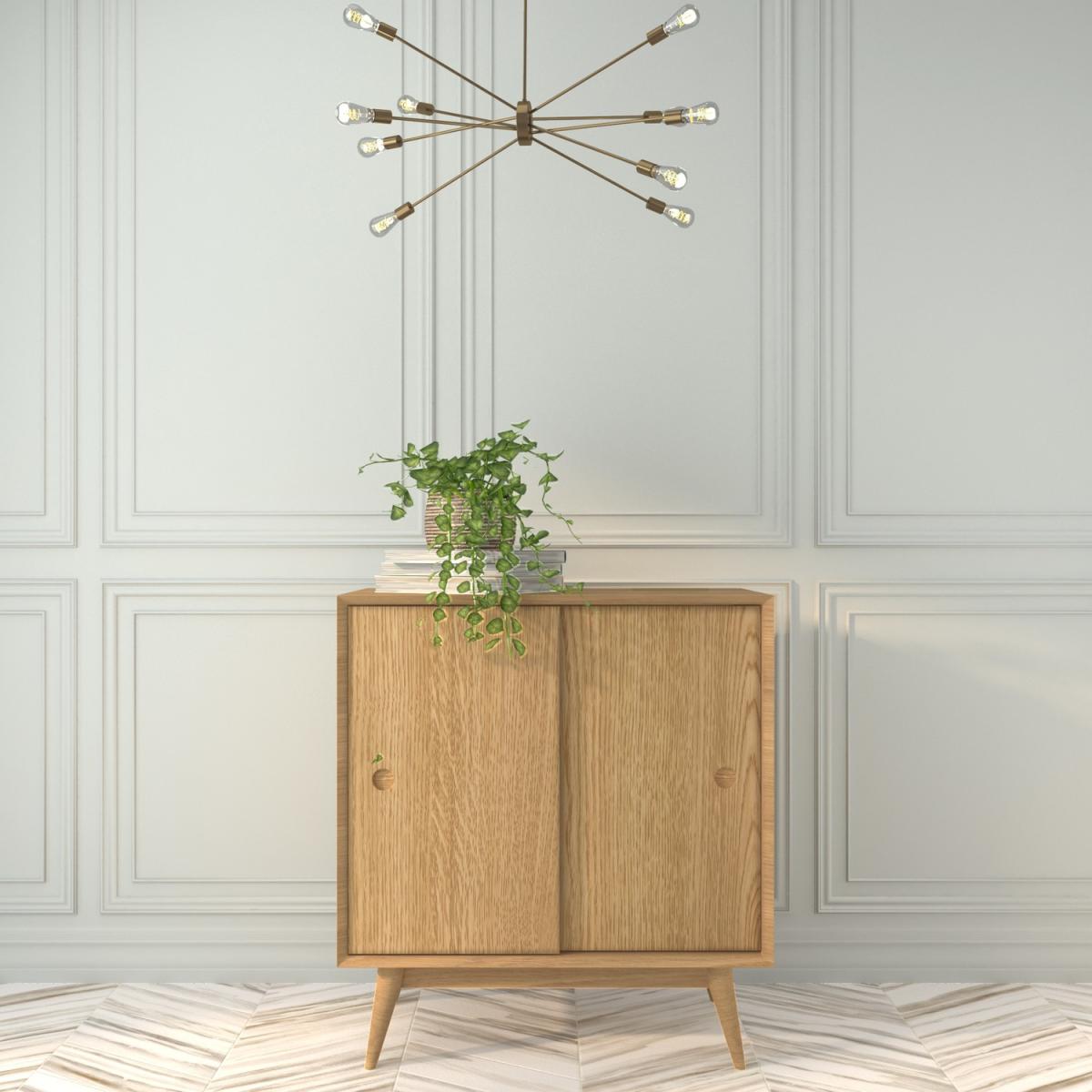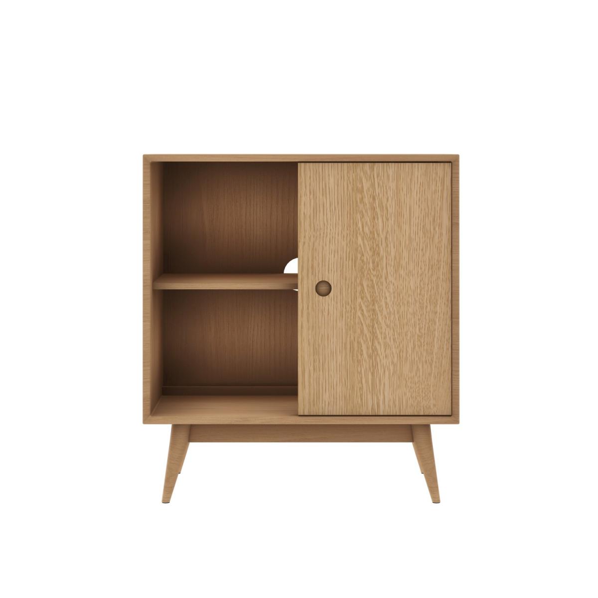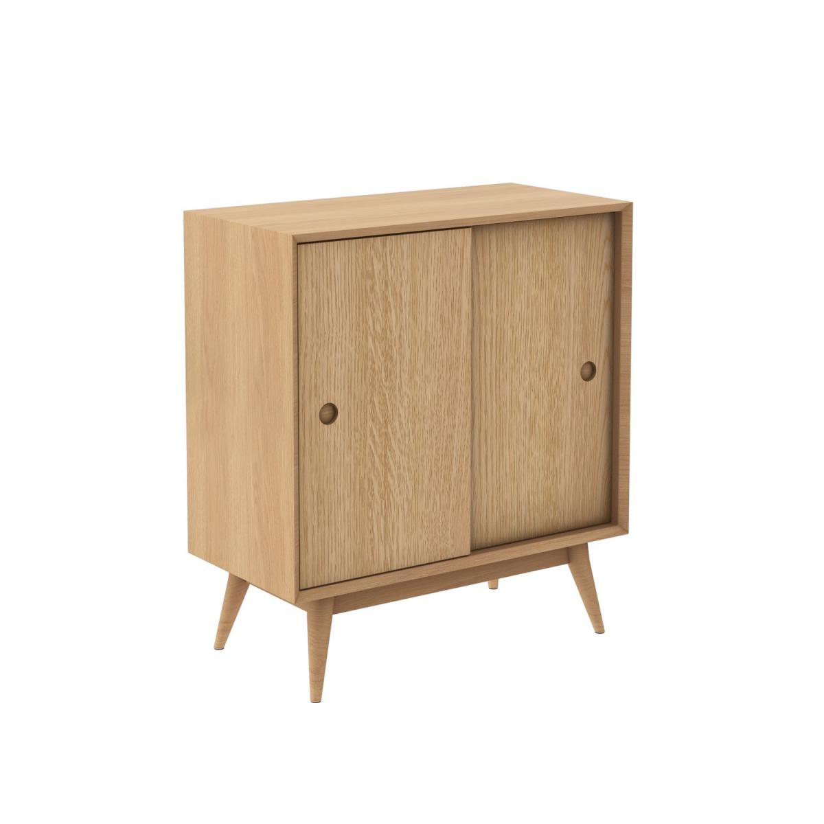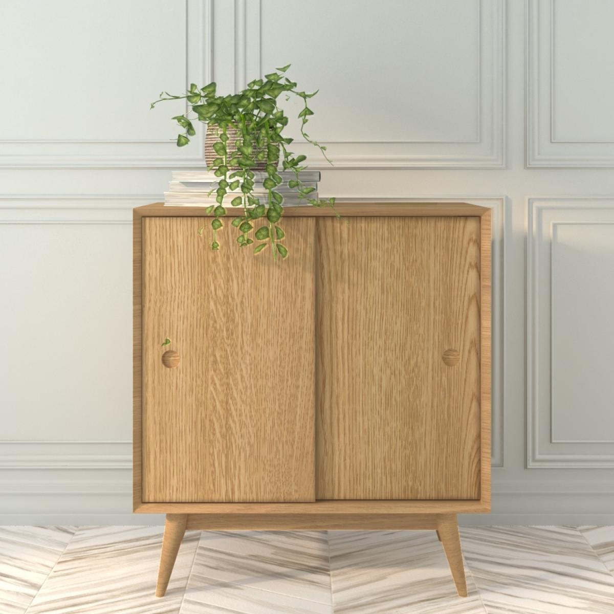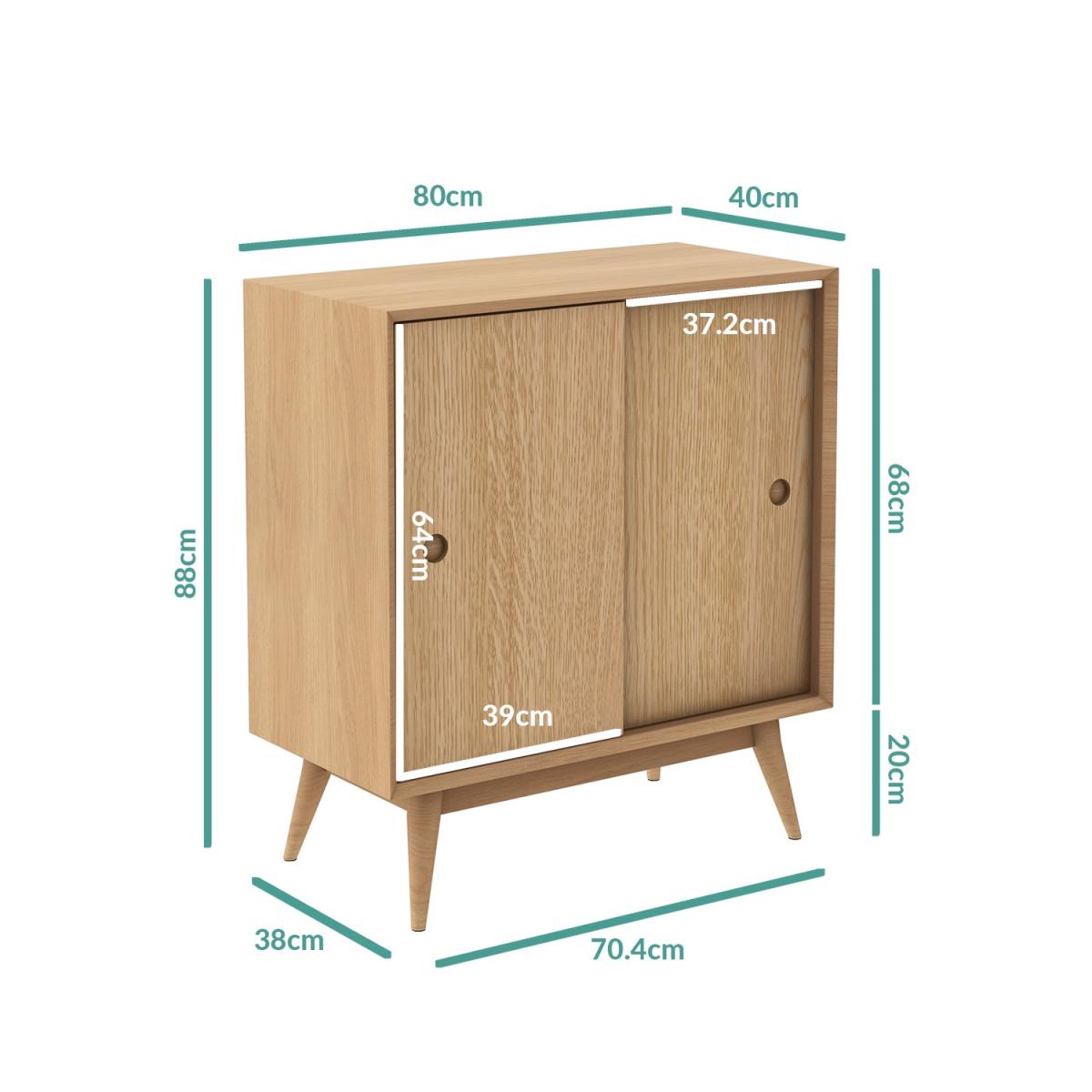 Features we love Scandinavian inspired design with beautiful legs. Stunning mitred edge thanks to its oak veneer build. Cut-out circular handles enhance its minimal design. Storage solution - one shelf and two compartments. With a cable hole to accommodate a media device. Easy access sliding doors to keep items tucked away. Made with oak veneer it prevents chance of cracking. With a solid oak frame it’s been built to last Need to know. Overall dimensions. W80 x H88 x D40 cm Number of shelves. 1 Number of cupboard compartments. 2 Number of legs. 4 Door style. Sliding Colour. Natural Finish. Natural oak clear oil Material. Solid oak (edges corners and legs) oak veneer backed with MDF (top and sides) and metal (runner) Weight. 30kg Assembly required. Yes - attaching legs.