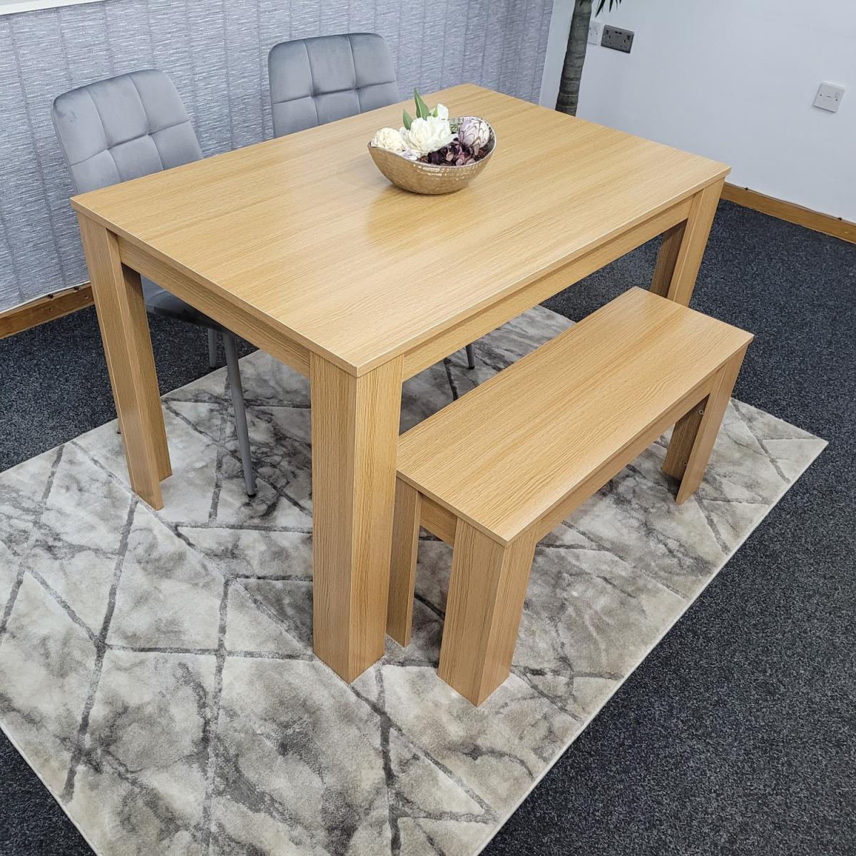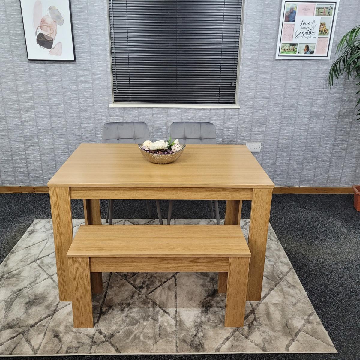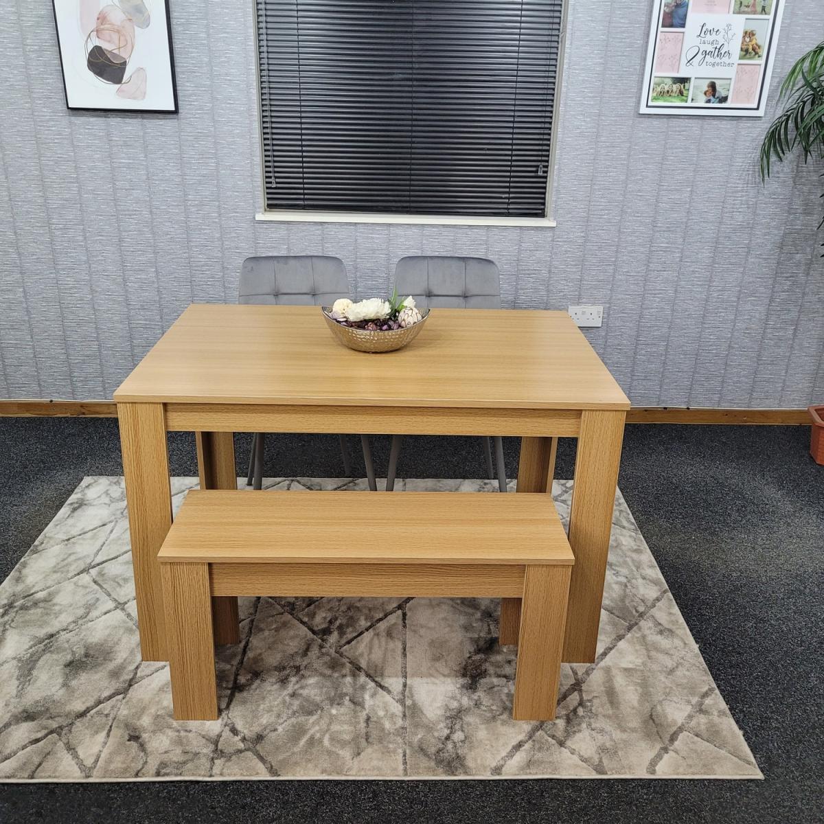 A Stunning wooden oak effect Dining Table set with 2 grey tufted velvet chairs and 1 bench. The table is made from wood and has a melamine laminated light oak effect, transforming your dining room and looks so spectacular and unique. The high-quality velvet chairs give a premium look and ultra-smooth feel. A slightly curved shape is more comfortable to sit on, and with lots of padding. Armless design to give a chic look and bring modern elegance to your home dining room. Flat packed, some home assembly required, All our chairs meet fire resistance standards fast delivery to all UK. All fittings and tools are included.