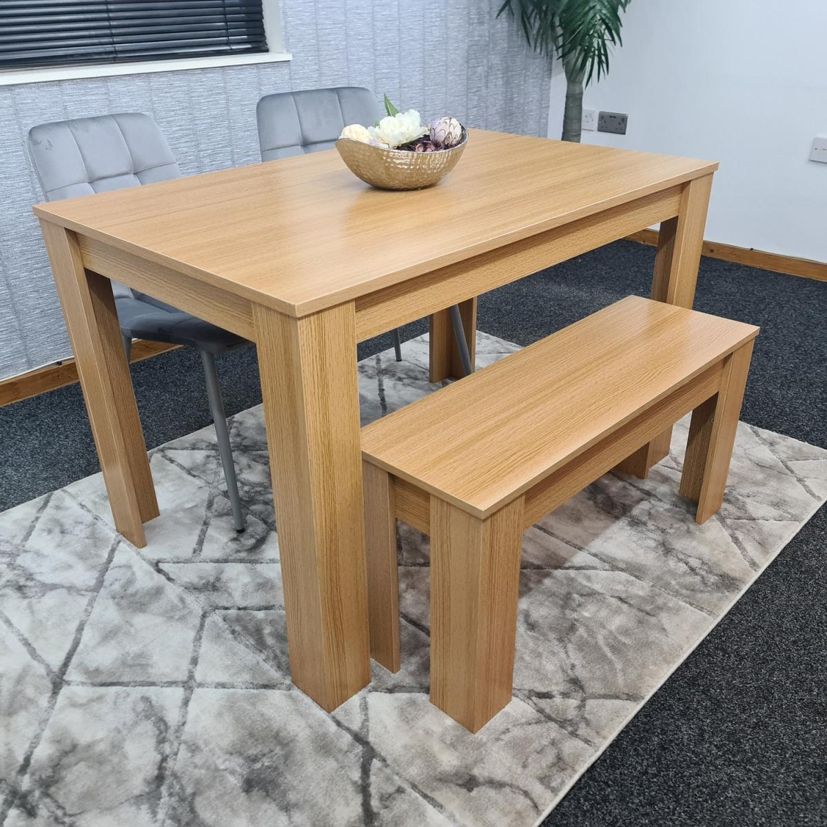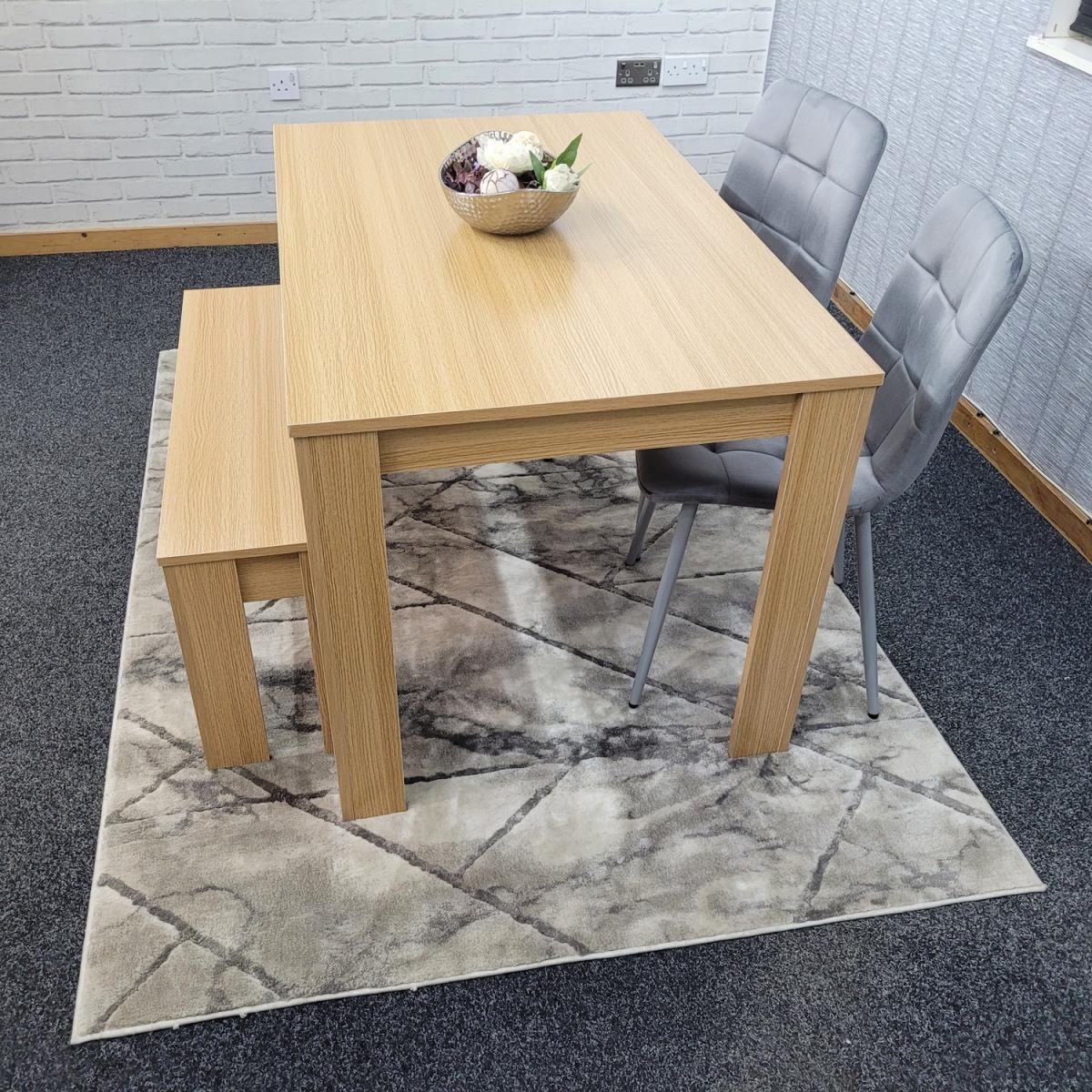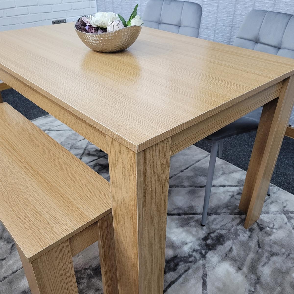 A Stunning wooden oak effect Dining Table set with 2 grey tufted velvet chairs and 1 bench. The table is made from wood and has a melamine laminated light oak effect, transforming your dining room and looks so spectacular and unique. The high-quality velvet chairs give a premium look and ultra-smooth feel. A slightly curved shape is more comfortable to sit on, and with lots of padding. Armless design to give a chic look and bring modern elegance to your home dining room. Flat packed, some home assembly required, All our chairs meet fire resistance standards fast delivery to all UK. All fittings and tools are included.
