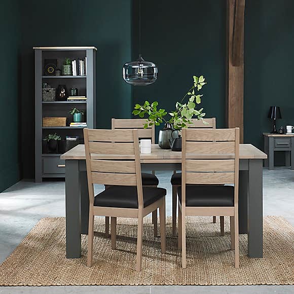 I love the Oakham for its versatility and modern appeal. Its dark grey base provides a neutral yet contemporary look that's perfect for both minimalist and Scandinavian-inspired interiors. The extendable feature makes it practical for everyday family meals or larger gatherings, which adds to its functionality. To style it effectively, consider pairing with upholstered chairs in muted tones or textured fabrics to add softness. It also works well with a mix of materials, such as metal or wood chairs, for an eclectic set-up. Keep the tabletop clutter-free with simple centrepieces or a wooden tray for a lived-in feel, ensuring the table remains a practical and stylish focal point in your dining space.