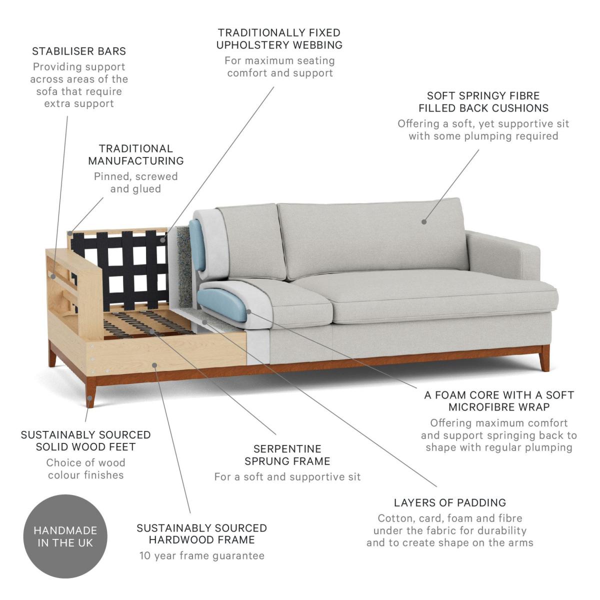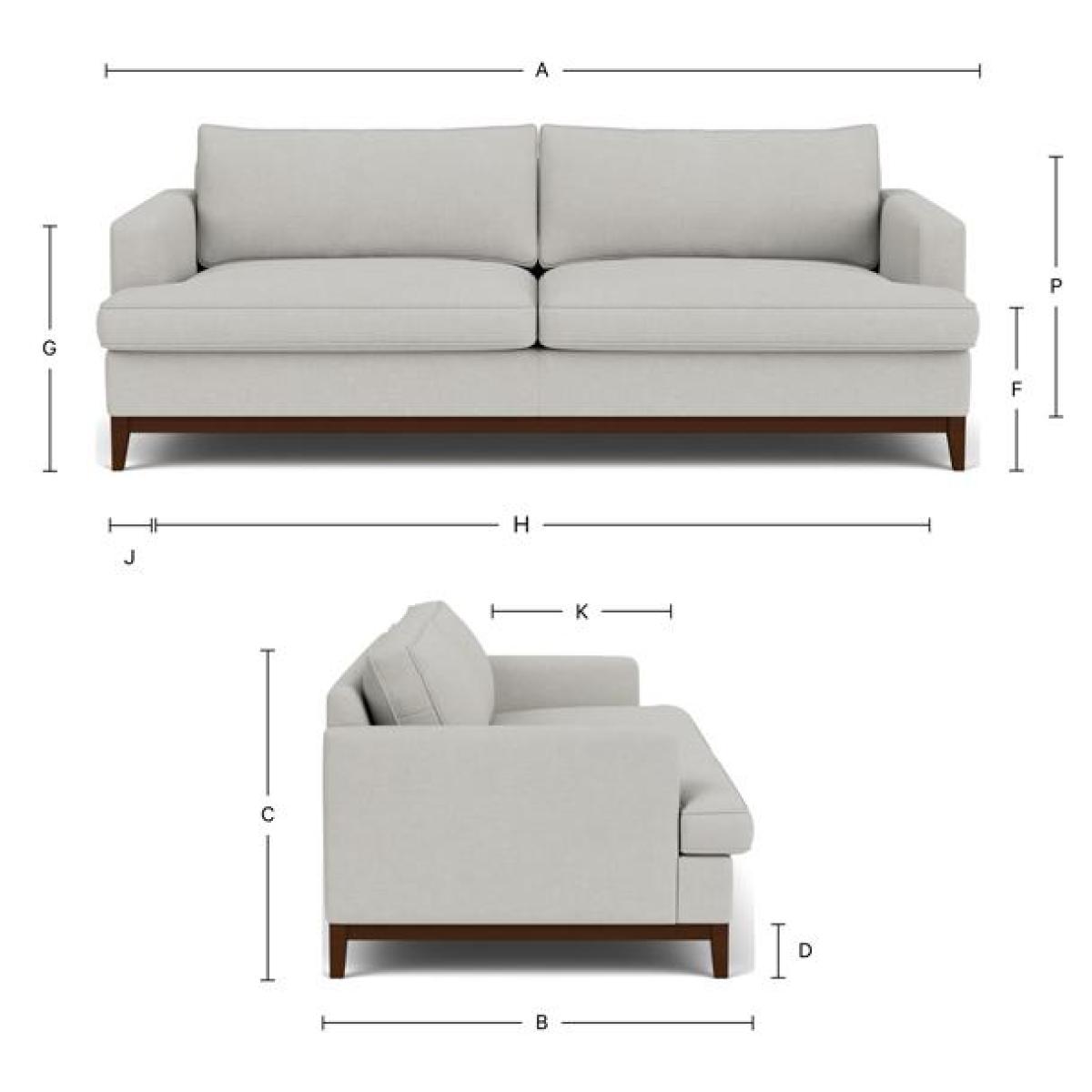 Settle into the Oakham Large sofa's sumptuous cushions and relax in the utmost style and comfort. Exuding elegant sophistication, this contemporary large sofa has an exposed plinth, square arms and wide cushions and is available in our extensive collection of over 170 luxury fabrics and leathers. Once you've chosen your perfect colour, find the plinth colour to match and watch it become the star of the show. All our sofas are handmade by expert craftspeople in the UK, using a combination of traditional skills, new technology and the finest materials. External (cm): - Width (A) = 212 - Depth (B) = 101 - Height (C) = 92 Seat (cm): - Width (H) = 186 - Depth (K) = 63 - Height (F) = 52 Arm (cm): - Width (J) = 15 - Height (G) = 69 Legs (cm): - Height (D) = 13 Frame Height (without Feet): - Height (P) = 63