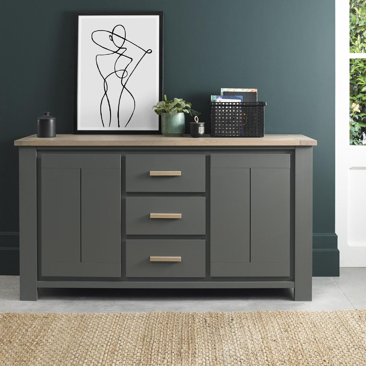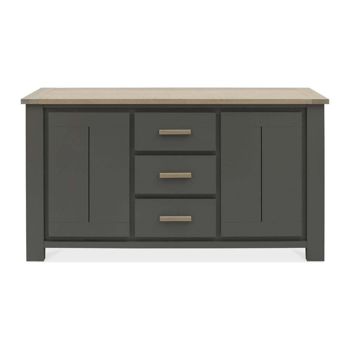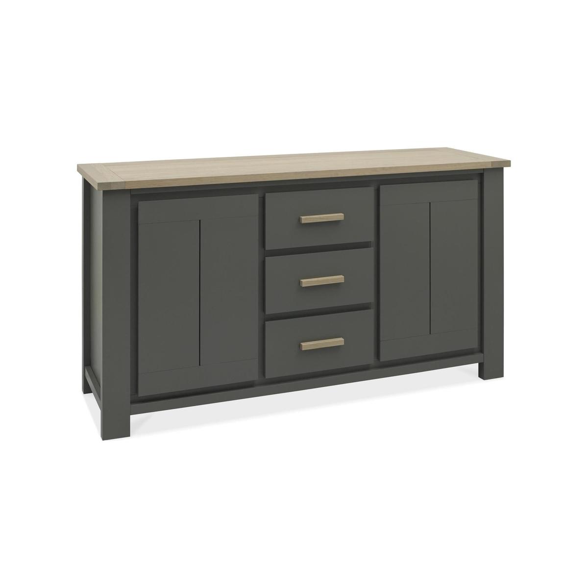 Oakham is a timeless collection that will fit seamlessly into both modern and traditional settings. Juxtaposing a fresh Scandinavian light oak finish on clean solid oak framed tops and veneer insets with a fashionable dark grey pigment on the carcasses, the Oakham dining range is sophisticated, strong and elegant. This sideboard is fitted with BLUM soft close runners for a superior customer experience.