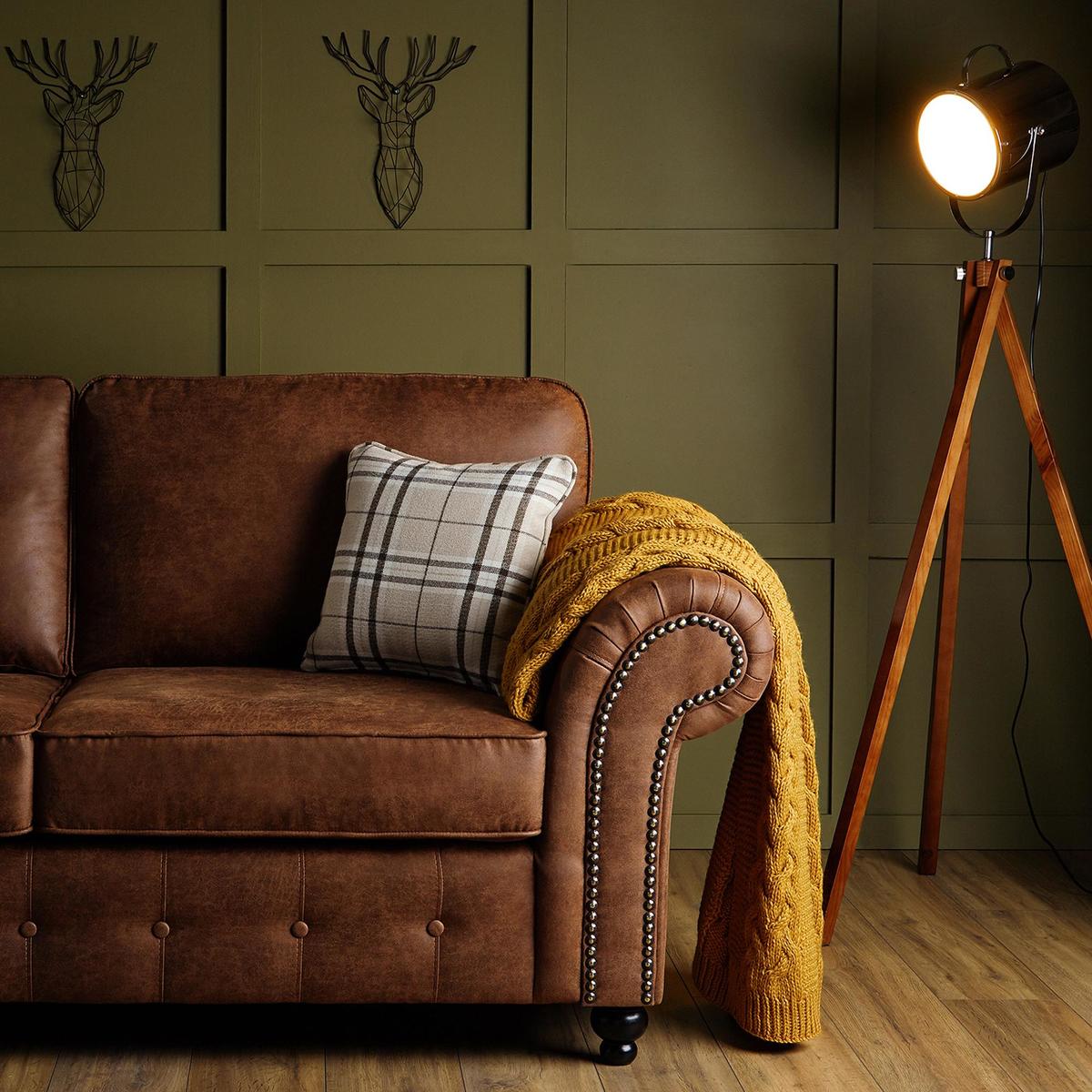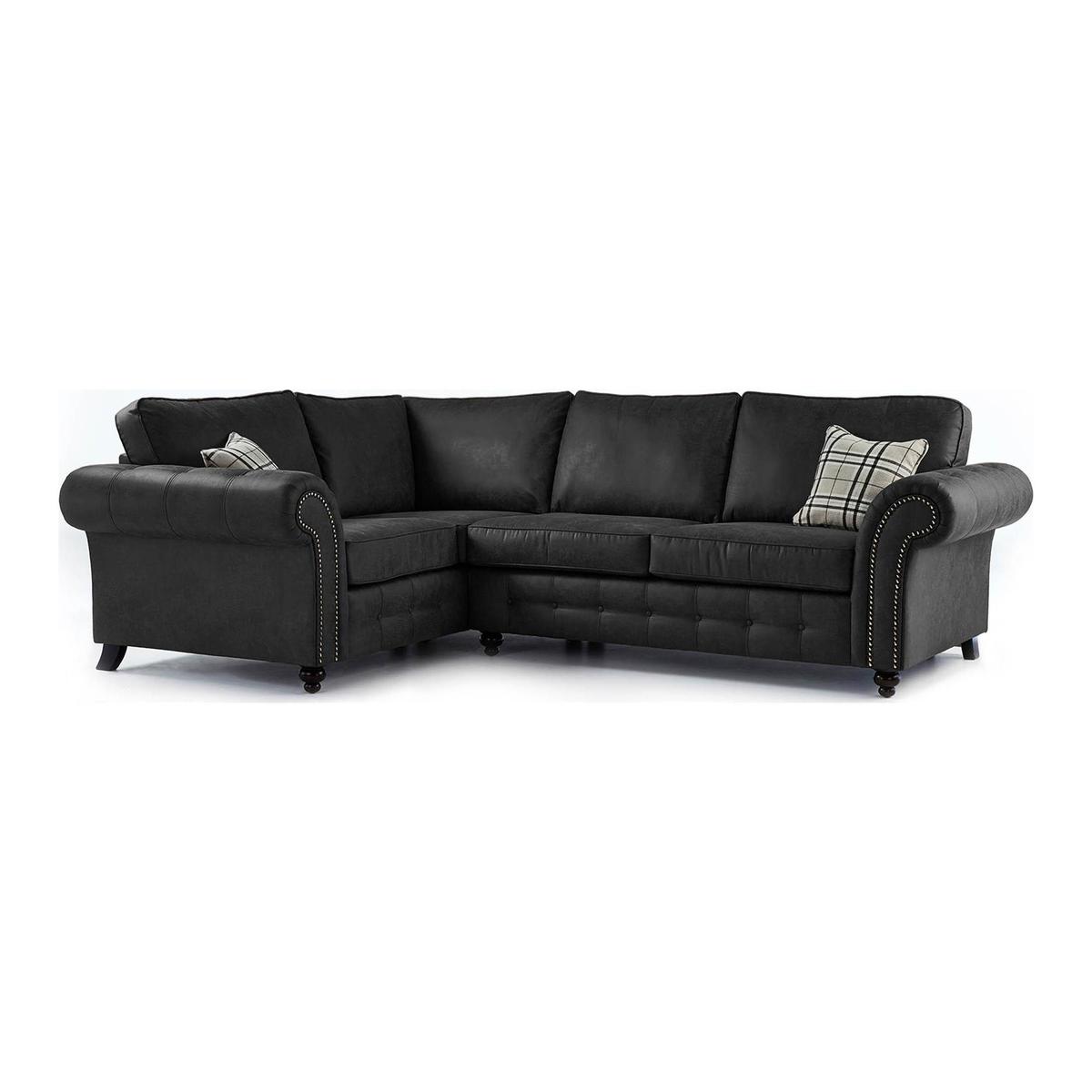 The Oakland Faux Leather Corner Sofa adds an elegant and luxurious touch to any living room. With soft to the touch faux leather upholstery available in two colours, this sofa features brass studding and button detailing along with sturdy wooden feet to add the perfect finishing touch.\n\nThe Oakland also boasts foam filled seat cushions, fibre filled back cushions and a sprung seat, making it as relaxing and comfortable as it is stylish.\n\nPlease note, unfortunately we cannot deliver this item to the Channel Islands.\n\n[Click here](https://www.dunelm.com/infodocs/downloads/Furniture-Sizing-Guide.pdf) to check out our handy sizing guide to help you find out if you’ll be able to get your new furniture into your home.