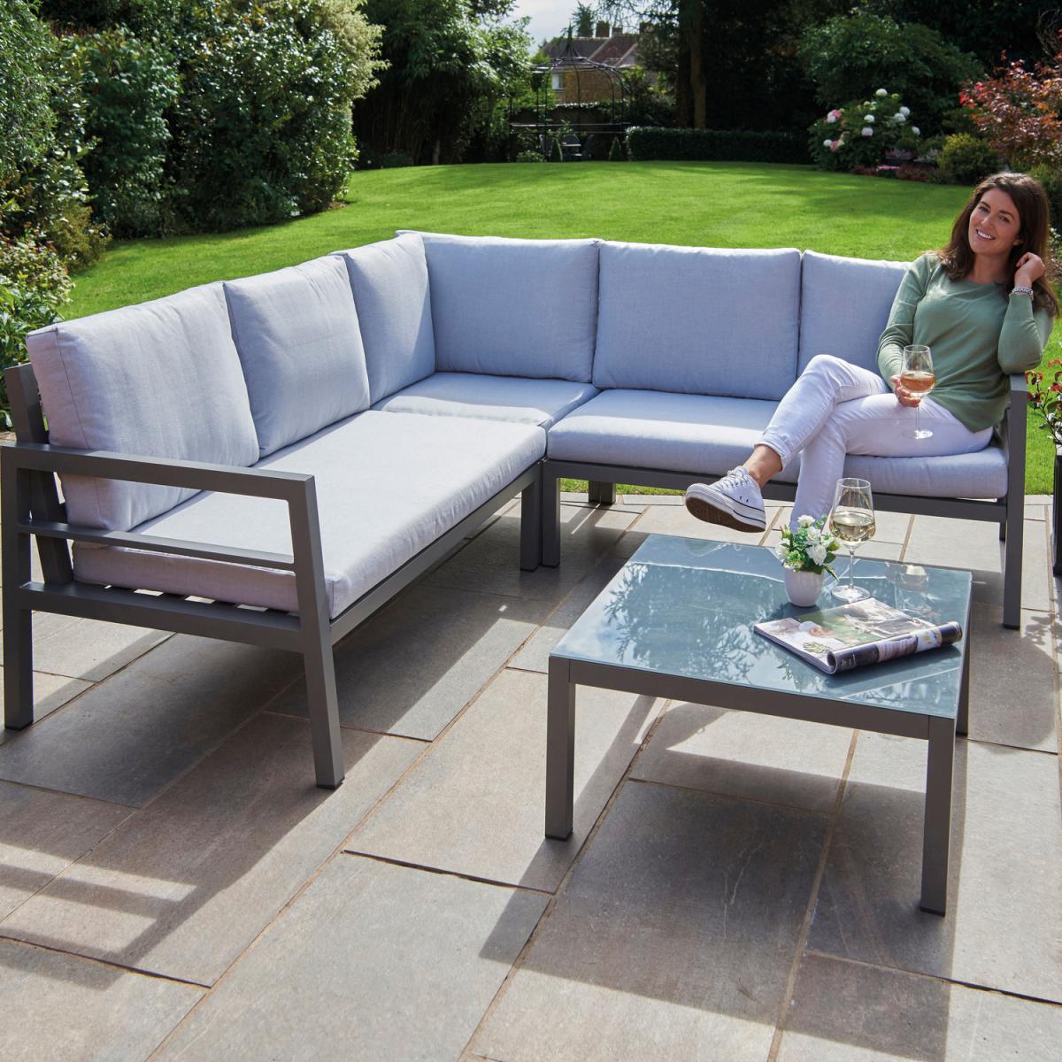 Our Oakley Corner Sofa Set is designed for relaxing in the garden or conservatory. This lounging suite is beautifully crafted and finished to a high standard and would be a superb addition to any indoor or outdoor location. Manufactured from sturdy aluminium box sections with a smooth painted grey finish, the furniture is light and easy to move. The sumptuous 100% polyester 8cm cushions ensure a high level of comfort. The overall size when assembled is 204cm x 204cm. The set is made up of two 2-seater Sofas, a corner chair, and a Coffee Table with a 5mm tempered smoked glass top. The set is weatherproof and will keep its good looks year after year. The cushions should be taken in during wet weather periods and have removable covers for cleaning if required. This suite requires minimal assembly and needs little maintenance. A simple clean with soapy water and a non-abrasive cleaner will keep this lovely garden set in peak condition.