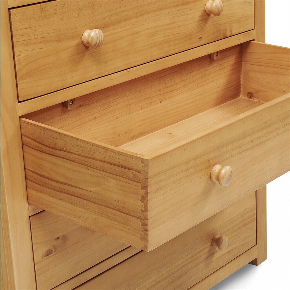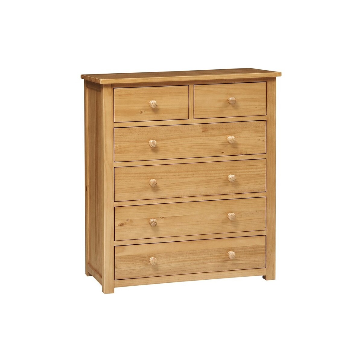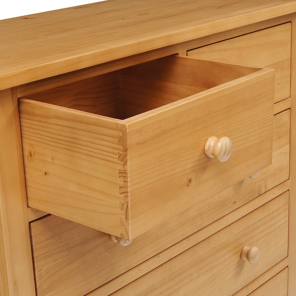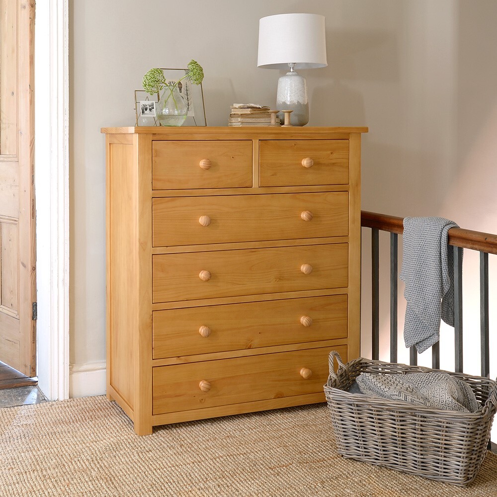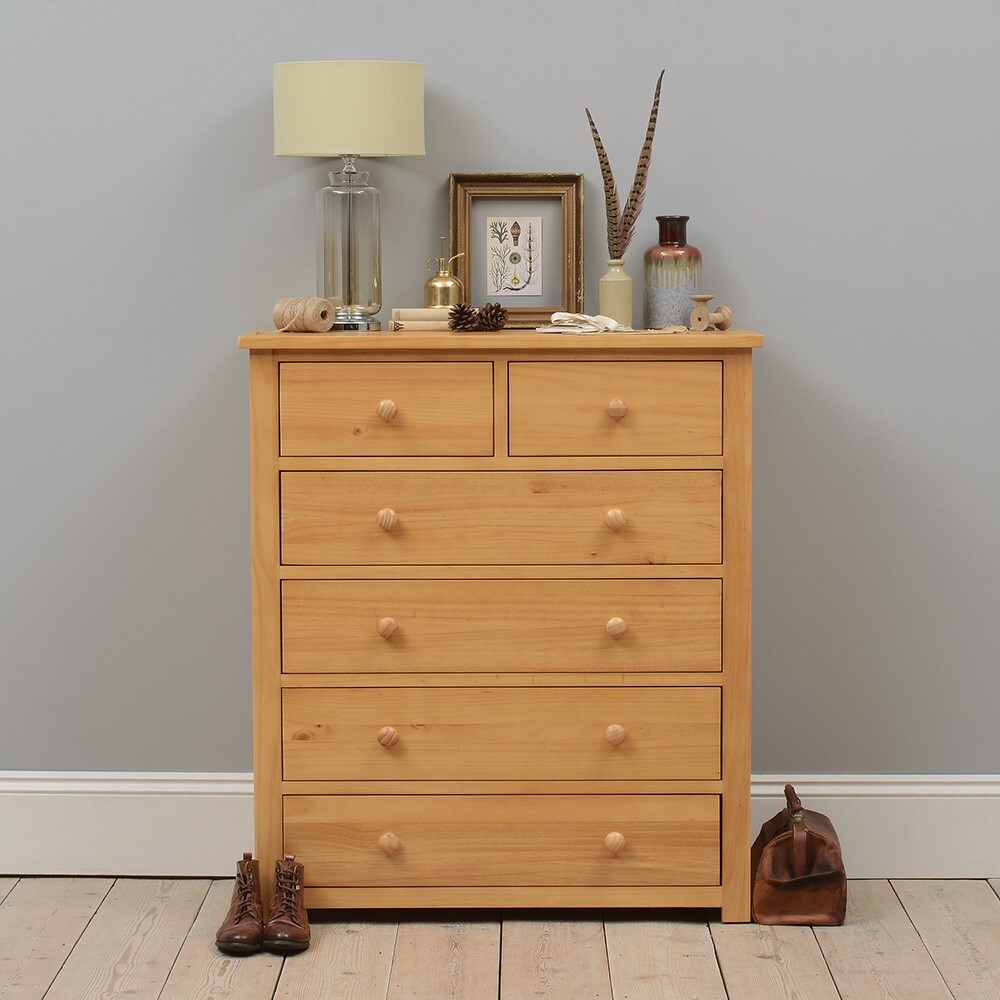 Unfussy elegance combined with a sturdy build makes this gorgeous chest of drawers the perfect choice for your bedroom whatever the décor. Constructed from solid pine and finished with a rustic wax to give areas a darker mellow tone, the ample surface will provide space for photos or ornaments, and its six dovetailed drawers will swallow up plenty of clothes leaving you with no excuse for clutter. Simple pine knobs add rustic charm and a tongue and groove back panel gives it strength and durability. Finished with a protective light wax to bring out the grain and show off the warm, natural beauty of the wood.