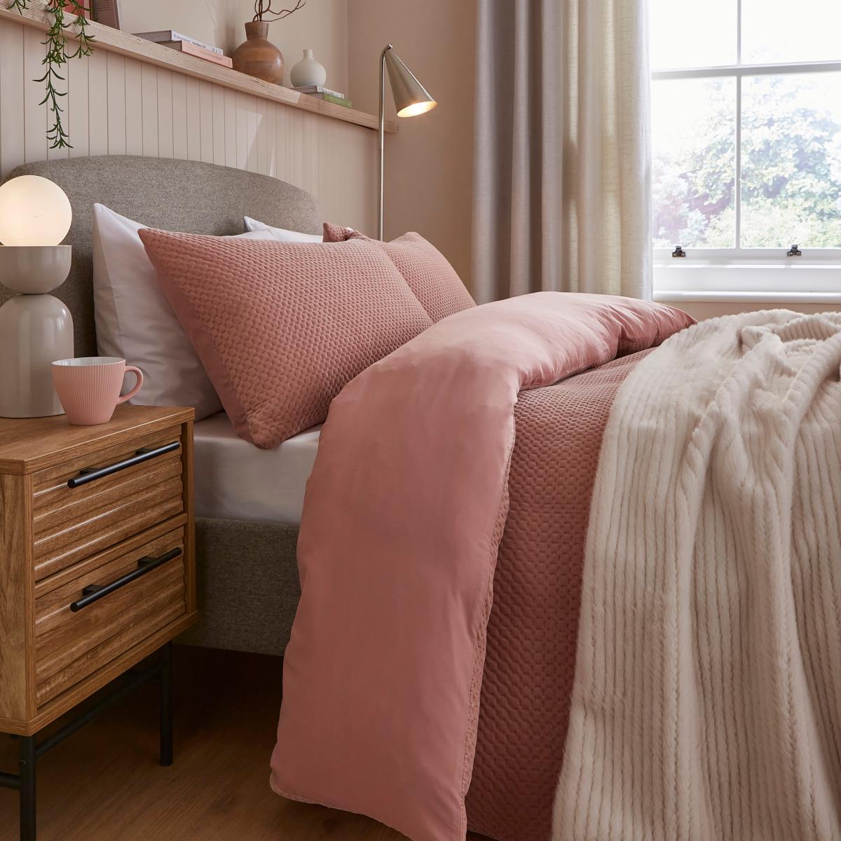 I love the Oakley Pinsonic duvet set in blush for its subtle texture and muted tone, making it a versatile choice for both modern and classic interiors. It works especially well in bedrooms with neutral or pastel colour schemes, adding a soft, welcoming touch without overpowering the space. Practical styling tips include pairing it with crisp white or light grey bedding layers for a layered look, or introducing natural textures like linen or woven throws for added dimension. It’s perfect for creating a calm, cosy sanctuary, and its understated elegance makes it easy to update with accessories like throw cushions or curtains in complementary colours.