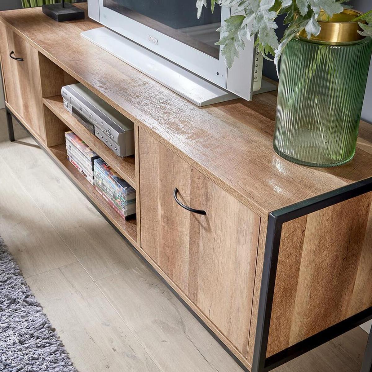 Ransform your living space with this TV unit. The perfect home for your TV to sit on, this chic unit not only looks stylish but provides ample storage space too. There are two cupboards plus two open shelves, ideal for keeping any technological equipment safe. The weathered oak look finish and sleek black metal legs add a sophisticated vibe. A great addition to any home.