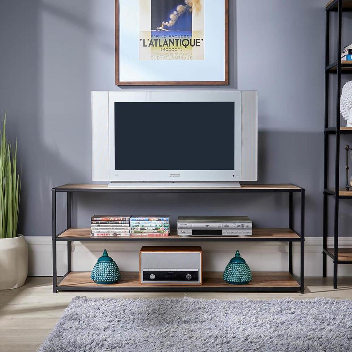 I’m a fan of this Oakmere-style industrial TV stand because its black metal frame and natural timber shelves bring a clean, utilitarian look without feeling too heavy. It suits urban lofts, Scandi-inspired living rooms or modern farmhouse schemes and pairs well with neutral walls and exposed brick. For styling, keep cables neat by using discreet clips or baskets on the lower shelf. Mix in low-profile box sets or vinyl crates alongside a couple of potted succulents to soften the metal lines. If you need extra storage, add matching rattan or wire baskets on the bottom shelf to corral remotes and game controllers.