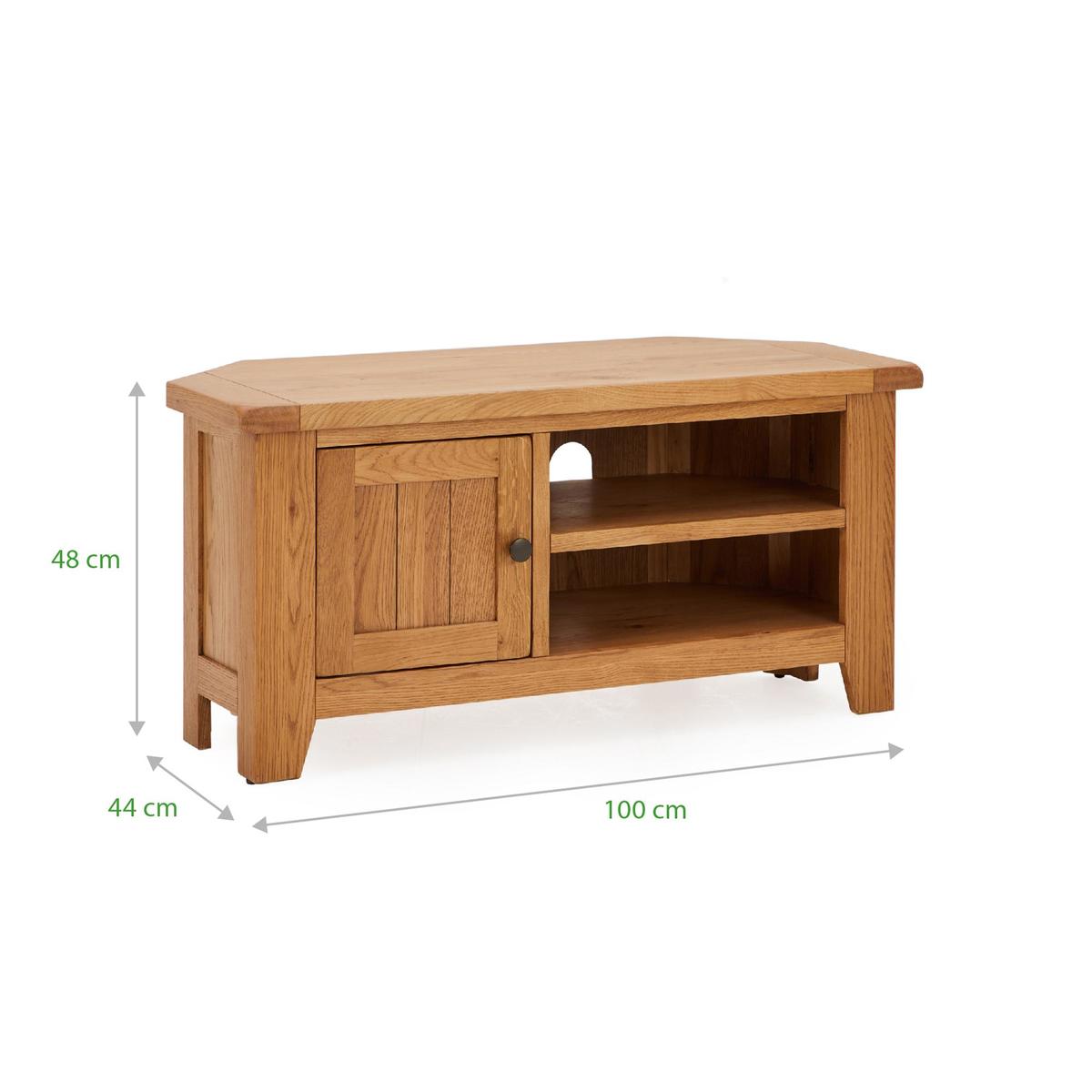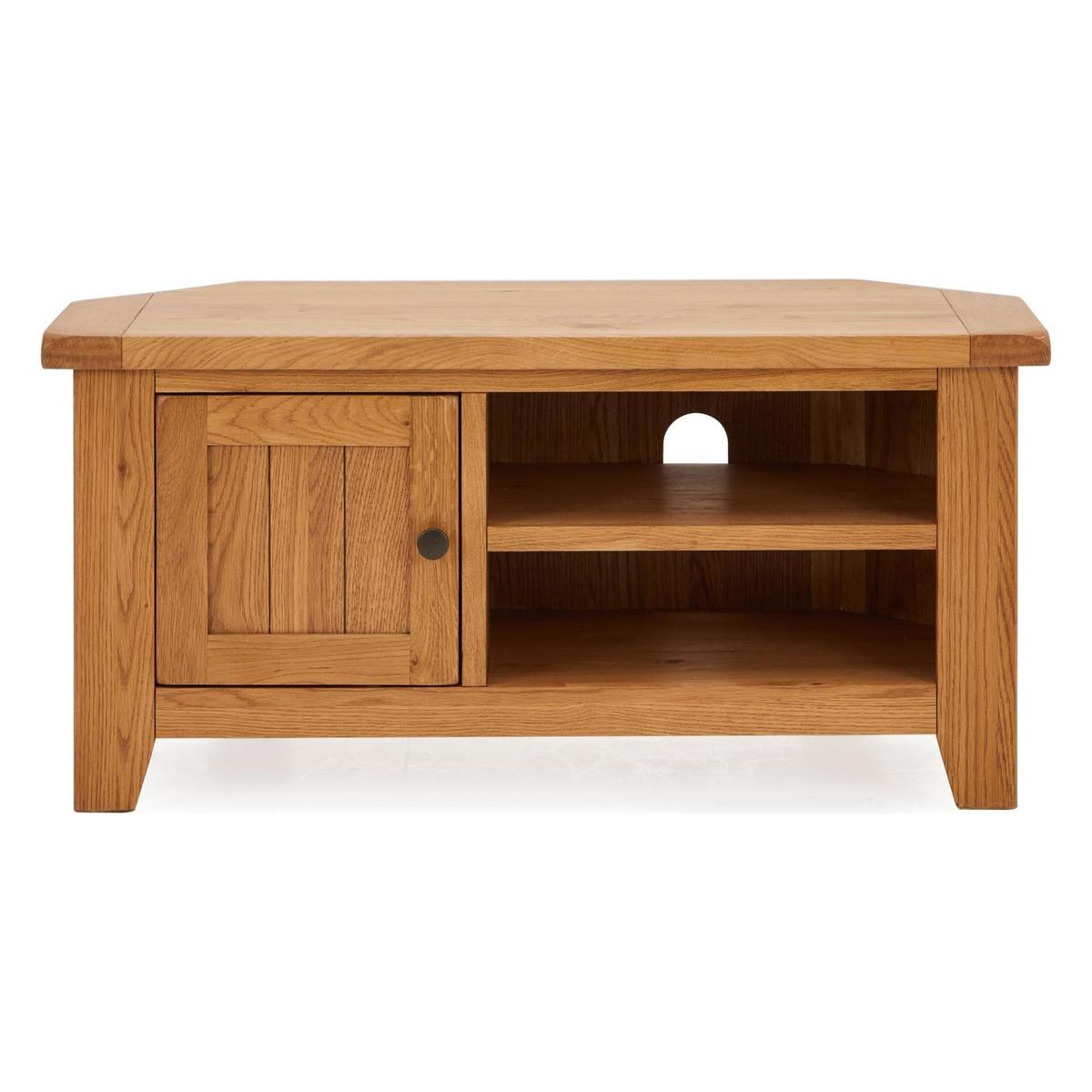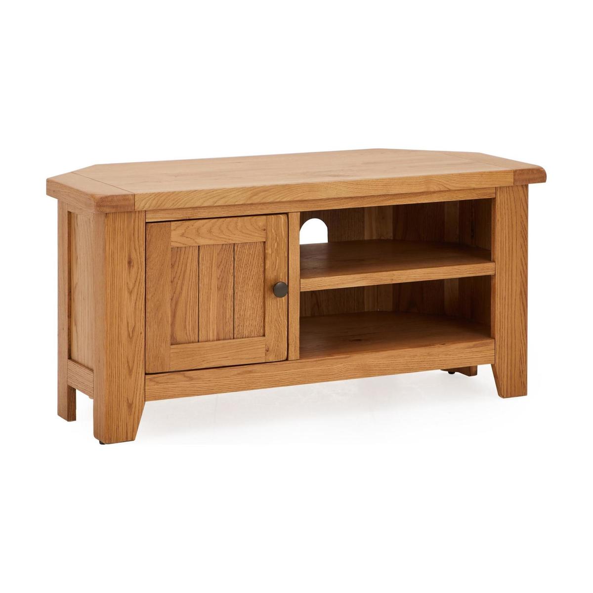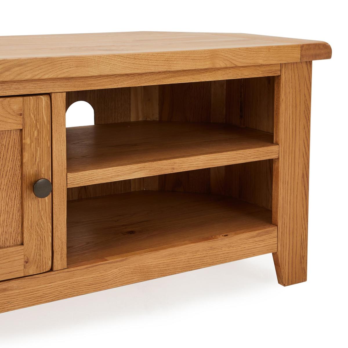 Dunelm Exclusive - Designed and Developed by Dunelm Crafted from solid oak and oak veneer, the timeless Oakville range is built to last and is perfect for busy households. Complete with a waxed finish to enhance and showcase its natural grain, this traditional furniture range features smooth, rounded corners and stunning antique style handles. Offering ample storage space, the Oakville corner TV stand comes fully assembled and features a spacious cupboard and two open shelves, complete with individual cable apertures.