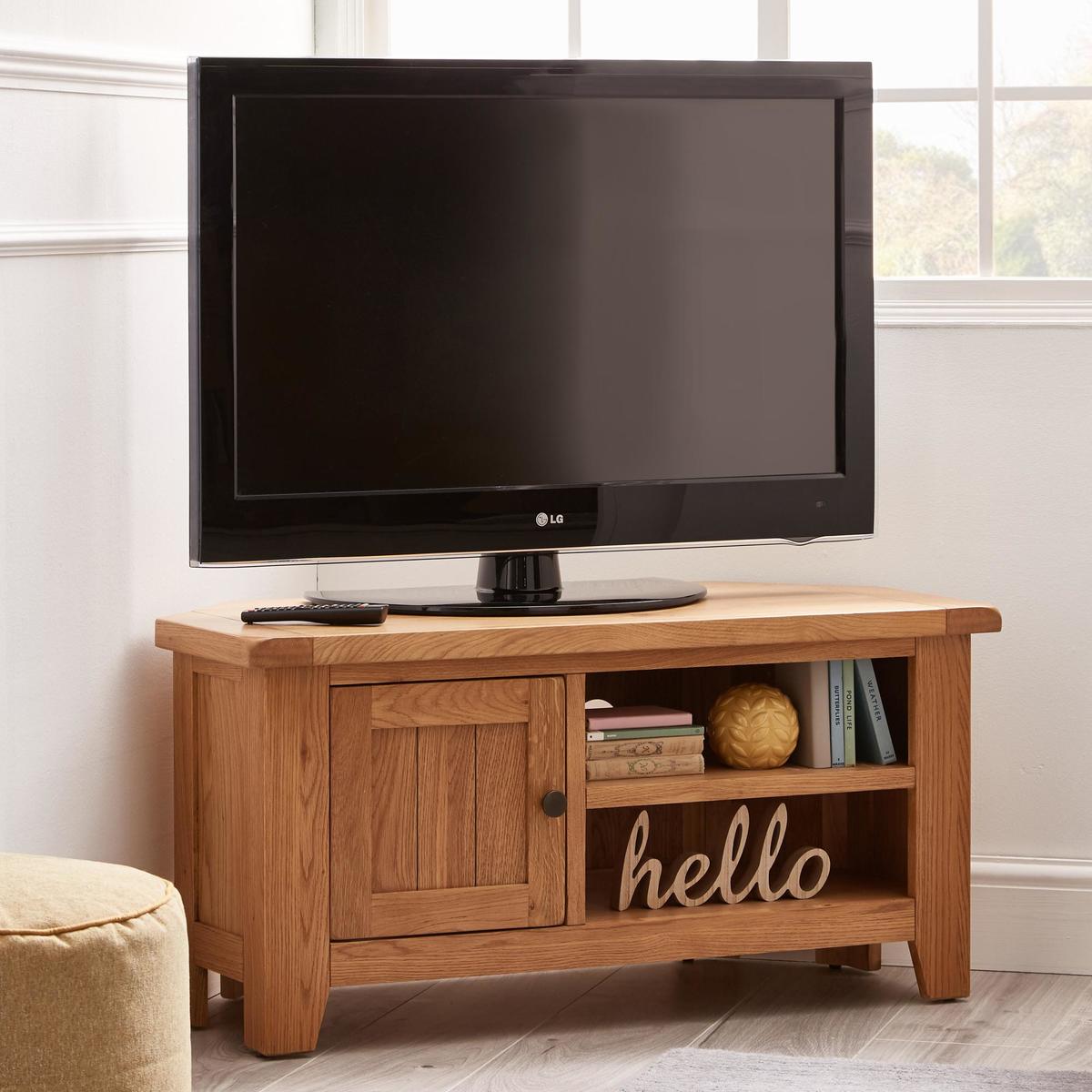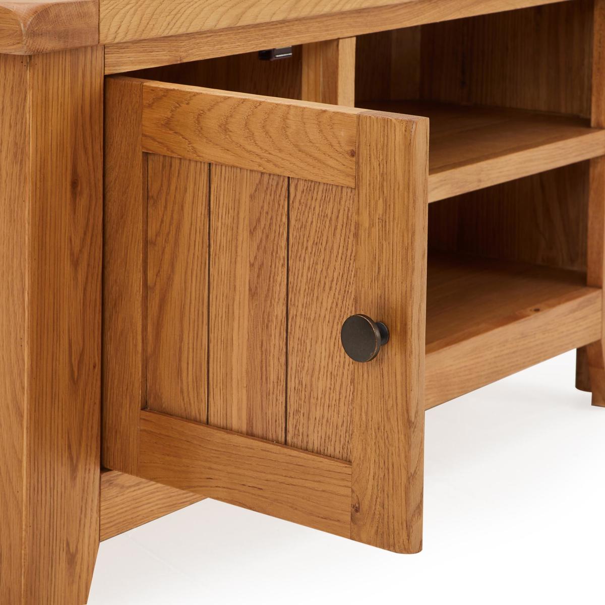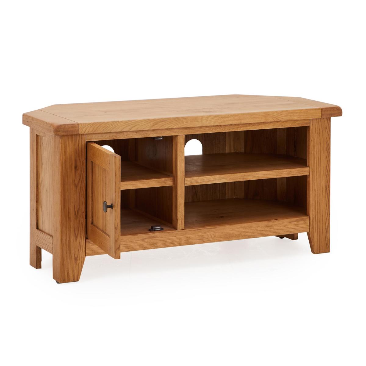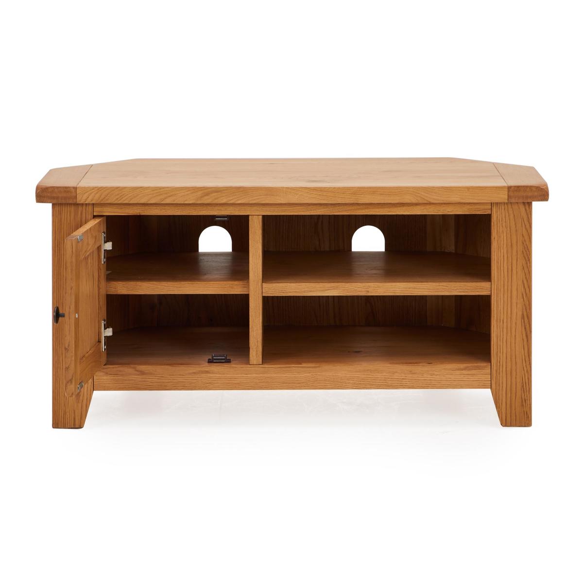 Dunelm Exclusive - Designed and Developed by Dunelm Crafted from solid oak and oak veneer, the timeless Oakville range is built to last and is perfect for busy households. Complete with a waxed finish to enhance and showcase its natural grain, this traditional furniture range features smooth, rounded corners and stunning antique style handles. Offering ample storage space, the Oakville corner TV stand comes fully assembled and features a spacious cupboard and two open shelves, complete with individual cable apertures.