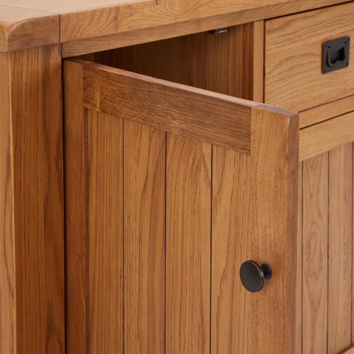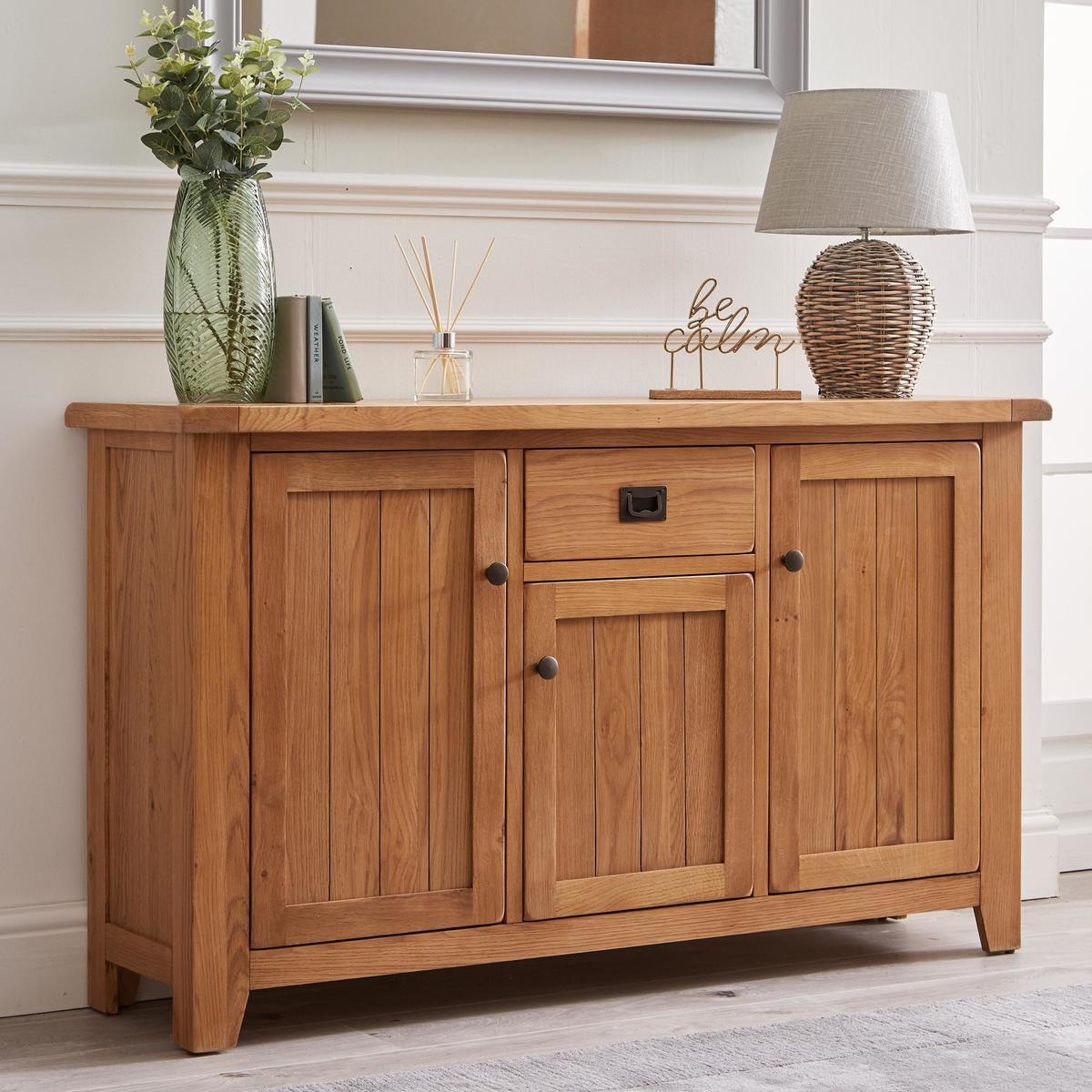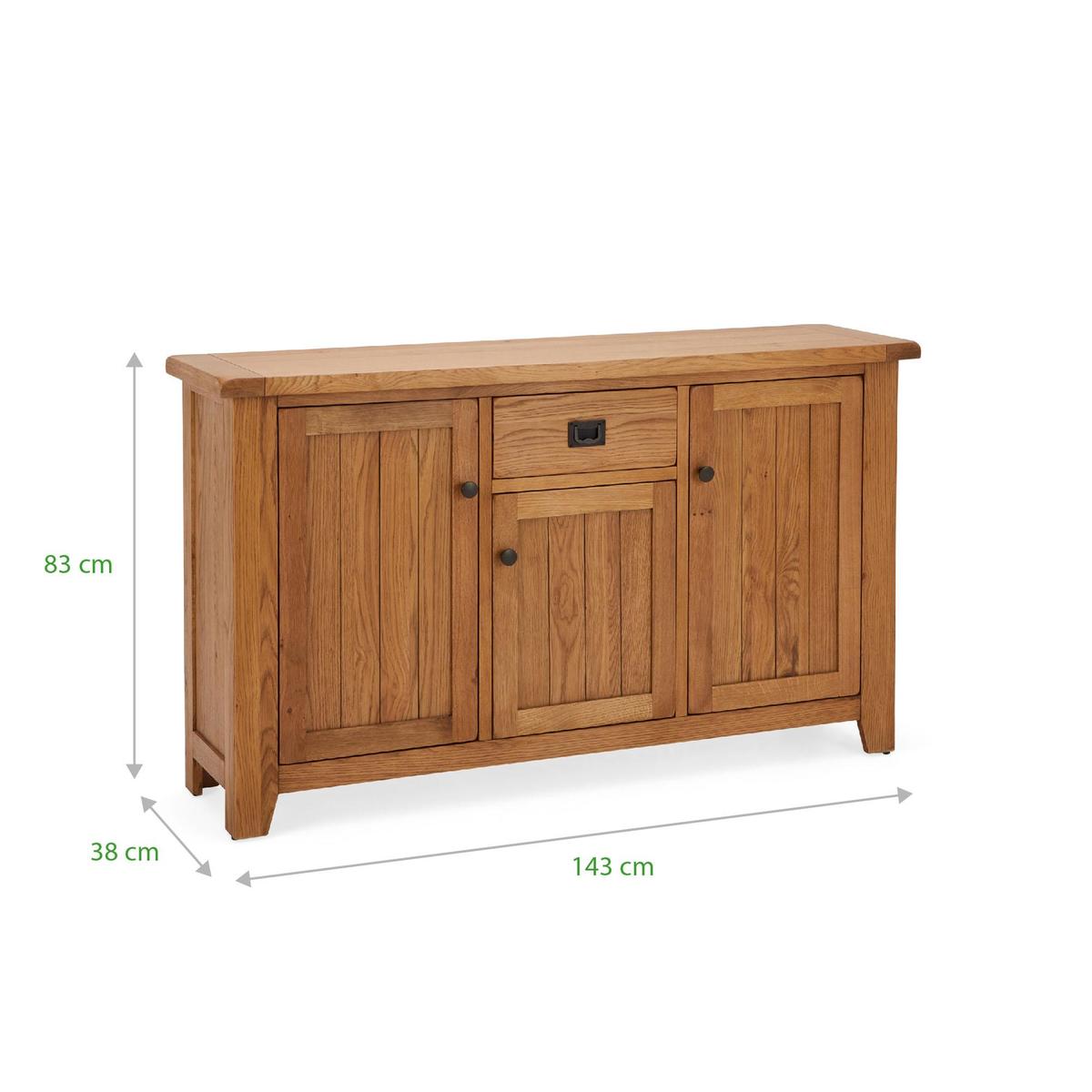 Dunelm Exclusive - Designed and Developed by Dunelm. Crafted from solid oak and oak veneer, the timeless Oakville range is built to last and is perfect for busy households. Complete with a waxed finish to enhance and showcase its natural grain, this traditional furniture range features smooth, rounded corners and stunning antique style handles. Providing ample storage space, the fully assembled Oakville large sideboard comes with a large single drawer, two large cupboards and one smaller cupboard. Care Instructions: Wipe carefully with a clean, dry cloth to remove dust and maintain the furniture. Avoid common hazards such as harsh solvents or abrasives as this can damage the furniture. Mop up any spills with a dry cloth. Avoid exposure to direct sunlight or extreme conditions and avoid putting your furniture near heating sources or in highly air-conditioned spaces.