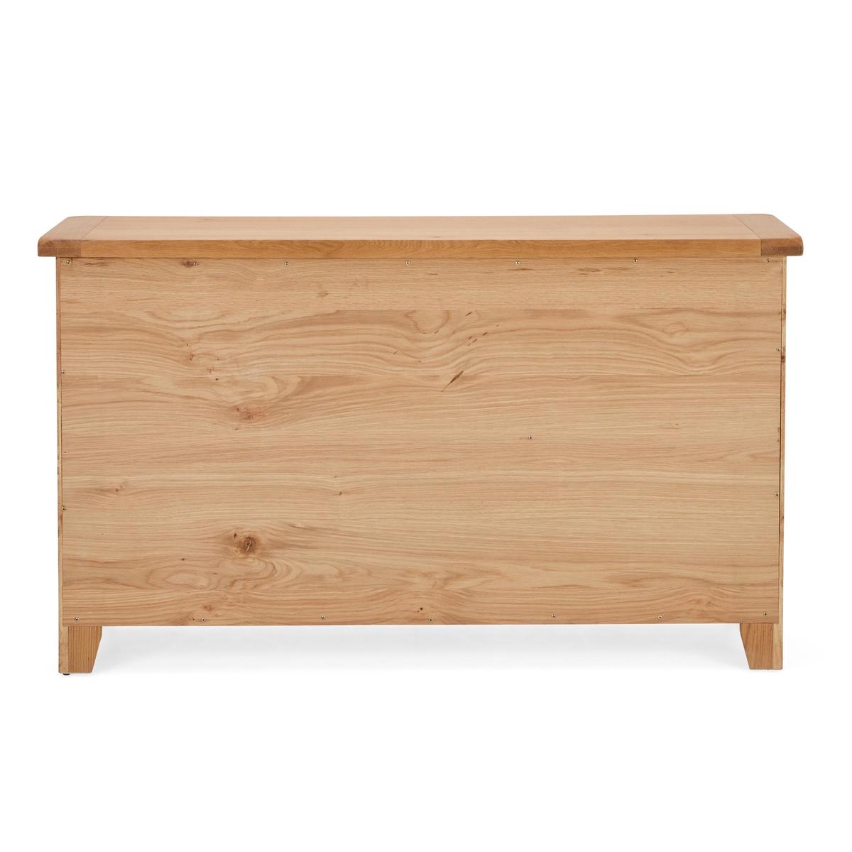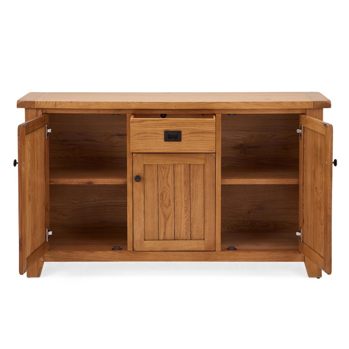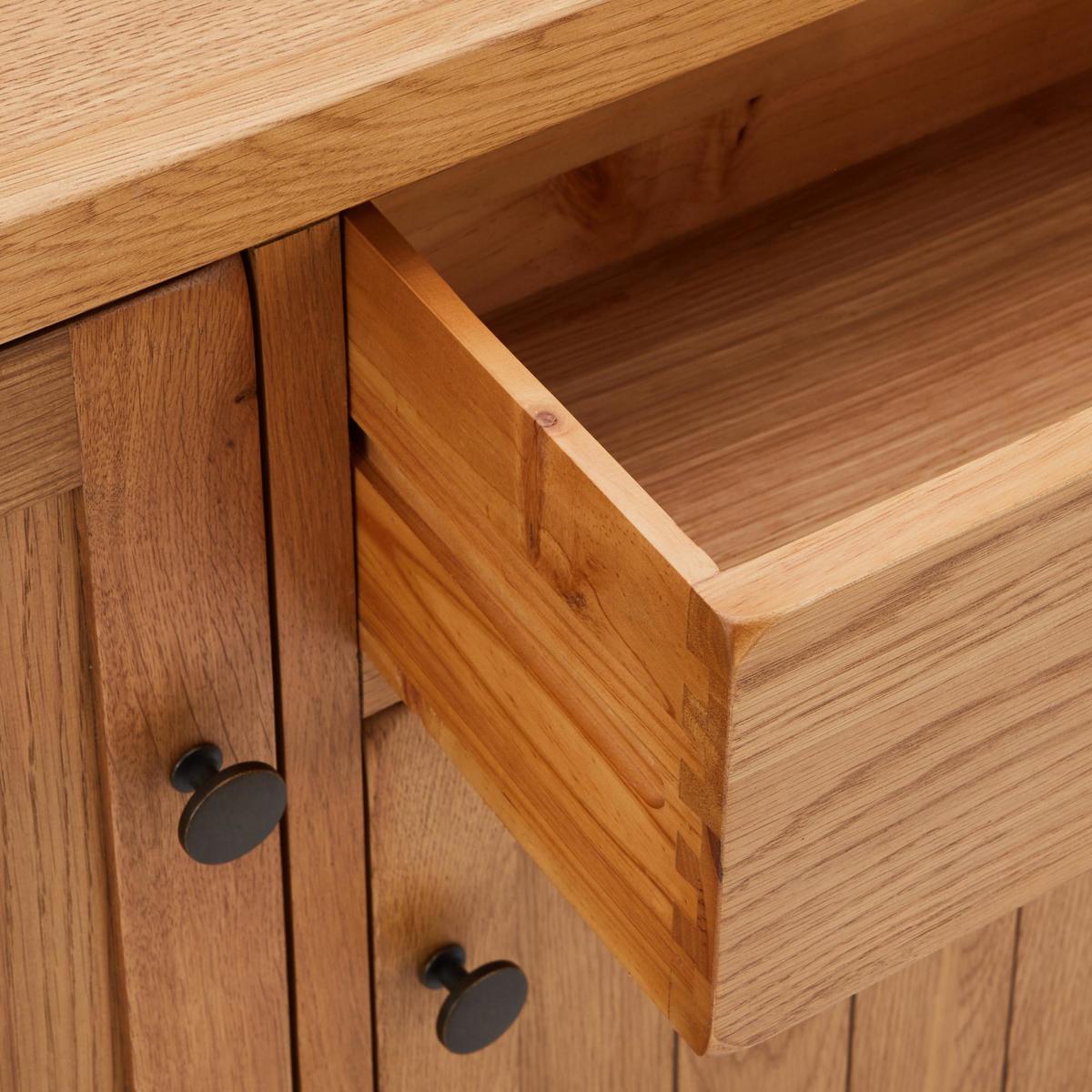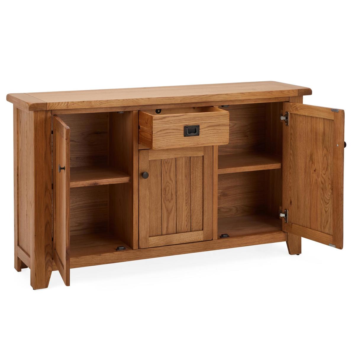Dunelm Exclusive - Designed and Developed by Dunelm. Crafted from solid oak and oak veneer, the timeless Oakville range is built to last and is perfect for busy households. Complete with a waxed finish to enhance and showcase its natural grain, this traditional furniture range features smooth, rounded corners and stunning antique style handles. Providing ample storage space, the fully assembled Oakville large sideboard comes with a large single drawer, two large cupboards and one smaller cupboard. Care Instructions: Wipe carefully with a clean, dry cloth to remove dust and maintain the furniture. Avoid common hazards such as harsh solvents or abrasives as this can damage the furniture. Mop up any spills with a dry cloth. Avoid exposure to direct sunlight or extreme conditions and avoid putting your furniture near heating sources or in highly air-conditioned spaces.